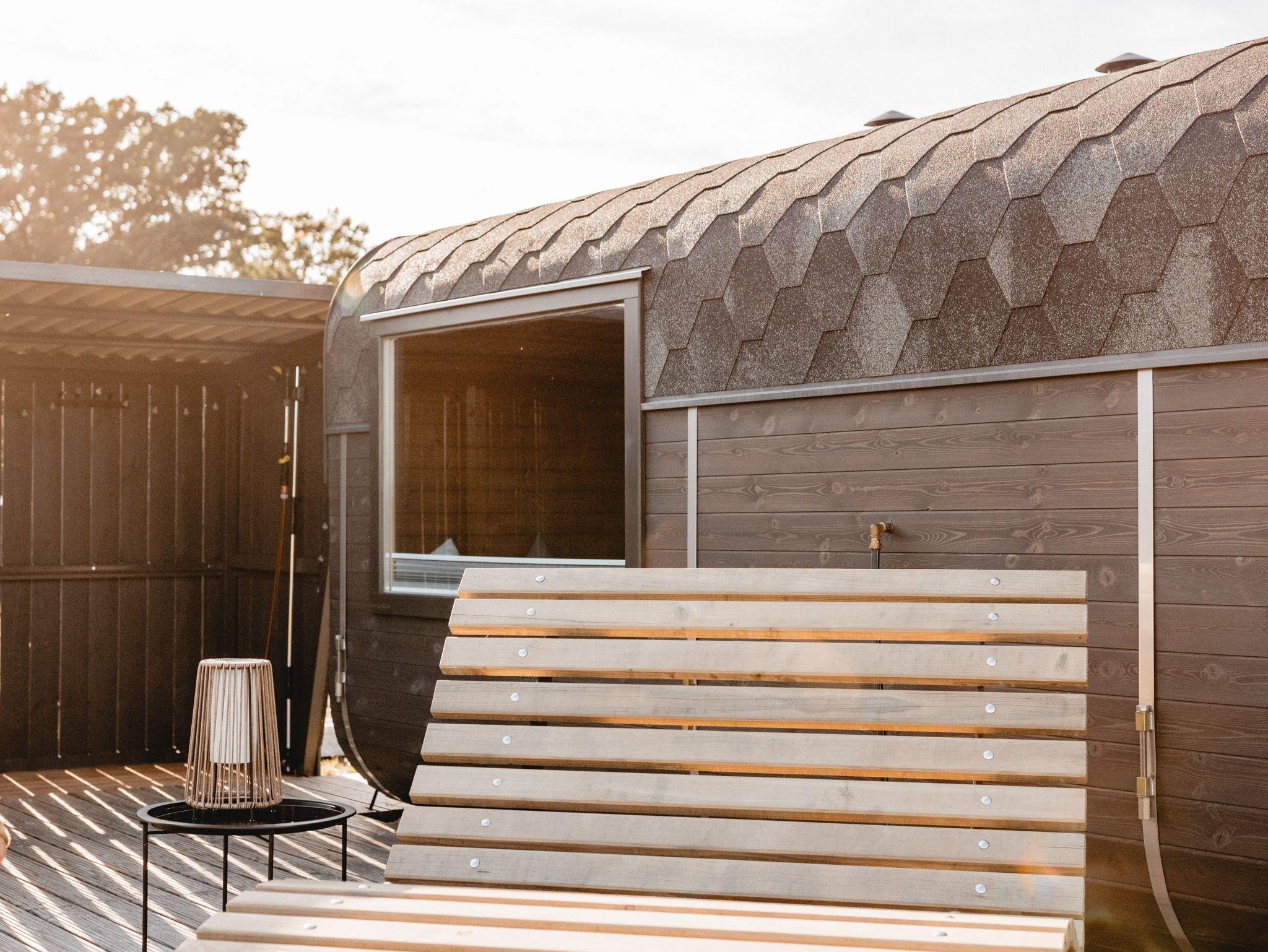 Wer richtig entspannen möchte, gönnt sich eine persönliche Auszeit in unserem Panorama-Saunafass. Dort stehen zwei Wellenliegen mit direktem Blick auf unsere Wiesen und Felder bereit. Außerdem gibt es innen eine Dusche und einen großzügigen Ruhebereicht sowie außen eine Terrasse mit Himmelsliege.