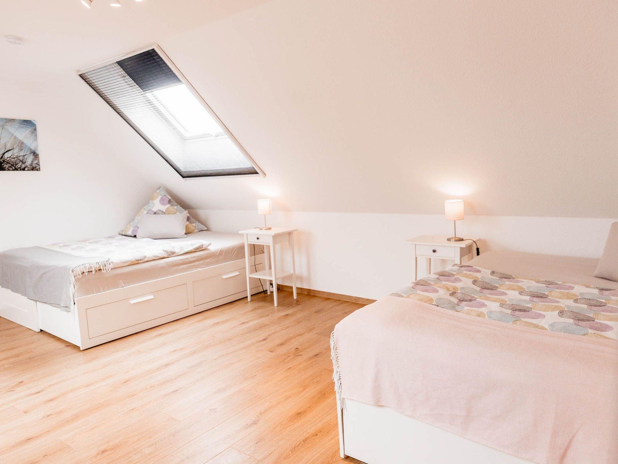 Die Wohnung Wörpe befindet sich im OG unseres Haupthauses und bietet auf 80 qm Platz für bis zu sechs Personen. Aufgeteilt ist die Wohnung in zwei Schlafzimmer (1 SZ mit Doppelbett und 1 SZ mit zwei Einzelbetten, die sich jeweils zu einem vollständigen Doppelbett ausziehen lassen), einem großen Wohn/Essbereich mit komplett ausgestatteter Küchenzeile, einem Bad mit Tageslicht und einem Abstellraum.