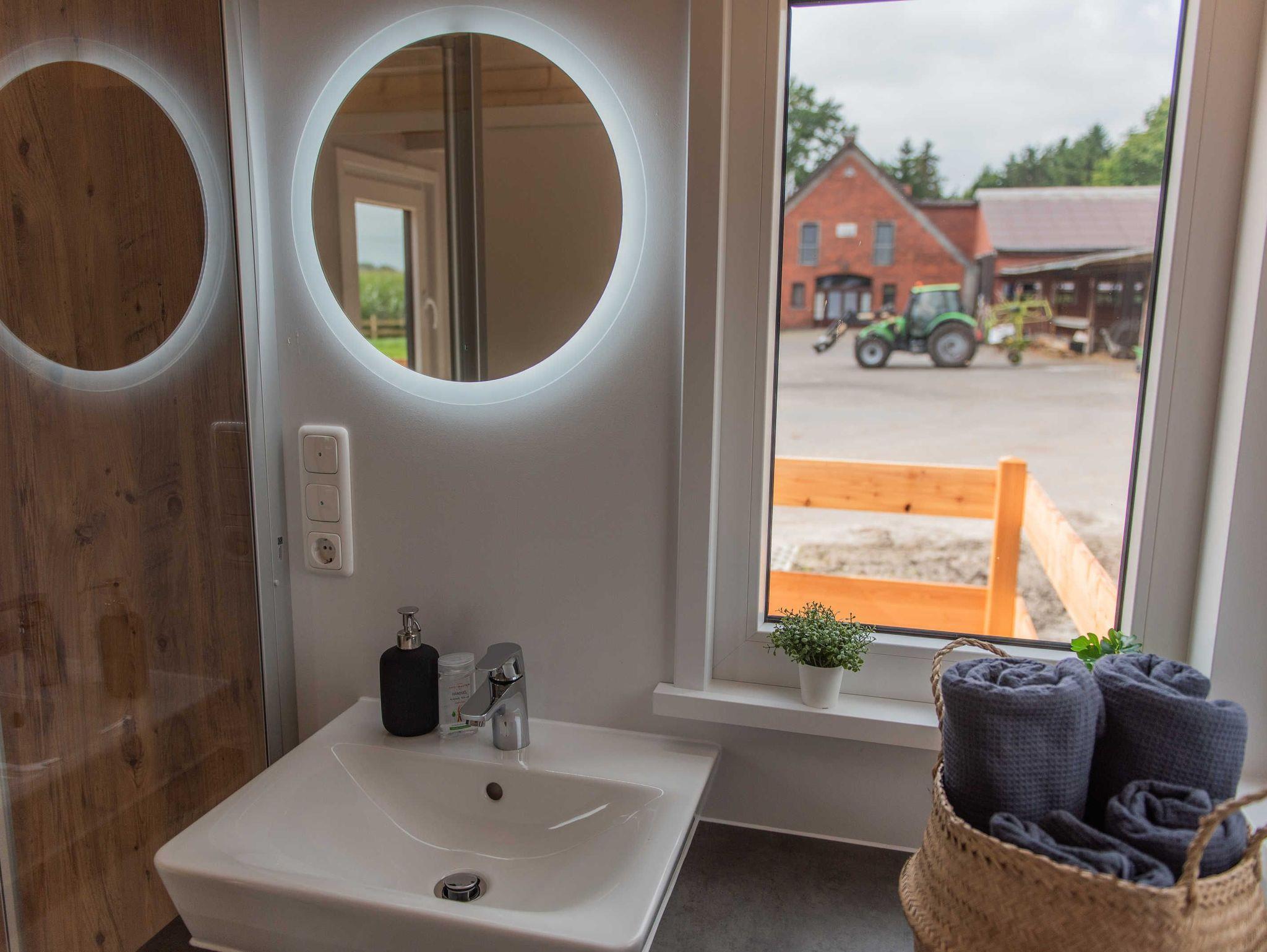 Wer richtig entspannen möchte, gönnt sich eine persönliche Auszeit in unserem Panorama-Saunafass. Dort stehen zwei Wellenliegen mit direktem Blick auf unsere Wiesen und Felder bereit. Außerdem gibt es innen eine Dusche und einen großzügigen Ruhebereicht sowie außen eine Terrasse mit Himmelsliege.