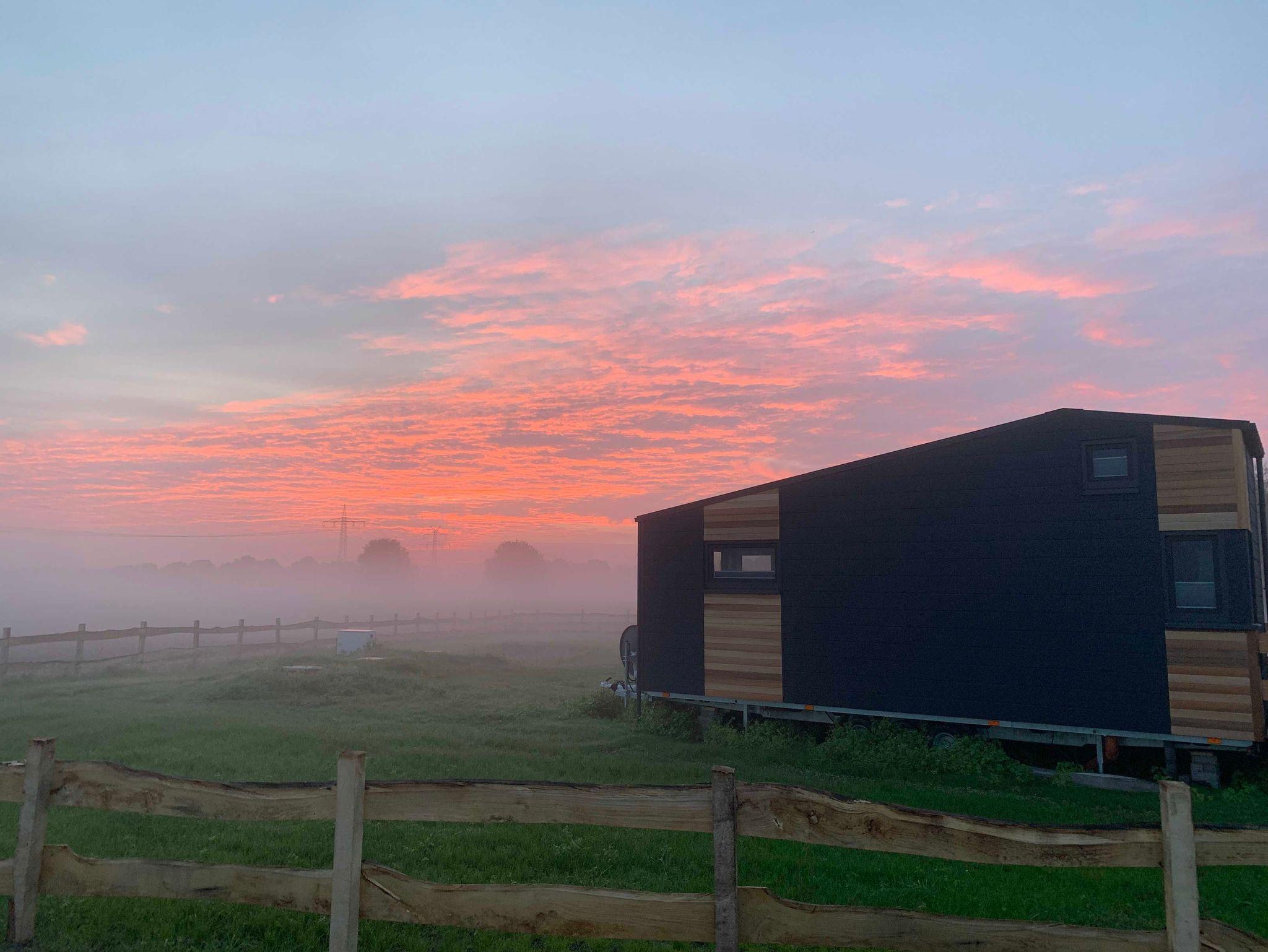 Modern und komfortabel ist unser ganz neues Tiny-Haus und bietet auf 23 qm Platz für bis zu vier Personen. Unten gibt es eine komplett ausgestattete Küchenzeile mit Herd und Kühlschrank, eine bequeme Schlafcouch (1,40 cm) und ein Bad mit Dusche und WC. Über eine Treppe errreicht man die gemütliche Schlafempore.