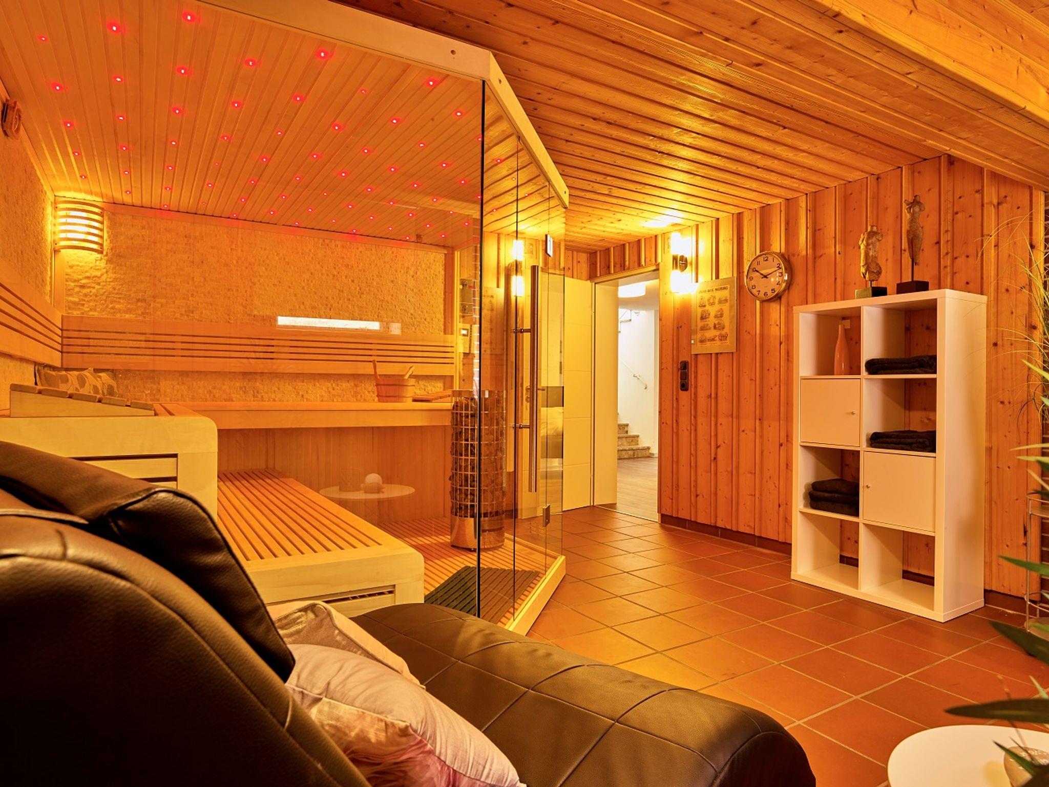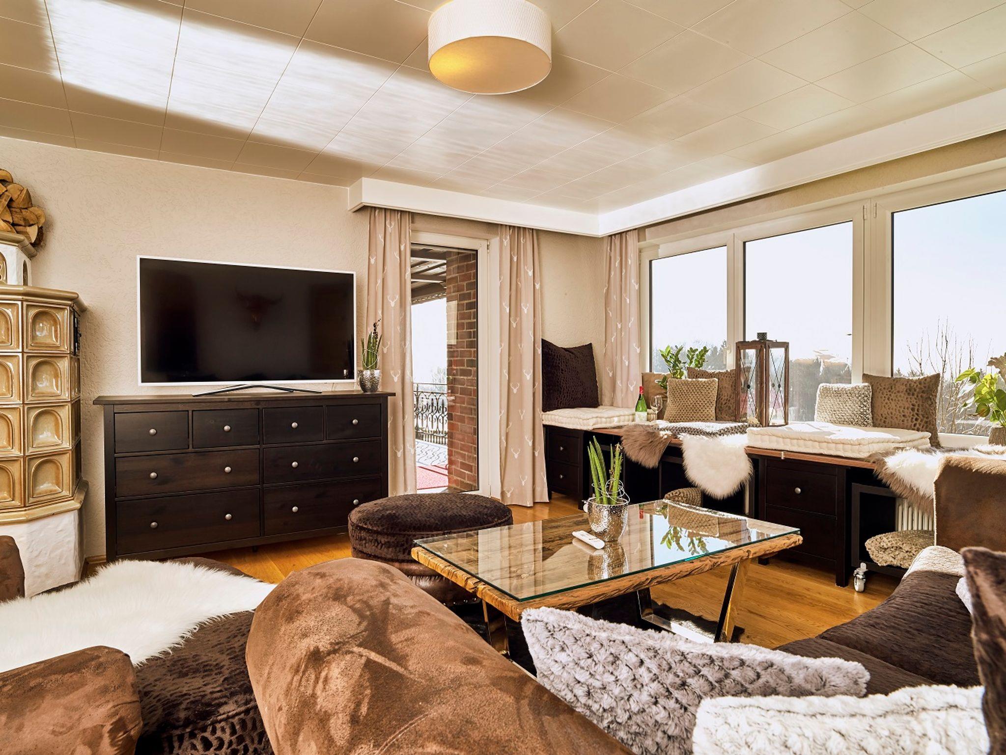 Entspannen Sie nach dem Saunabesuch im Wintergarten oder am Panoramafenster mit Lesebank im Wohnzimmer!