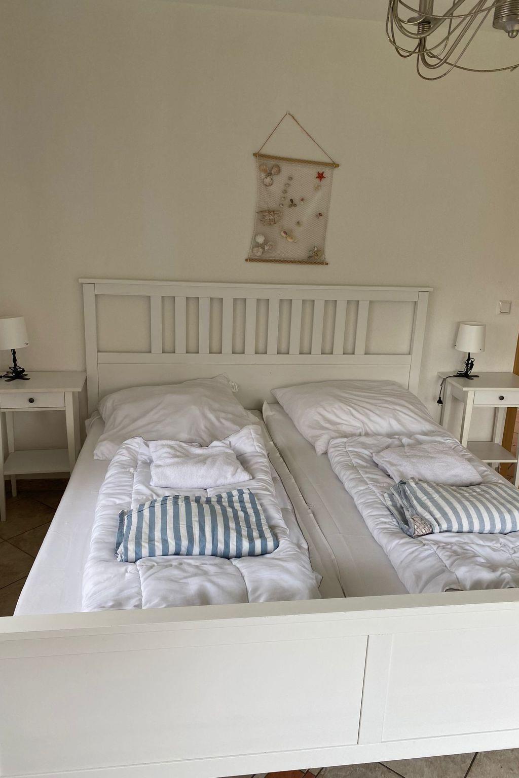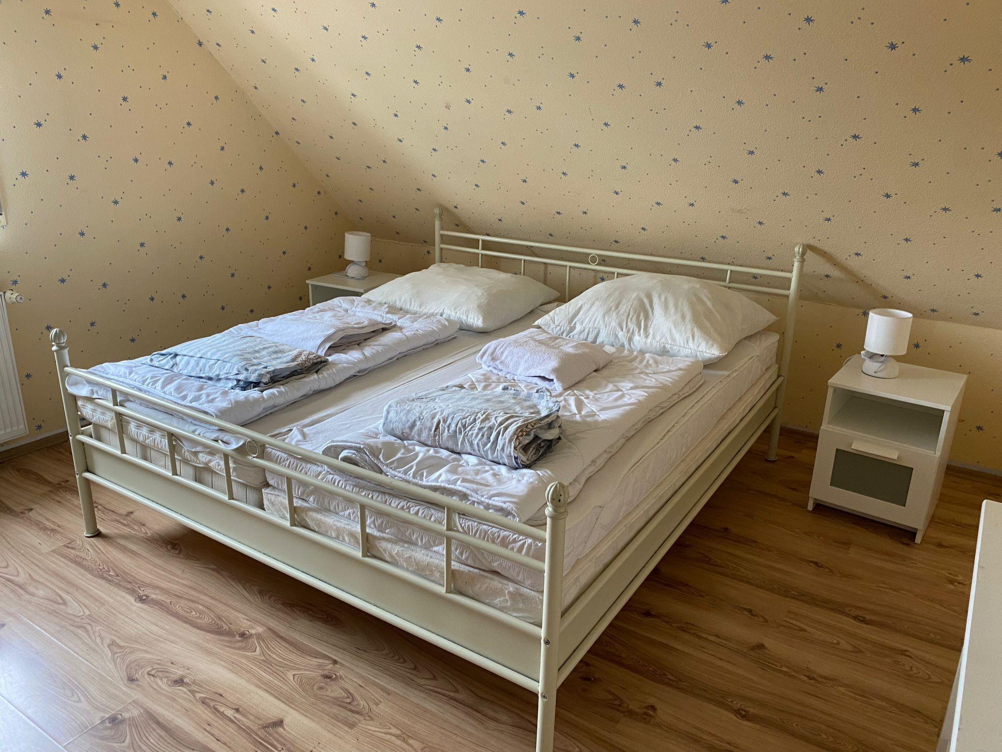 On the ground floor there is a bathroom with shower/WC, a bedroom with double bed and a room with washing machine, tumble dryer and freezer. On the upper floor there are a further 3 bedrooms with double beds. One of these bedrooms has an IKEA Brimnes pull-out bed for a maximum of 2 people next to the double bed. A further bathroom with bath, shower, WC and 2 washbasins.