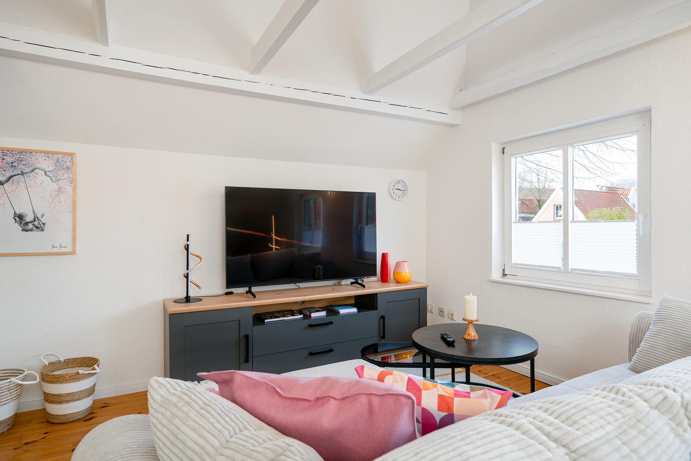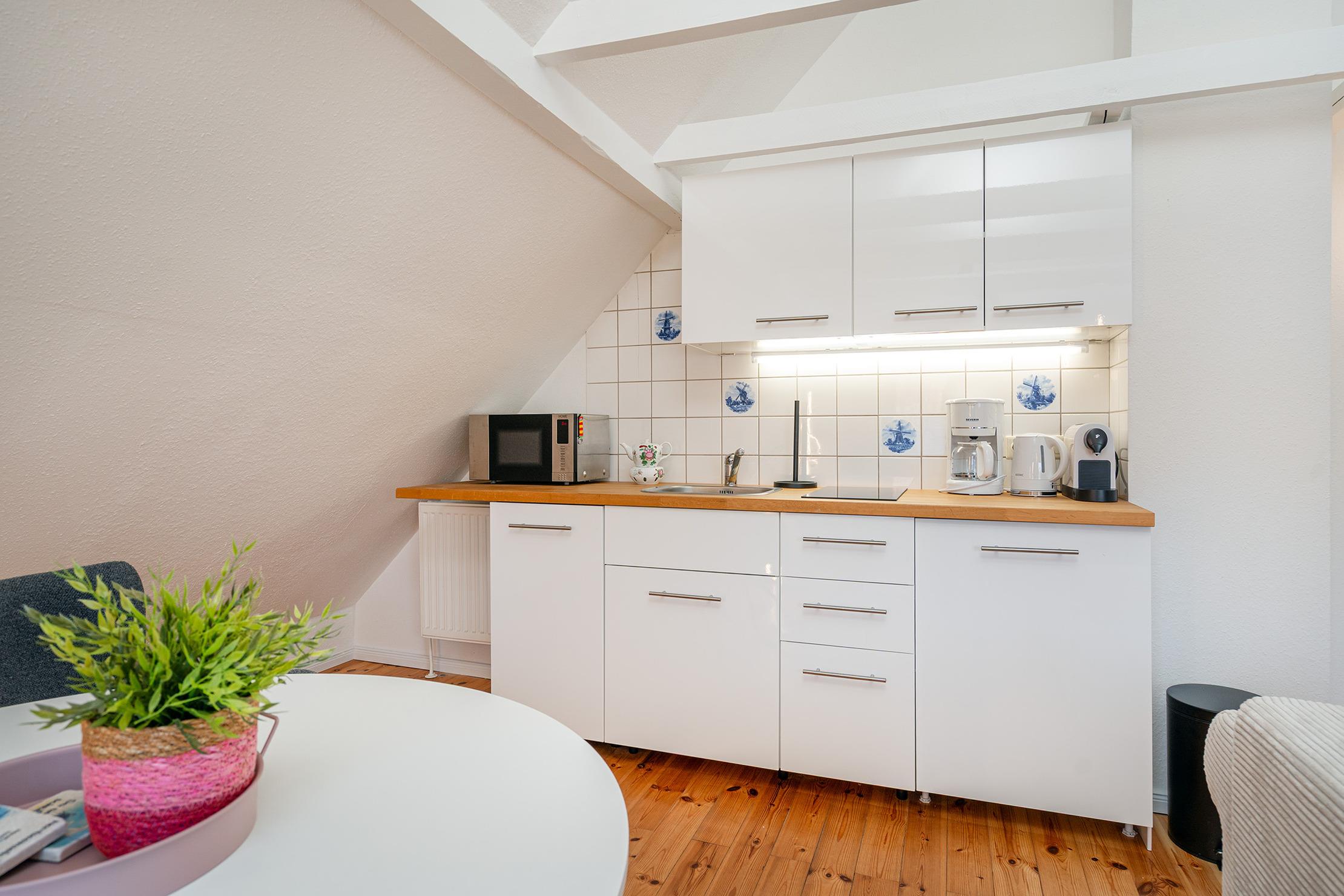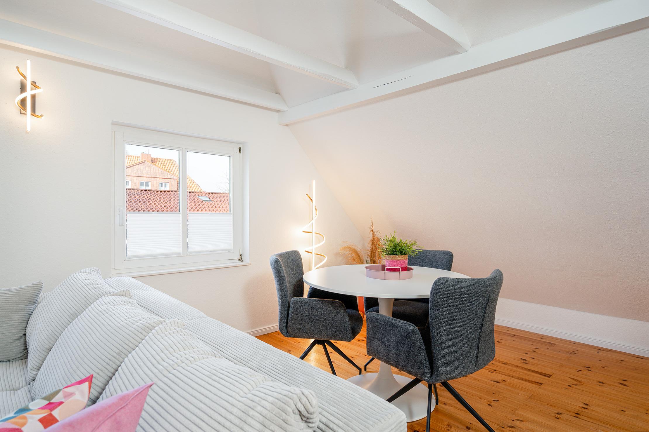 Willkommen in der "Lüttje Bud", Ihrer gemütlichen Ferienwohnung im Herzen von Greetsiel! "Klein aber sehr fein" beschreibt diese etwa 40qm große Wohnung im Obergeschoss am Besten, die mit einer perfekten Raumaufteilung überzeugt. Wer gerne zentral wohnt ist hier genau richtig: Die Wohnung verfügt über einen offenen und gemütlichen Wohn- und Essbereich mit einem großen Sofa, einen Esstisch und eine gut ausgestatteten Küchenzeile - ideal, um nach einem Tag an der frischen Luft den Abend entspannt ausklingen zu lassen. Neben dem Schlafzimmer mit komfortablem Doppelbett und genügend Ablagefläche bietet die Wohnung außerdem einen einladenden Eingangsbereich mit kleinem Sessel zum Lesen sowie ein geräumiges Tageslichtbad. Für die sonnigen Stunden eignet sich der kleine Freisitz, der sich am Eingangsbereich befindet und über die Wohnungseingangstreppe zu erreichen ist (bitte beachten Sie, dass die Treppe recht steil ist und die Terrasse somit nicht direkt vom Wohnraum aus zugänglich ist). Weitere Pluspunkte der Wohnung sind zum Einen der reservierte Parkplatz direkt am Haus sowie der Fahrradabstellraum, dies bietet nicht jede so zentral gelegene Wohnung.