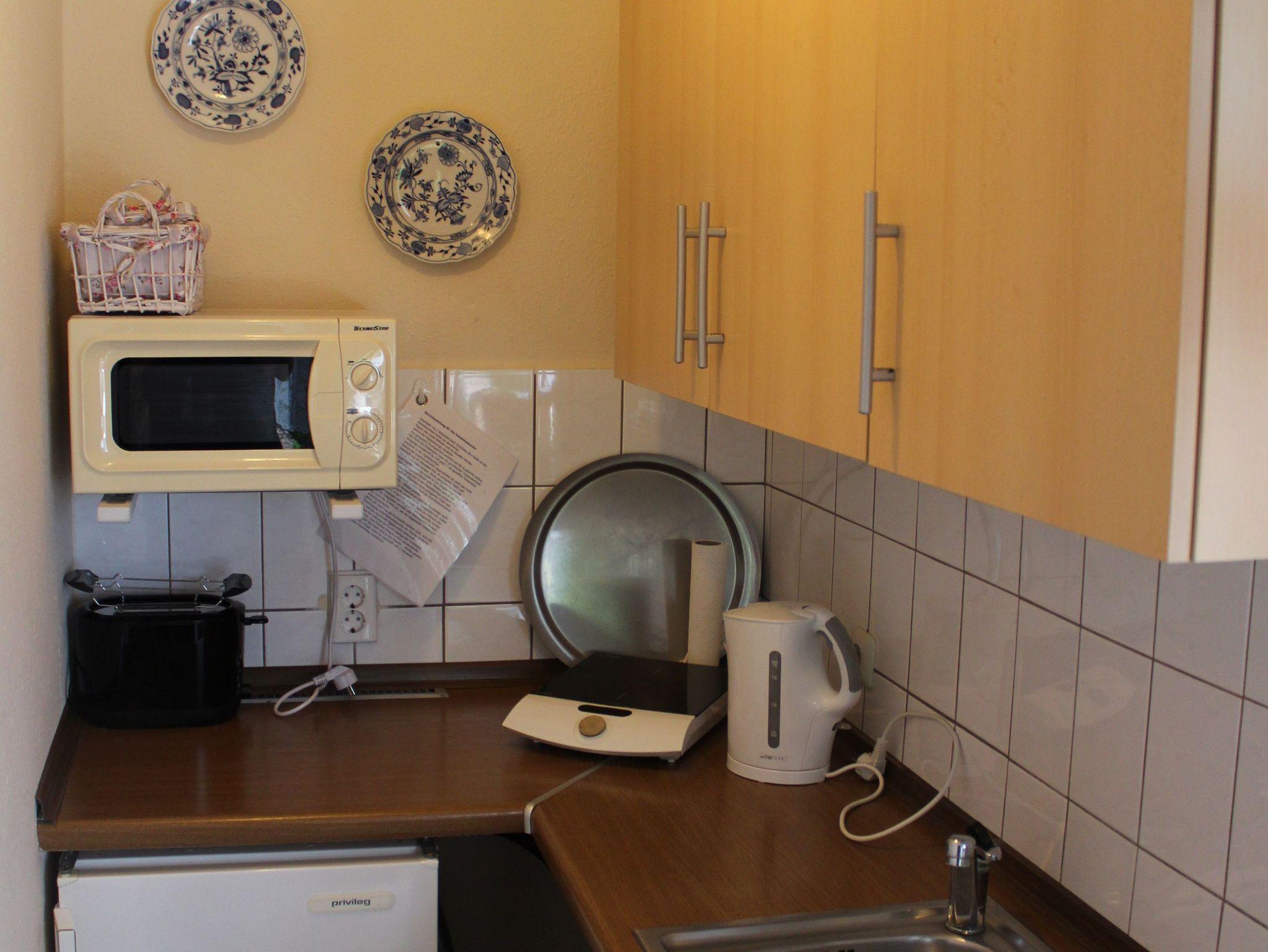 - Küchenzeile mit Herdplatten, Kühlschrank, Mikrowelle, Toaster und Wasserkocher