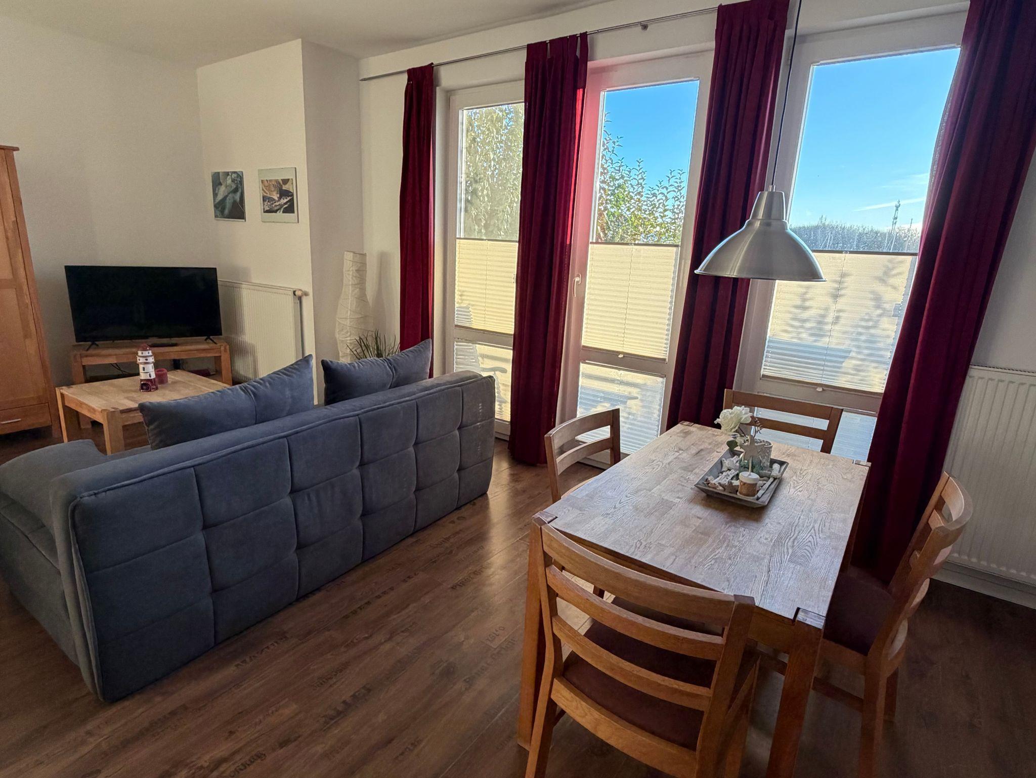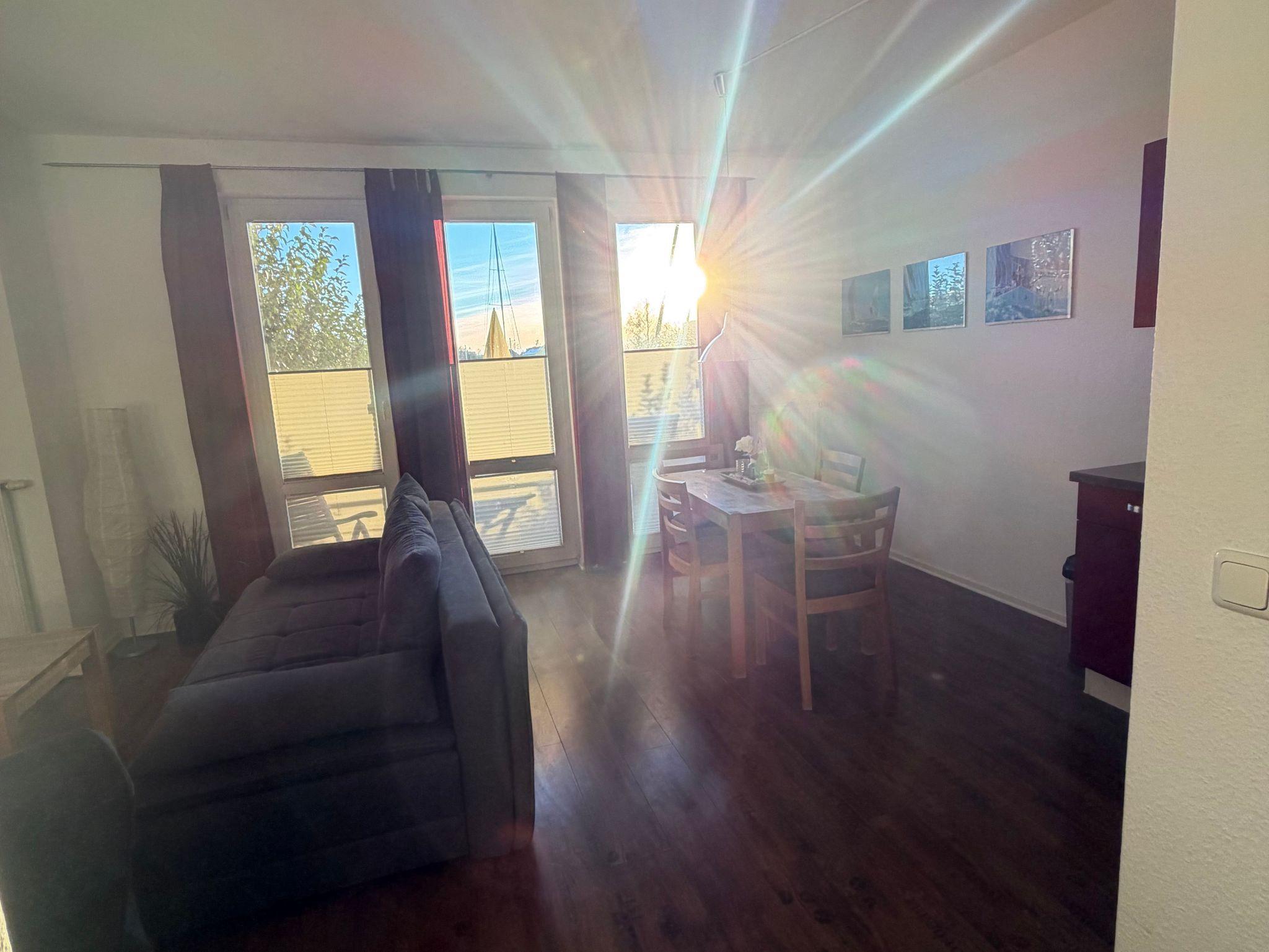Die Ferienwohnung befindet sich im Parterre des Hauses in der Marina am Ryck. Ein kombinierter Wohn-Schlafraum mit TV/Radio und einem Doppelbett (Betten können auch auseinander gestellt werden), eine Schlafcouch und Sessel, eine komfortable offene Küche mit Esstisch und ein Bad mit Dusche/WC bieten Platz für bis zu 4 Personen. Vom Zimmer kommen Sie auf die möblierte Terrasse mit einem Geländer. Bettwäsche und Handtücher sind vorhanden. Internet W-LAN kostenlos. Kinderhochstuhl und Kinderreisebett können nach Absprache kostenlos zur Verfügung gestellt werden. Anreise ab 15 Uhr oder nach Absprache eventuell früher, Abreise bis 10.00 Uhr.