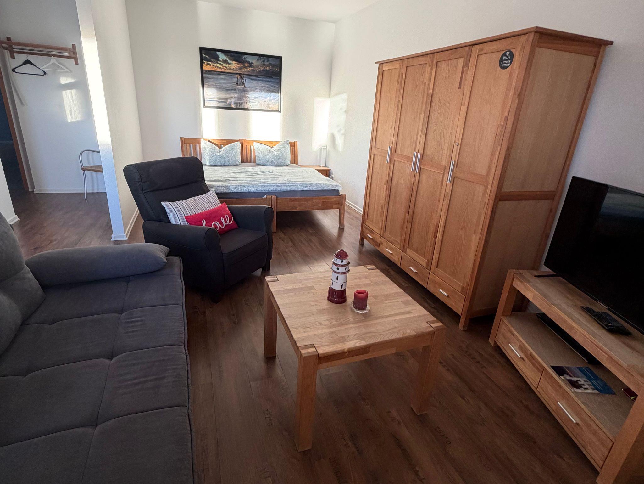 Die Studiowohnung hat eine Terrasse mit Blick aufs Wasser. Im der Wohnküche befindet sich eine neue Schlafcouch (Februar 2025) sowie ein 1,80m Bett, was man auch auseinander stellen kann.