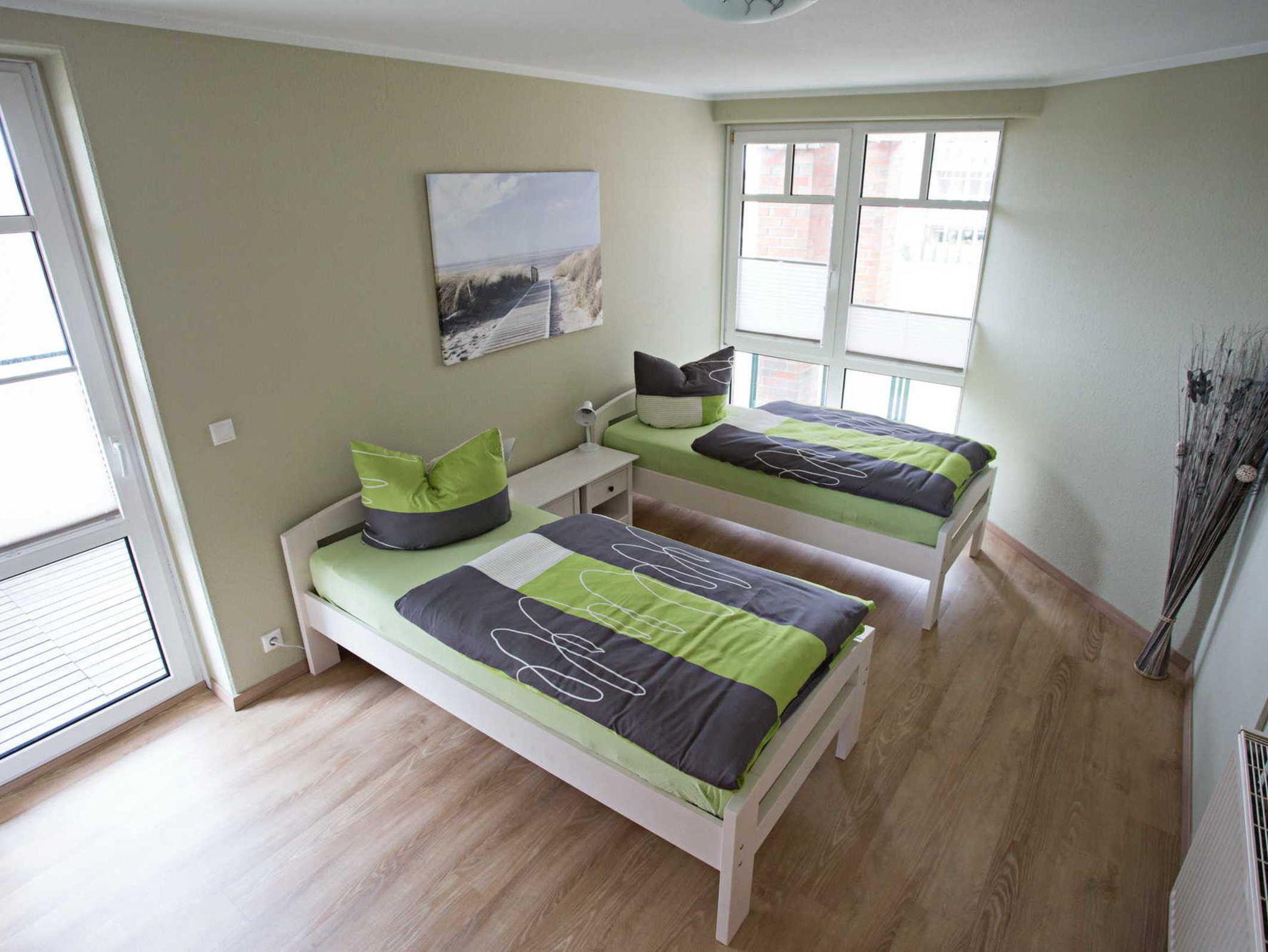 Die Wohnung geht über 2 Etagen mit einer Treppe nach oben. Sie verfügt über ein großes Wohnzimmer mit 2 Schlafcouchen, Flachbildfernseher, einem Balkon und einer Küche mit allem was man braucht. Unten befindet sich noch ein Gäste-WC. In der oberen Etage ist ein großes Bad mit Dusche und 2 separate Schlafzimmer mit je einem Flachbildfernseher und je einem Balkon. Zustellbetten, Babybett sowie Hochstuhl auf Anfrage. Auch für Rollstuhlfahrer geeignet (unten auf dem Schlafsofa). Zweites Badezimmer unten mit Toilette und Waschbecken, jedoch sehr eng und verfügt über keine Dusche.