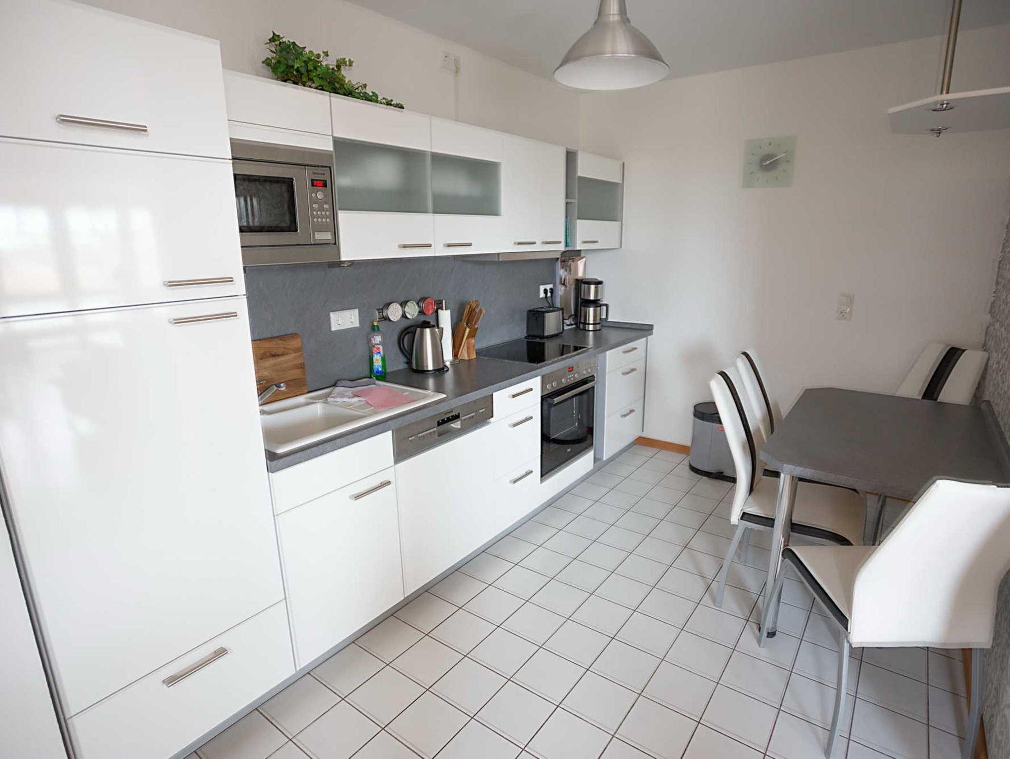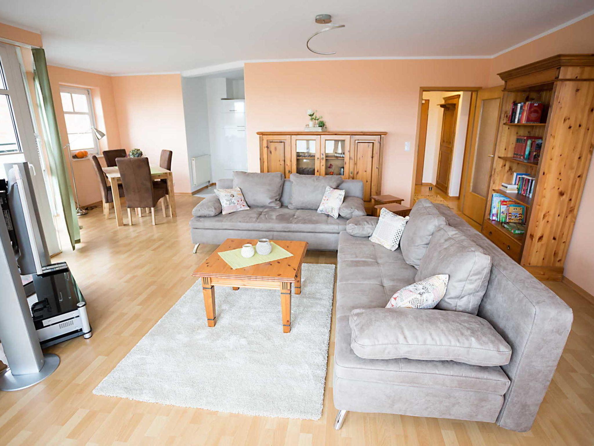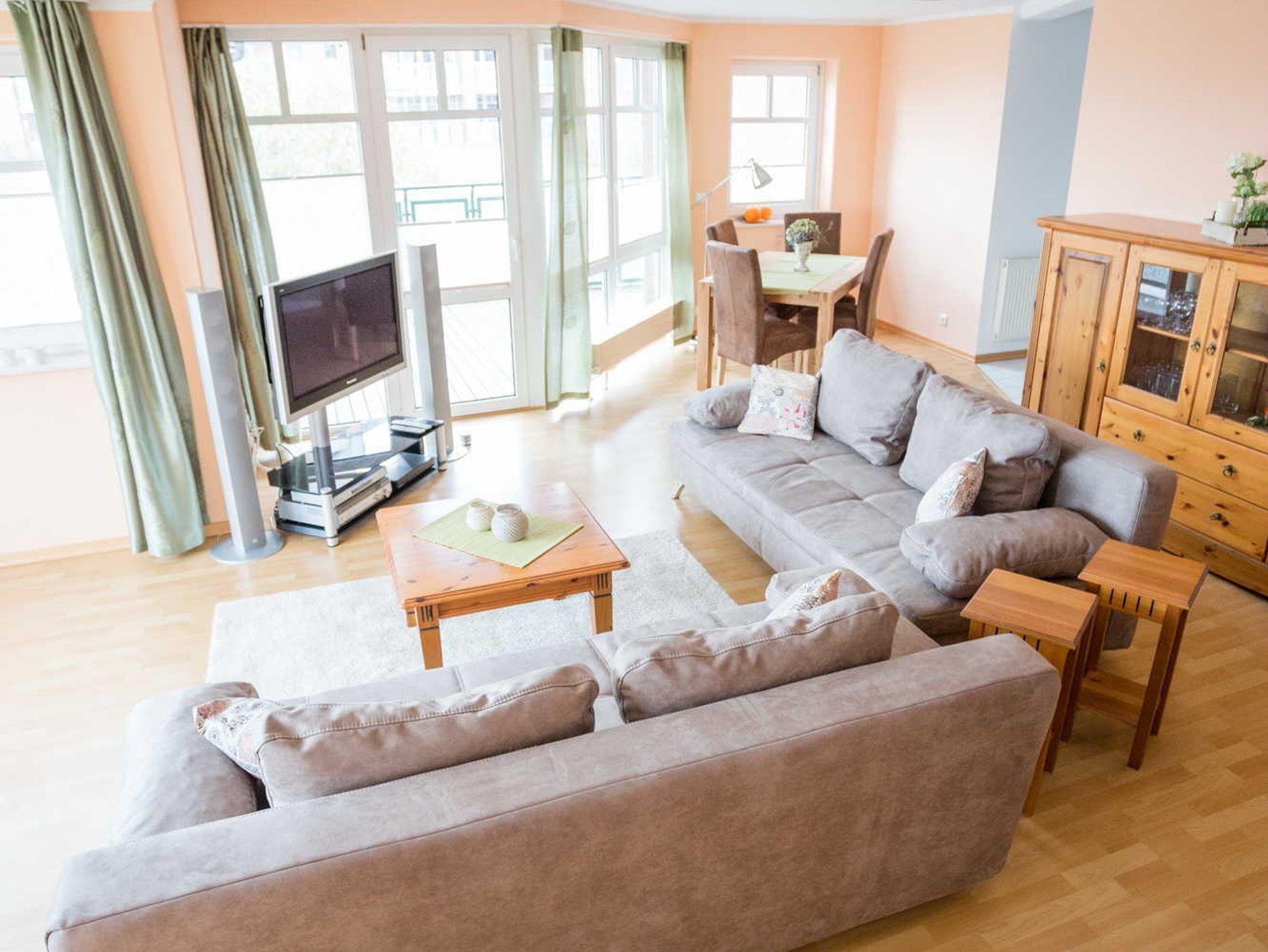 Die Wohnung geht über 2 Etagen mit einer Treppe nach oben. Sie verfügt über ein großes Wohnzimmer mit 2 Schlafcouchen, Flachbildfernseher, einem Balkon und einer Küche mit allem was man braucht. Unten befindet sich noch ein Gäste-WC. In der oberen Etage ist ein großes Bad mit Dusche und einer Waschmaschine, die sie kostenpflichtig dazubuchen können und 2 separate Schlafzimmer mit je 2 Schlafplätzen und je einem Flachbildfernseher und je einem Balkon. Zustellbetten vorhanden. WLAN und ein PKW Stellplatz sind im Preis inbegriffen. Die Wohnung ist sowohl über eine kleine Treppe, als auch mit dem Fahrstuhl zu erreichen. Auf den 3 Balkonen darf geraucht werden. Die Wohnung darf nicht für Partys oder Familienfeste genutzt werden.