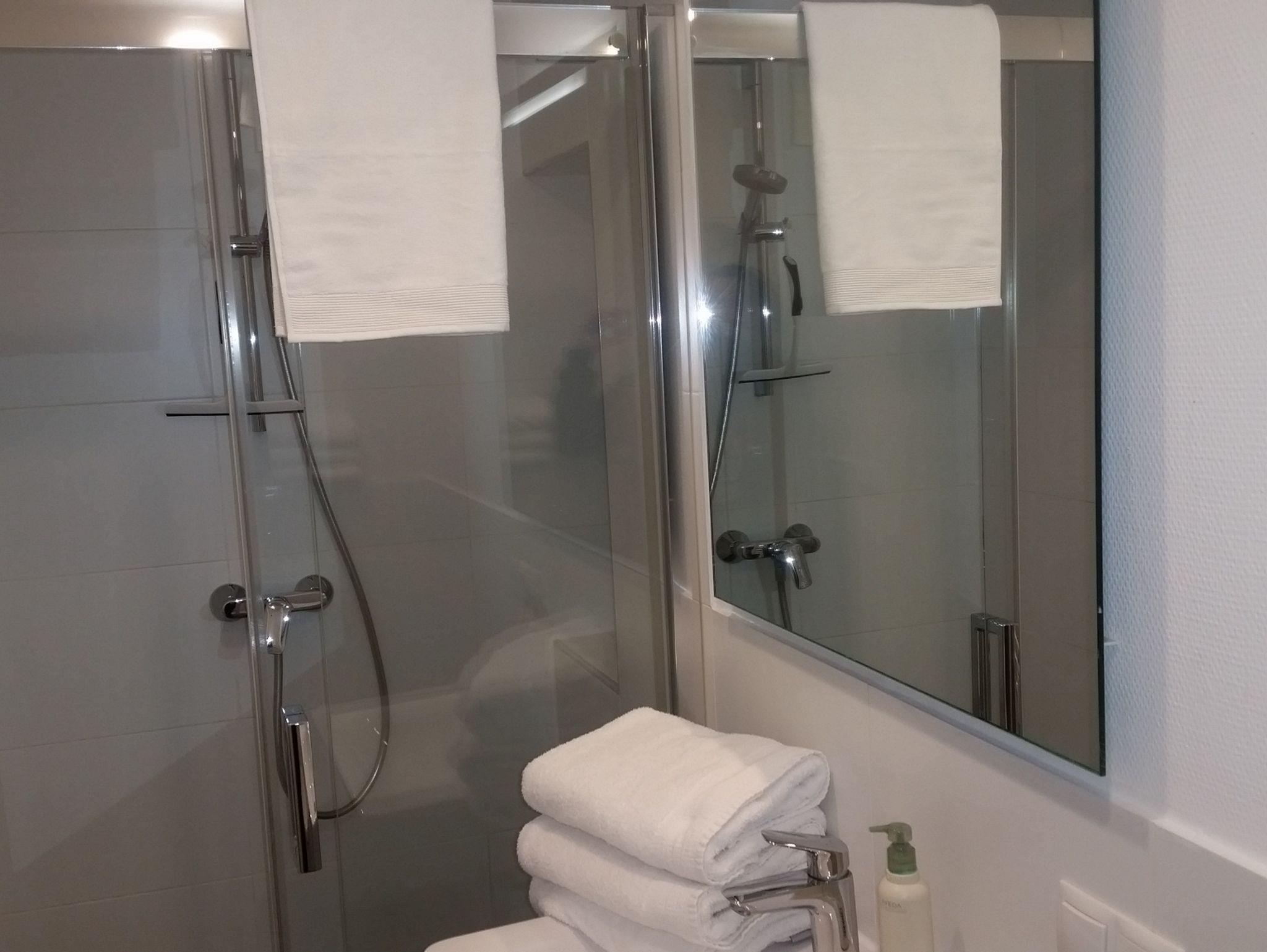 Die Ferienwohnung ist modern und hochwertig ausgestattet. Das 43qm große Appartement hat ein Schlafzimmer. Dieses ist mit einem französischen Bett und einem Einzelbett ausgestattet. Im Wohnzimmer ist ein Schlafsofa vorhanden, welches auf Anfrage als Einzel- oder Doppelbett zugebucht werden kann. Die Küche ist mit allen wichtigen Küchenutensilien ausgestattet. Auch eine Essecke befindet sich in der Wohn- /Essküche. Außerdem befindet sich ein Flachbild-TV im Wohnbereich. Beide Badezimmer sind mit Dusche, WC und einem Handtuchtrockner ausgestattet. Das zweite Badezimmer ist optional zusätzlich. Die gesamte Wohneinheit befindet sich im Erdgeschoß. Selbstverständlich sind Bettwäsche und Handtücher inklusive. Das WLAN ist kostenfrei verfügbar.