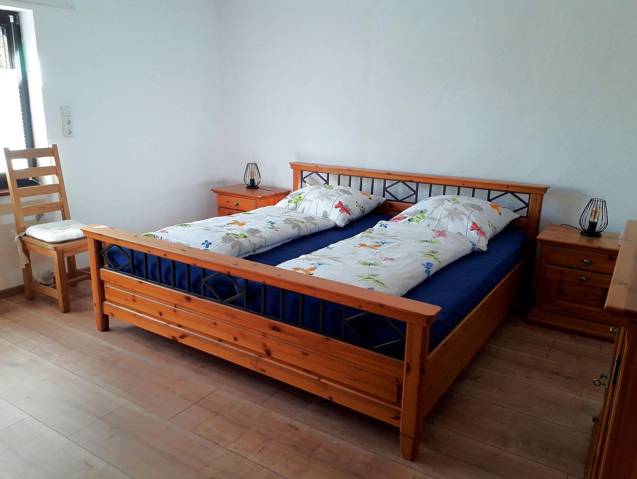 Das Schlafzimmer ist mit einem Doppelbett (200x200cm), einem Kleiderschrank und einer Kommode mit Wandspiegel ausgestattet. Die Betten sind frisch bezogen, zusätzliche Decken und Kopfkissen werden auf Wunsch bereitgestellt.