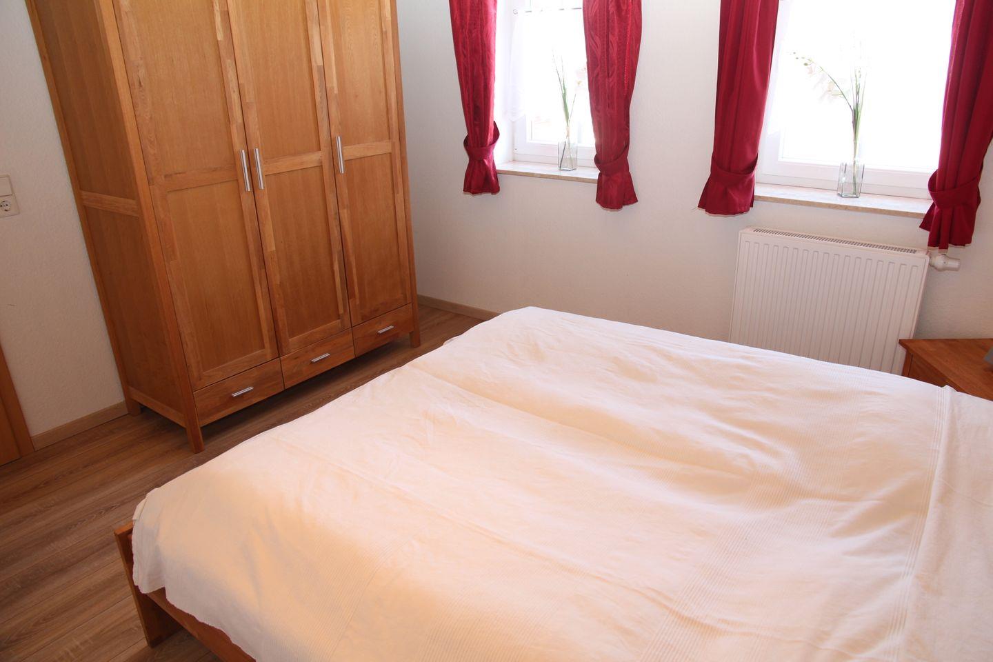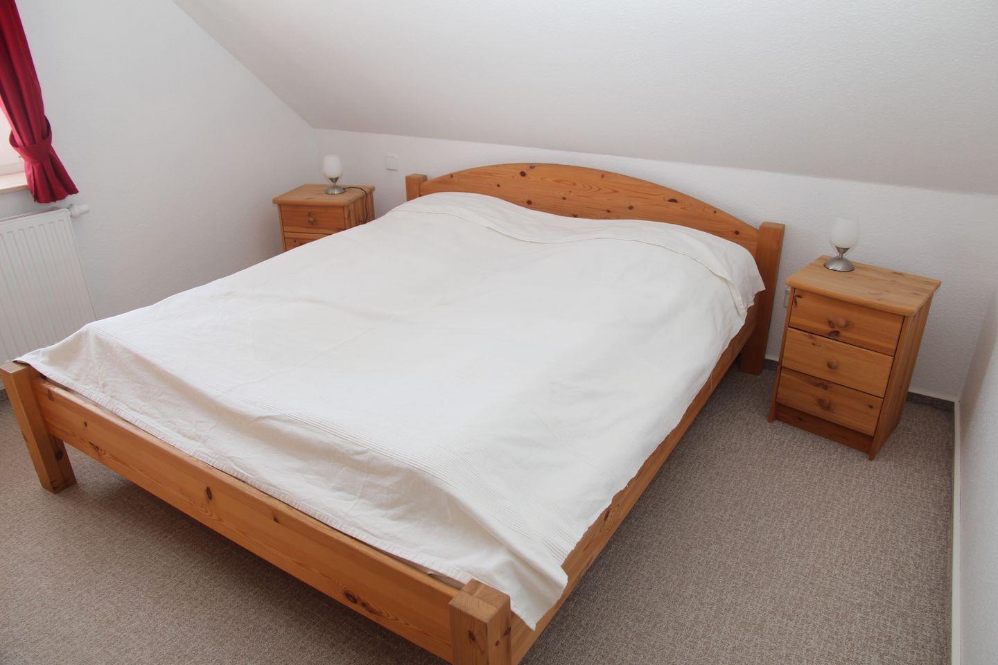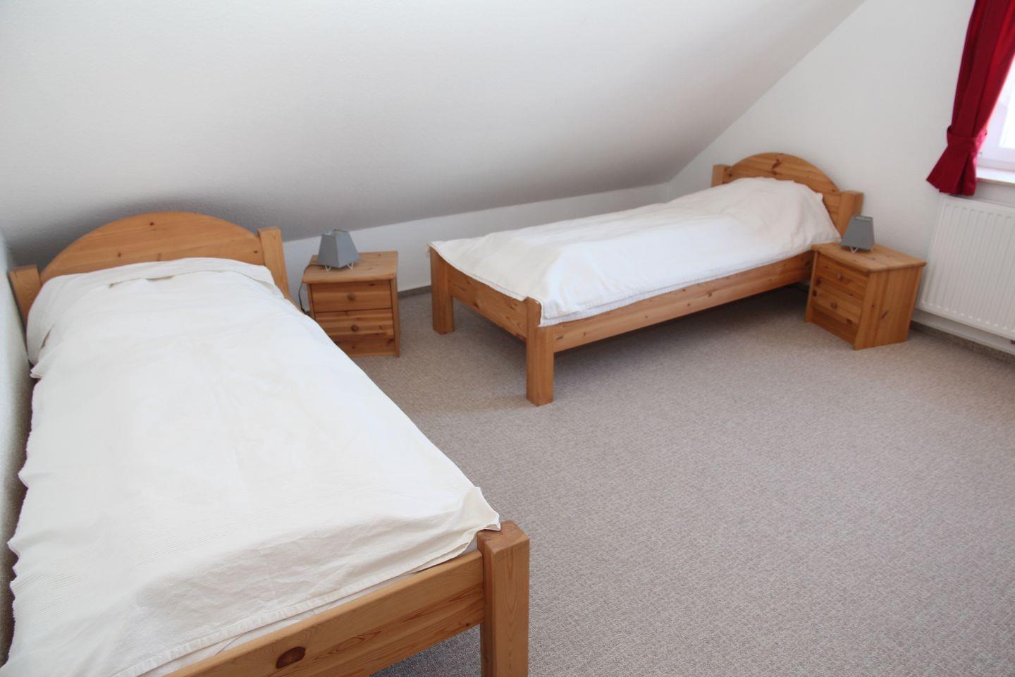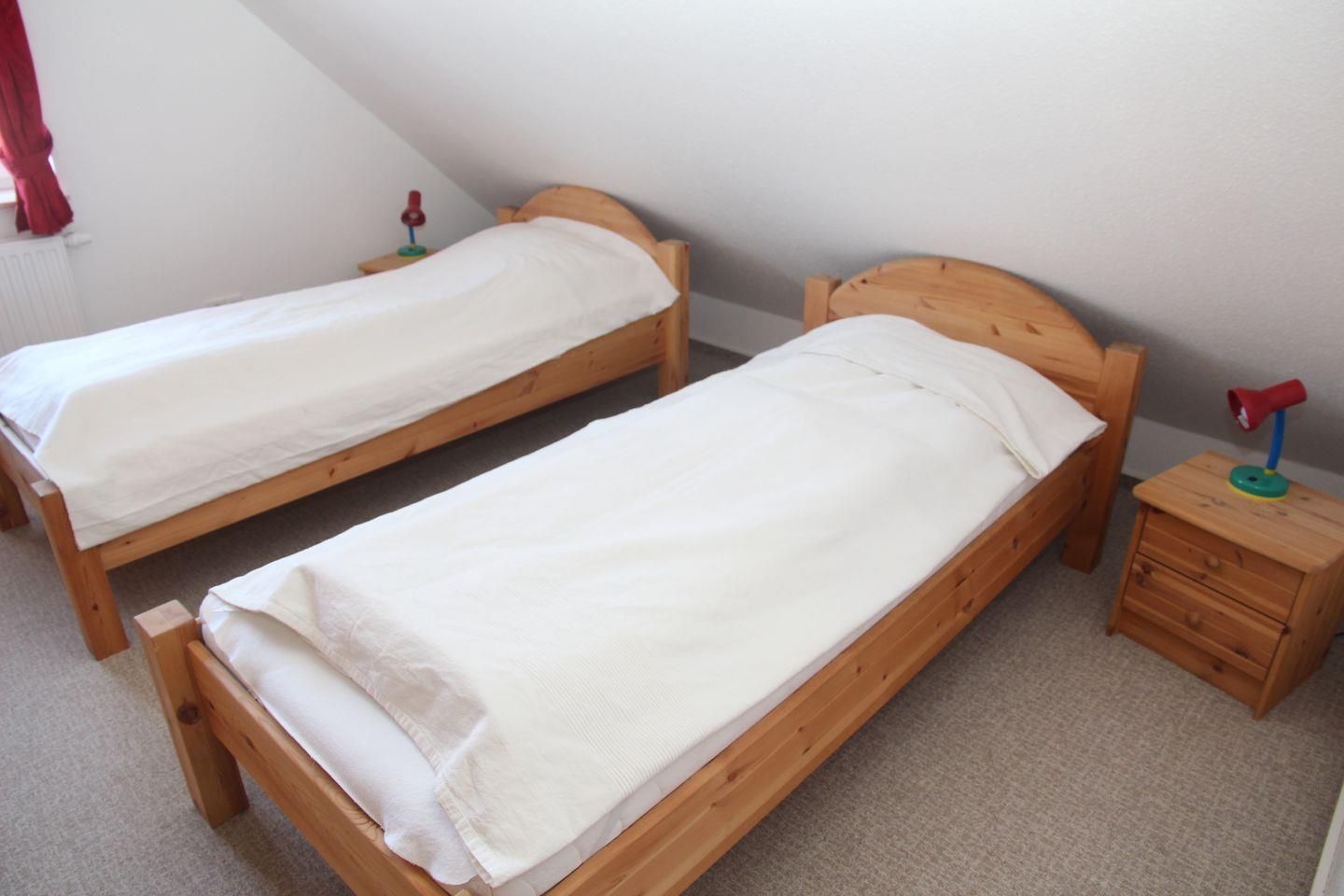 Eines Schlafzimmer (Doppelbett 2 m x 1,60 m) ist im EG untergebracht. Im Obergeschoss sind 3 weitere Schlafzimmer (1 * Doppelbett, 2 * mit je 2 einzelnen Betten - jeweils 2 m x 0,90 m) ein Schlafzimmer verfügt über einen weiteren Fernseher und ein weiteres Duschbad ist ebenfalls vorhanden.