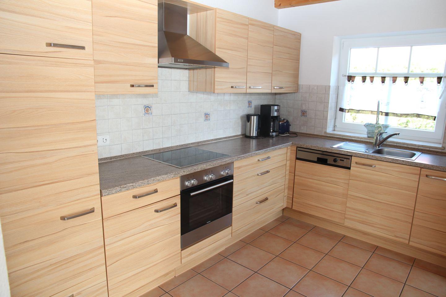 Im Erdgeschoss befindet sich der großzügige Wohn-/Essbereich mit großen Türen, die auf die Terrasse führen. Die Küche ist mit Backofen, Mikrowelle und Geschirrspüler, etc. voll ausgestattet.