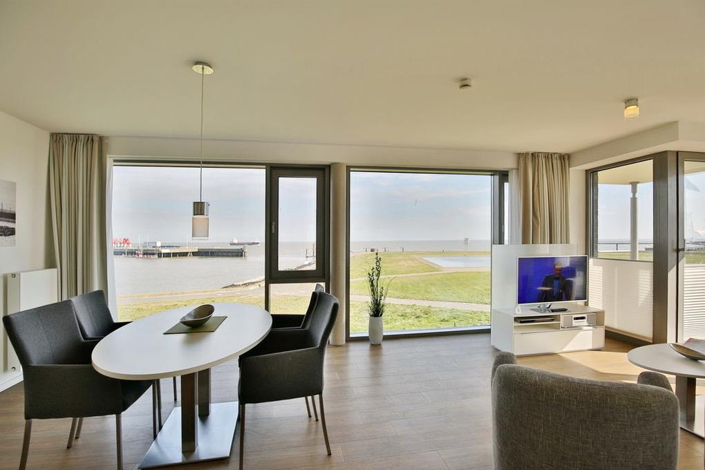 Sagenhafter Seeblick. Direkt an der Sehenswürdigkeit "Alte Liebe" erleben Sie einen der schönsten Ausblicke Cuxhavens. Tolle 3 Zi. Luxus-Wohnung über 85m², 1. Etage, großes Wohnzimmer mit dem Panoramablick und Balkon, vollständig ausgestattete Küchenzeile, 2 Schlafzi. mit Doppelbetten und Außenjalousien, 2xTV, DVD, Radio/CD, kostenloses W-Lan-Internet, 1xDu/WC, 1x Gäste-WC, reservierter Außenstellplatz, freie Saunanutzung, Nichtraucher, keine Haustiere.