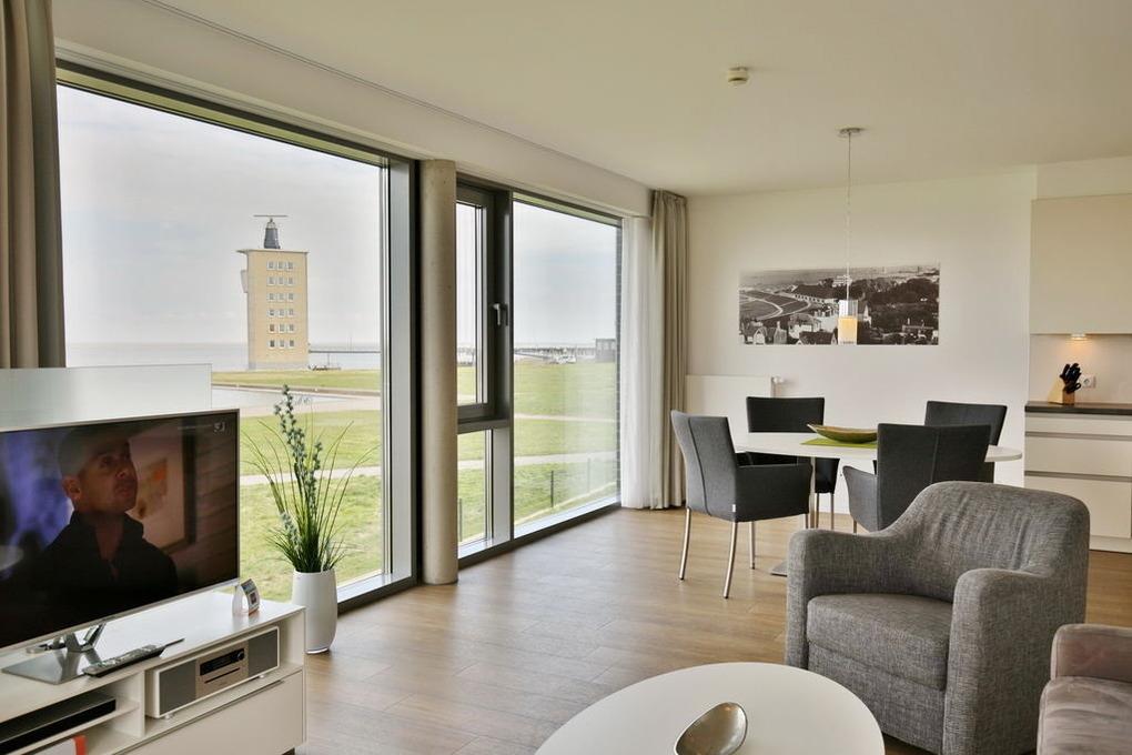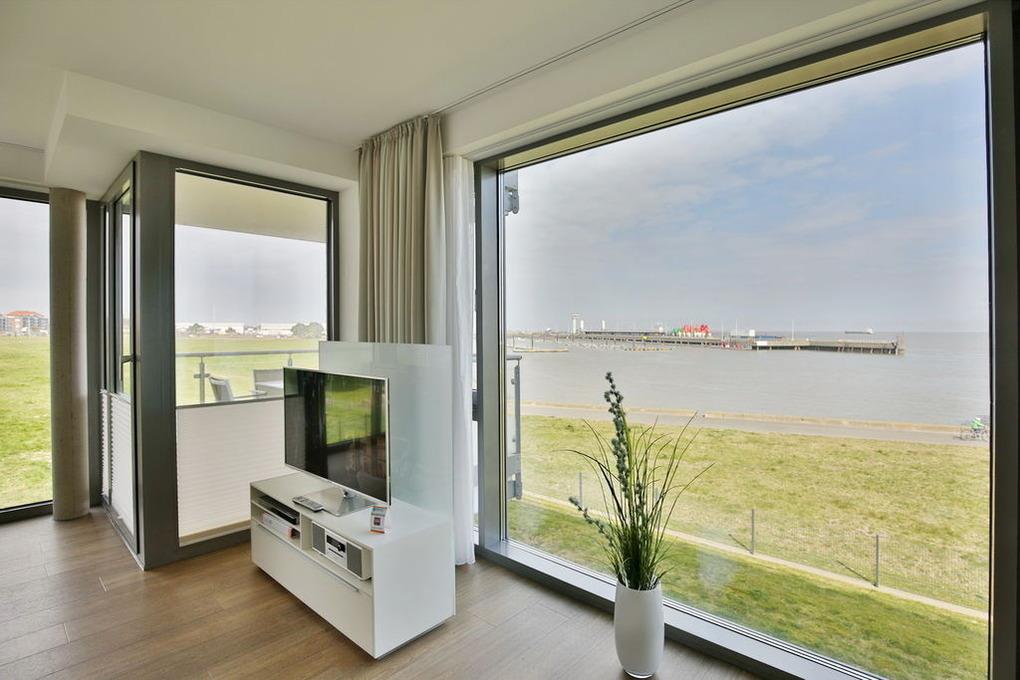 Totaler Seeblick. Direkt an der Sehenswürdigkeit "Alte Liebe" erleben Sie einen der schönsten Ausblicke Cuxhavens. Schöne 3 Zi. Luxus-Wohnung über 85m², 1. Etage, großes Wohnzimmer mit dem Panoramablick und Balkon (nord/west), vollständig ausgestattete Küchenzeile, 2 Schlafzi. mit Doppelbetten und Außenjalousien, 2xTV, DVD, Radio/CD, kostenloses W-Lan-Internet, 1xDu/WC, 1x Gäste-WC, reservierter Außenstellplatz, freie Saunanutzung, Nichtraucher, keine Haustiere.