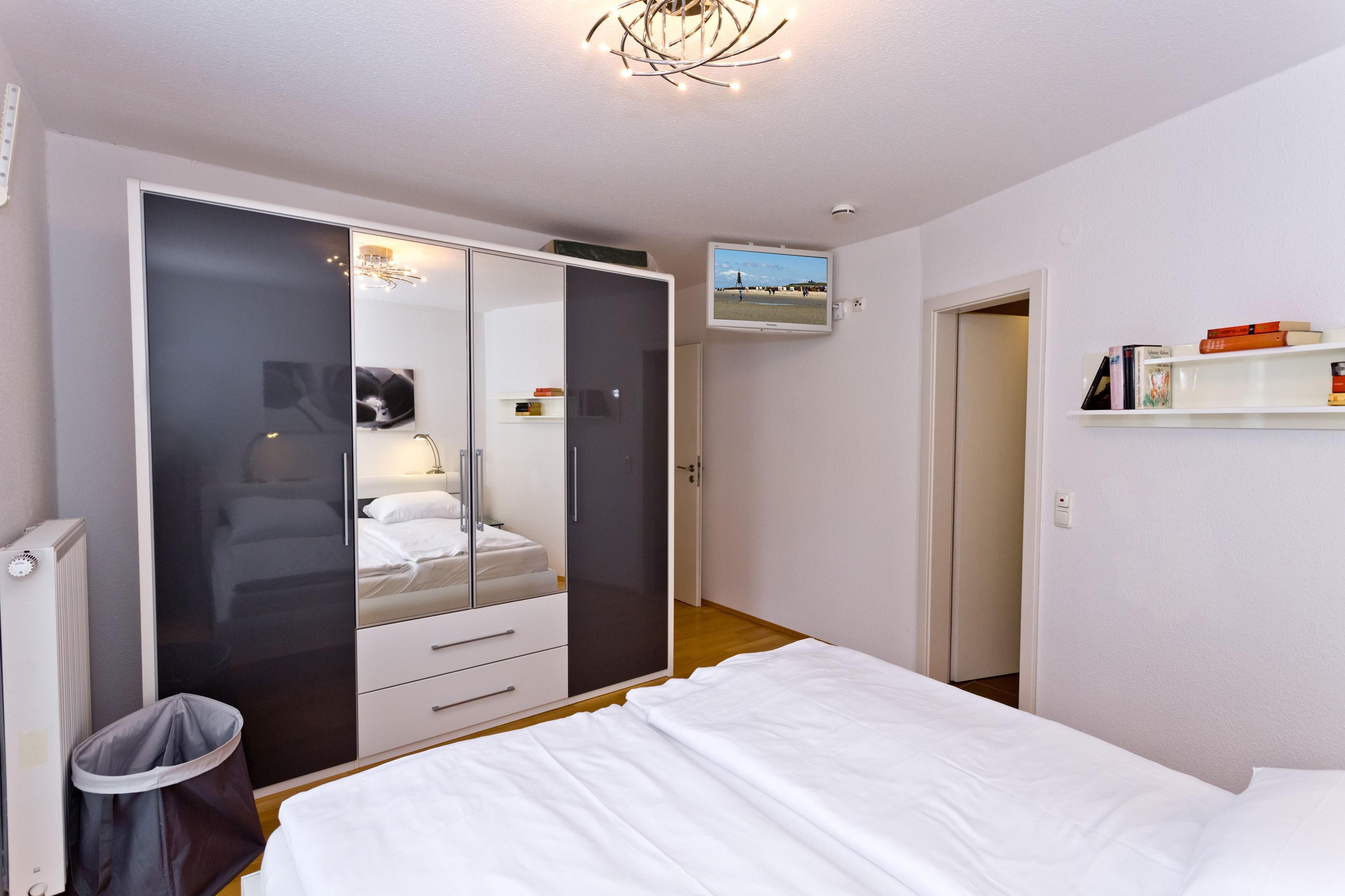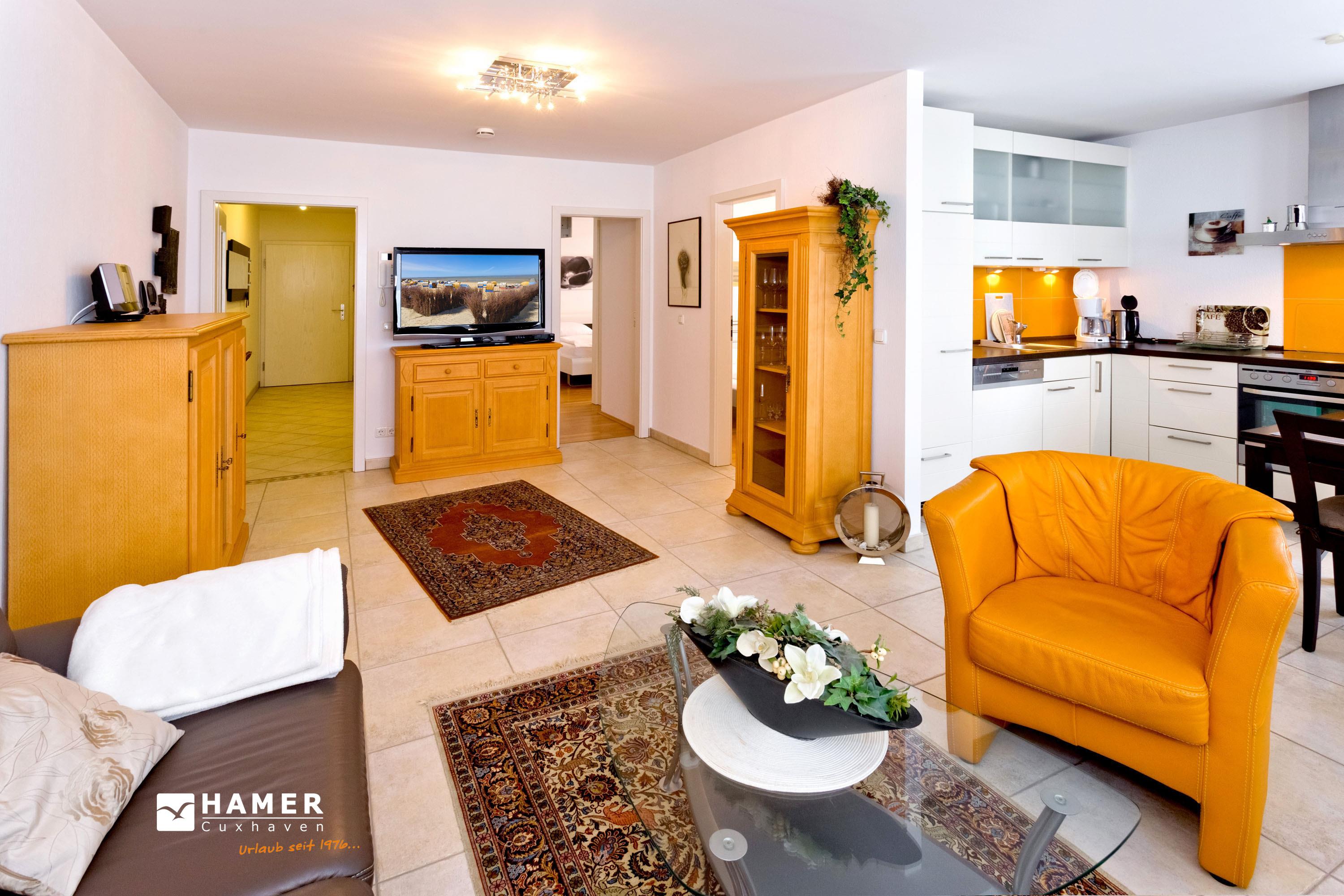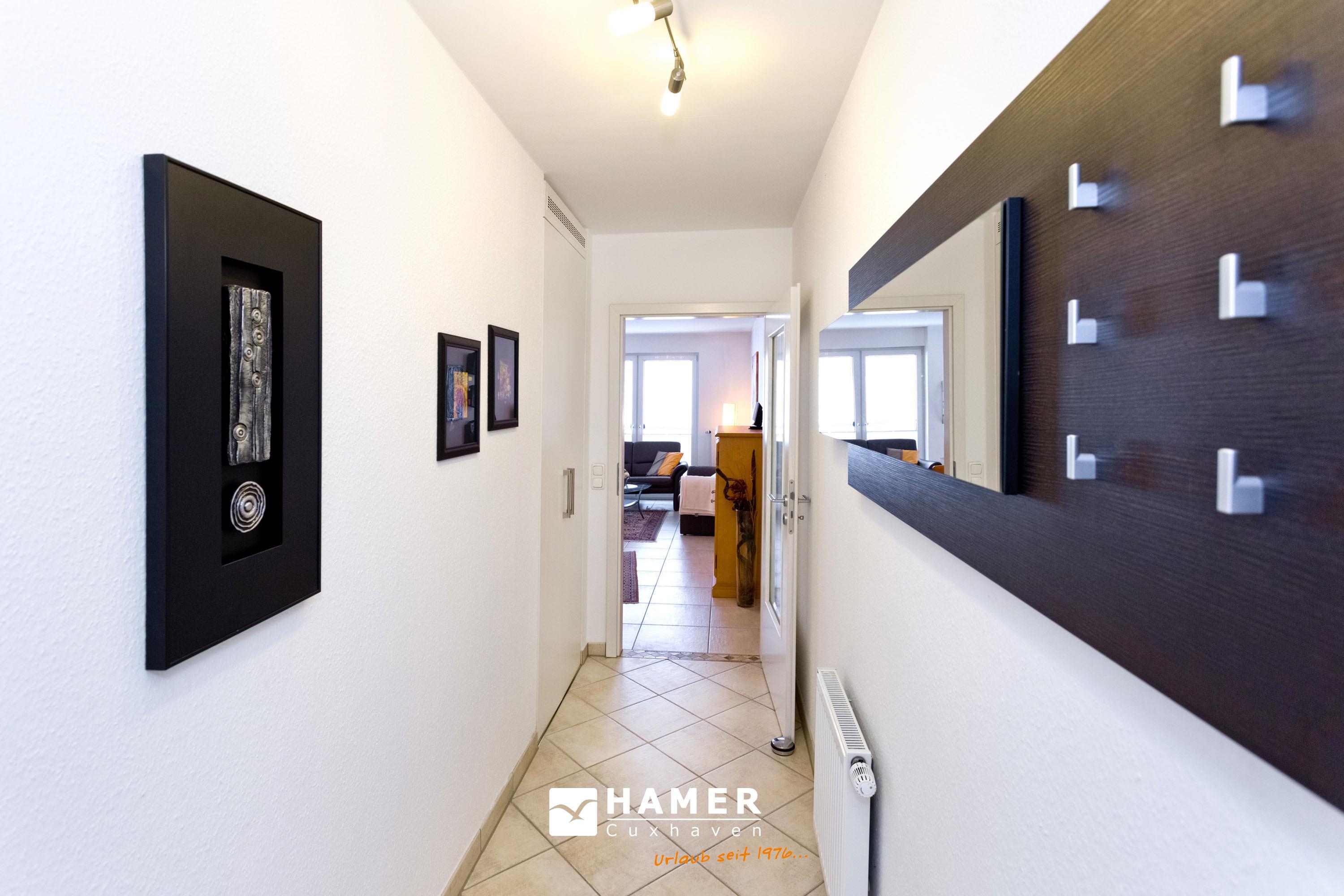 Schöne 3-Zimmer-Wohnung auf der 1.Etage in der Grimmershörnbucht für bis zu 4 Pers., 1 Schlafzimmer mit Doppelbett und TV, 1 Schlafzimmer mit franz. Doppelbett (1,40m x 1,90m). Bad mit ebenerdiger Dusche und WC. Wohnzimmer mit vollausgestatteter Küchenzeile (Backofen, Geschirrspüler), Sat-TV, kostenloses W-Lan (offenes Netzwerk), großer Balkon (nord) mit Strandkorb, Einzelgarage #4 im Innenhof mit elektr. Tor, kostenfreie Waschmaschine/Trockner im Erdgeschoss, keine Haustiere erlaubt, Nichtraucher.