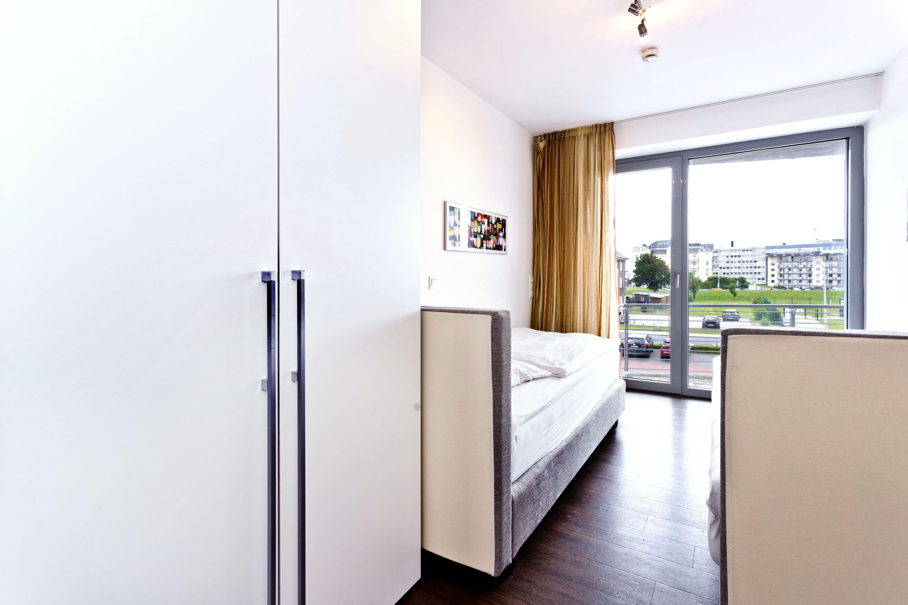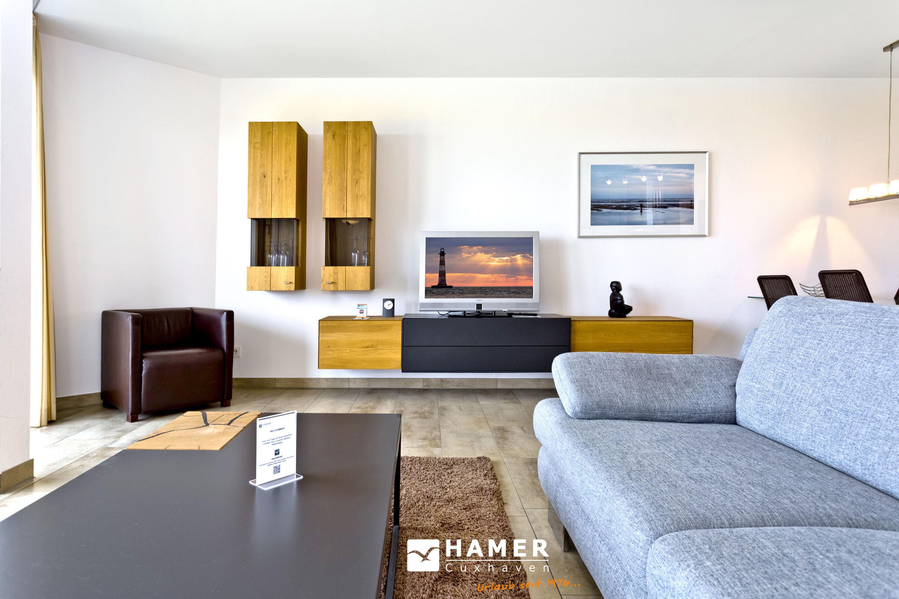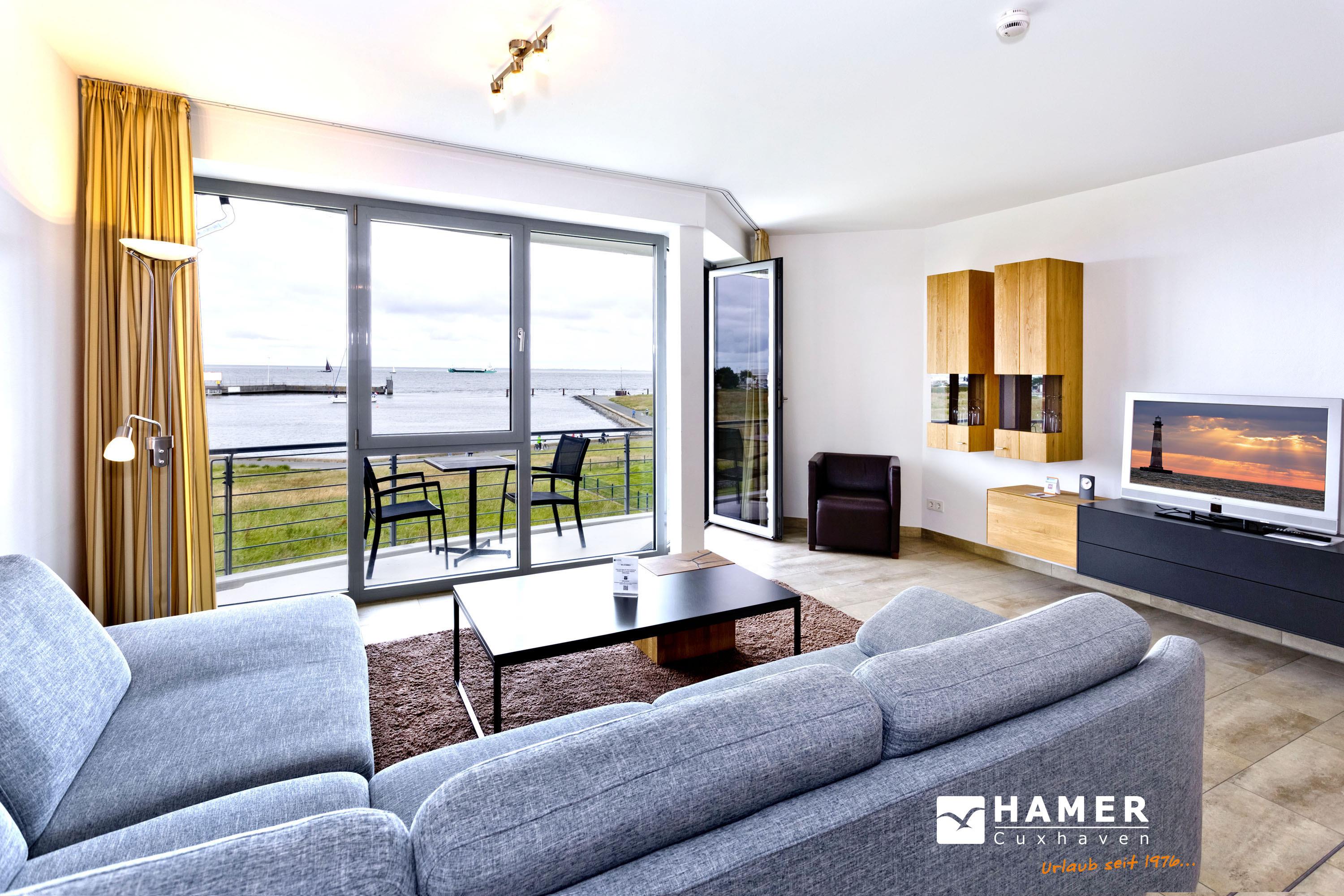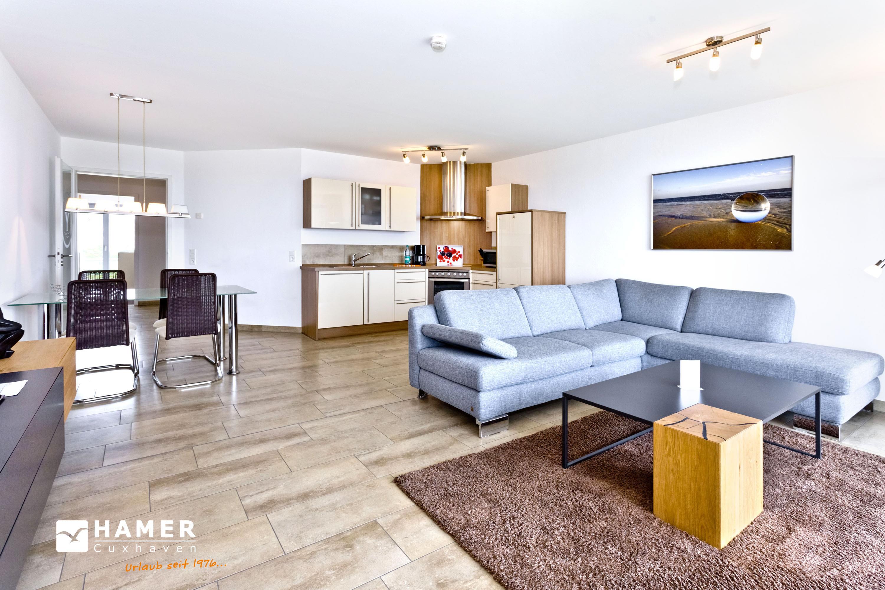 Geschmackvolle 102m² Wohnung in der 1.Etage. Hier haben Sie die Traumseesicht auf den Weltschifffahrtsweg und die Hafenanlagen. 1 Schlafzimmer mit Doppelbett, 1 Schlafzimmer mit 2 Einzelbetten, 1 Bad/Du/Wc und 1 Gäste Wc, Föhn, großes Wohnzimmer mit komplett ausgestatteter Küchenzeile (Kühlschrank ohne Gefrierfach), 2 große Balkone (nord+süd). Die Schlafzimmer verfügen über Rollläden. Zur Wohnung gehört der reservierter Pkw-Stellplatz #10 am Haus. Keine Haustiere. Nichtraucher. Fahrräder können auch bequem und sicher im ebenerdigen Fahrradraum des Nachbargebäudes abgestellt werden (separater Schlüssel).