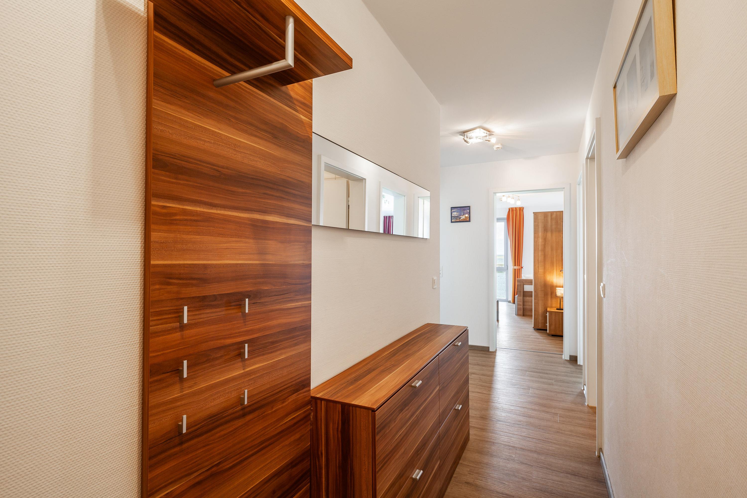 Sehr geschmackvolle 3 Zi.-Wohnung in der 1.Etage über 75m². Traumhafter Seeblick auf den Weltschifffahrtsweg, 1 Schlafzimmer mit Doppelbett (Boxspringbett), 1 Schlafzimmer mit 2 Einzelbetten (Boxspring), 1x Badewanne/WC und 1x Dusche/WC, Wohnzimmer mit komplett ausgestatteter Küchenzeile, schöner Balkon zur Wasserseite. Reservierter Pkw-Stellplatz in der Tiefgarage, Nichtraucher, keine Haustiere erlaubt.