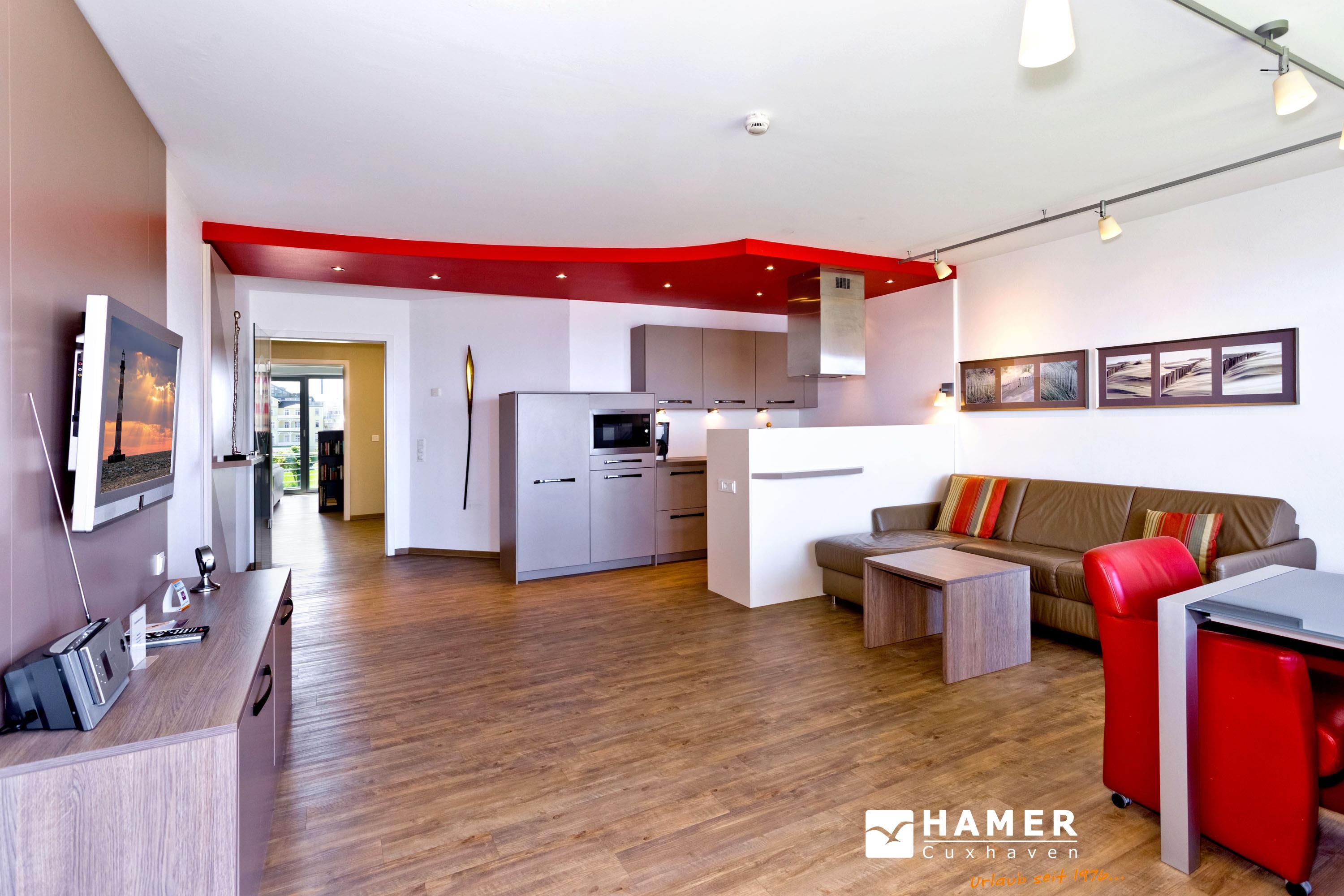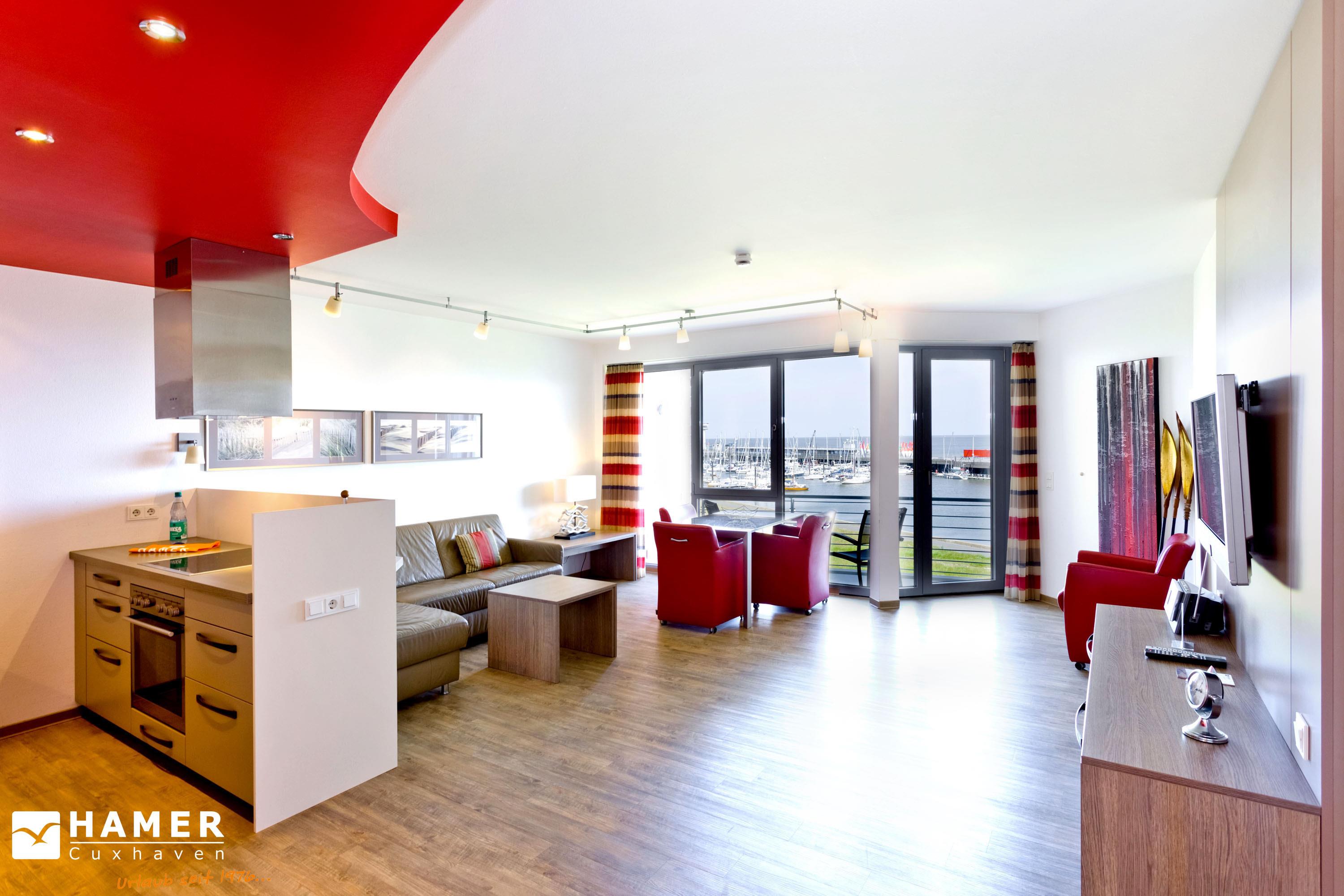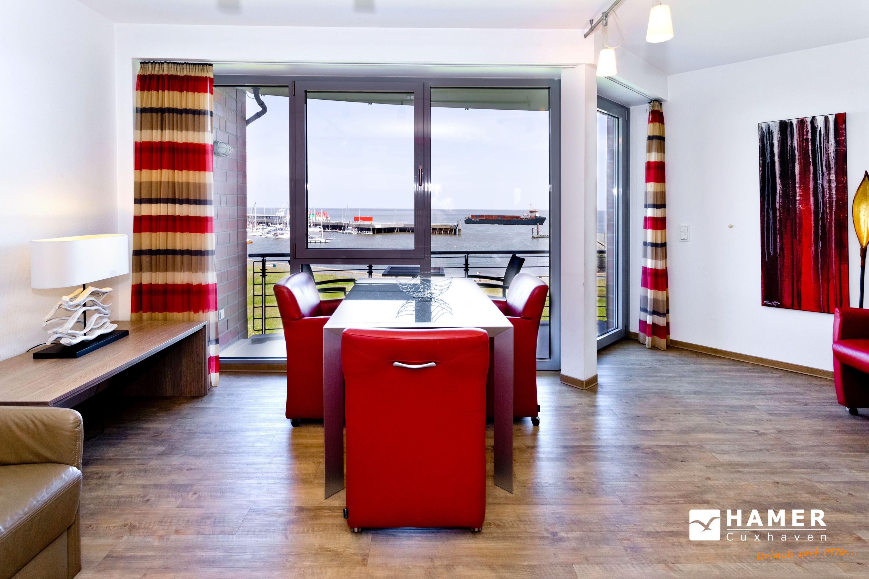 Sehr geschmackvolle Wohnung in der 2.Etage auf 102 m². Hier haben Sie die Traumseesicht auf den Weltschifffahrtsweg und die Hafenanlagen. 1 Schlafzimmer mit Doppelbett (Boxspringbett) und TV, 1 Schlafzimmer mit 2 Einzelbetten, Schlafzimmer mit Rollläden, 1 Du/WC und 1 Gäste-WC, Föhn, großes Wohnzimmer mit komplett ausgestatteter Küchenzeile, TV, CD, 2 große Balkone (nord+süd). Zur Wohnung gehört ein reservierter Pkw-Stellplatz am Haus. Keine Haustiere. Nichtraucher. Fahrräder können auch bequem und sicher im ebenerdigen Fahrradraum des Nachbargebäudes abgestellt werden (separater Schlüssel).