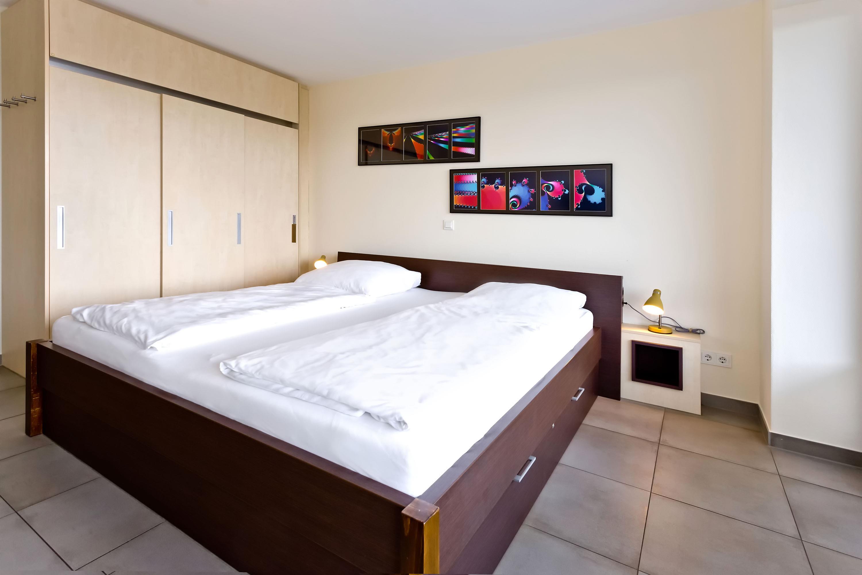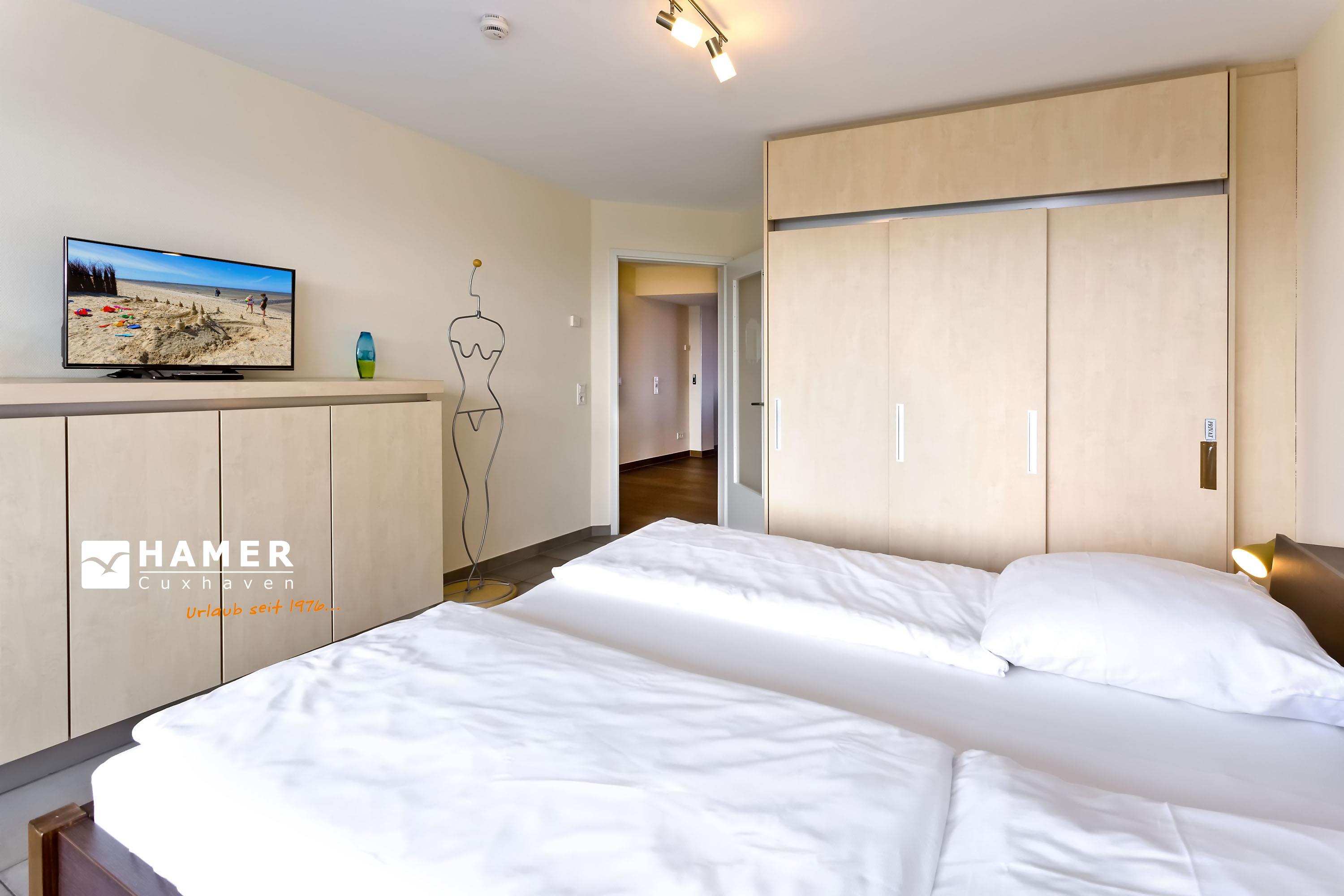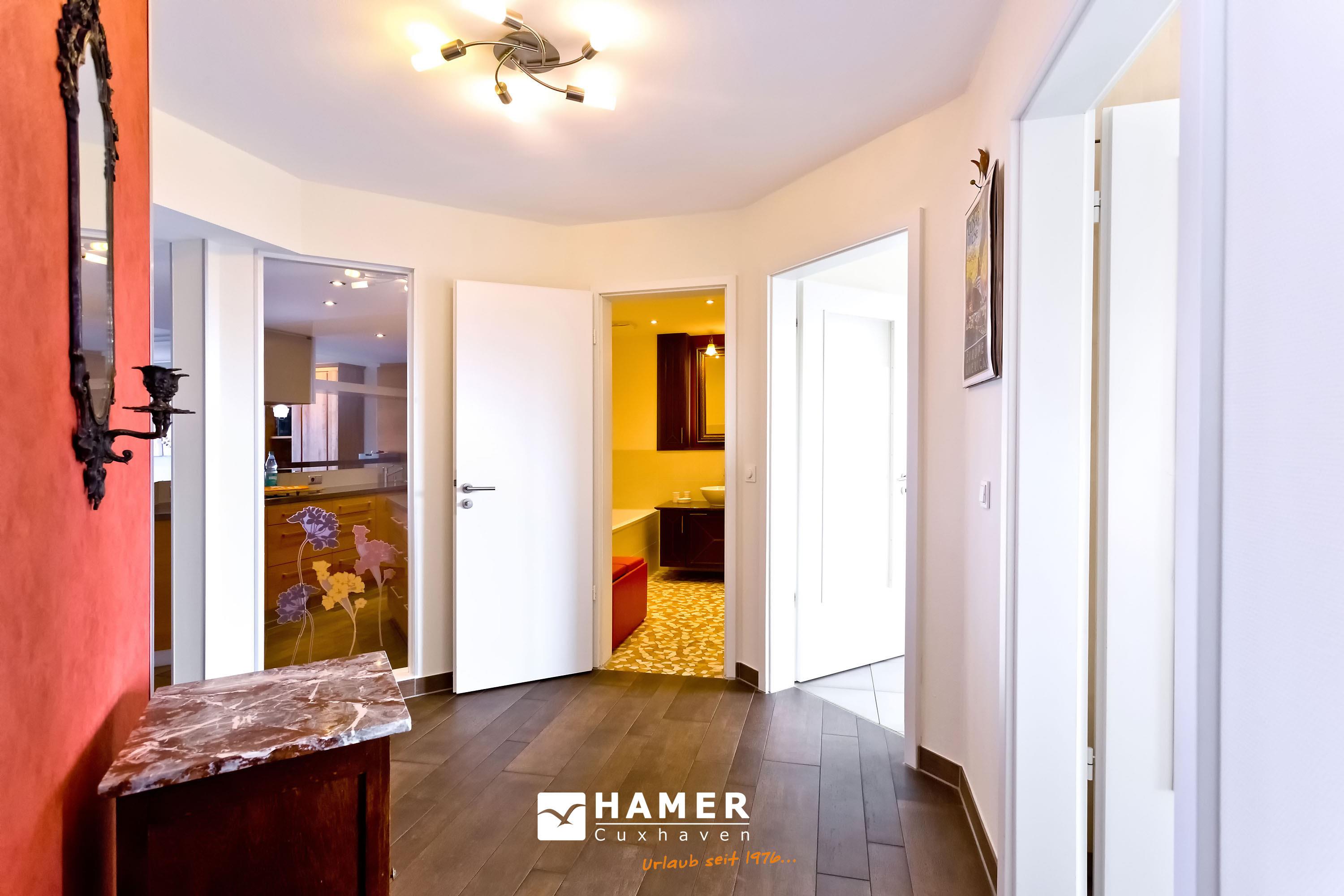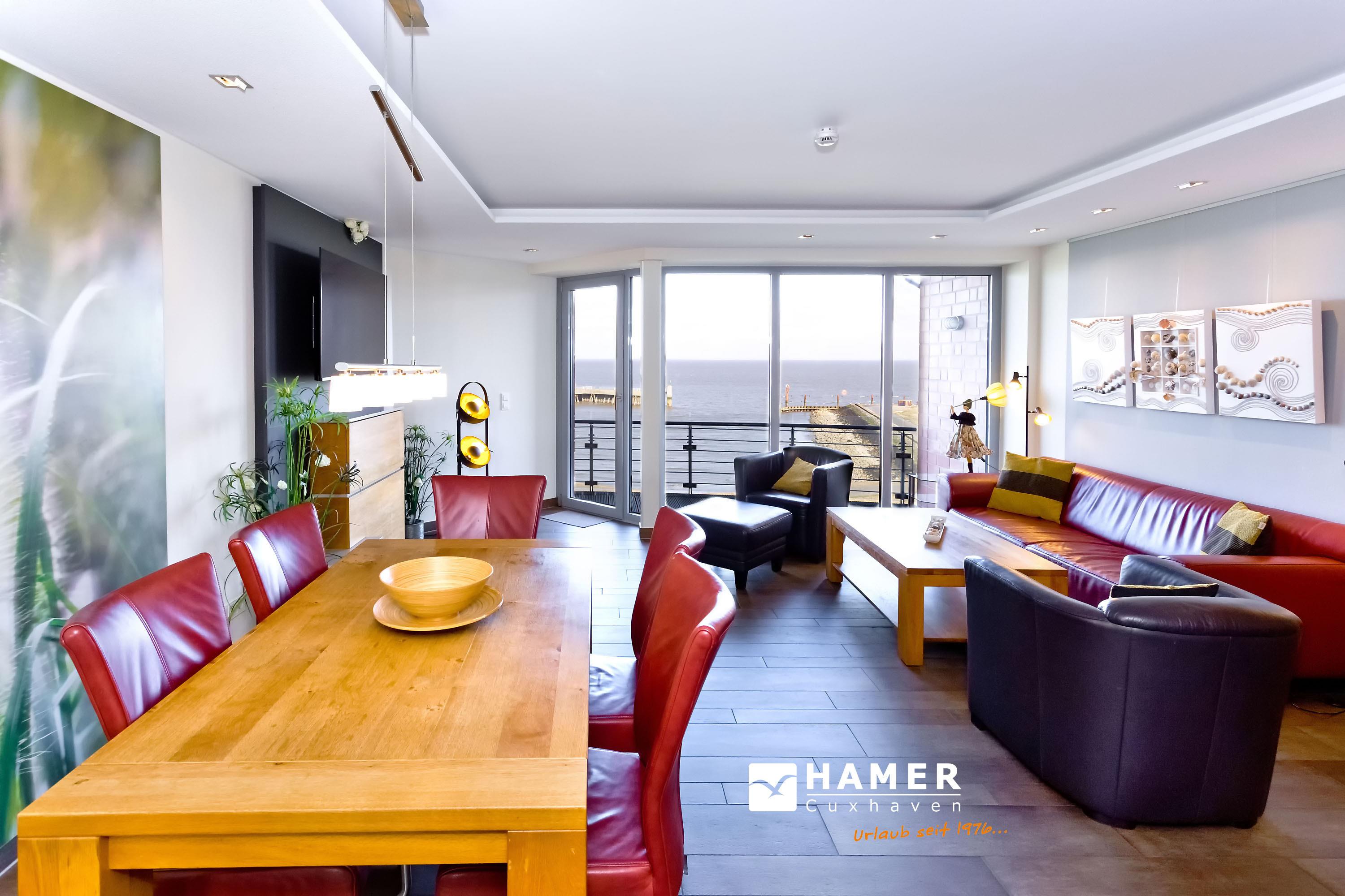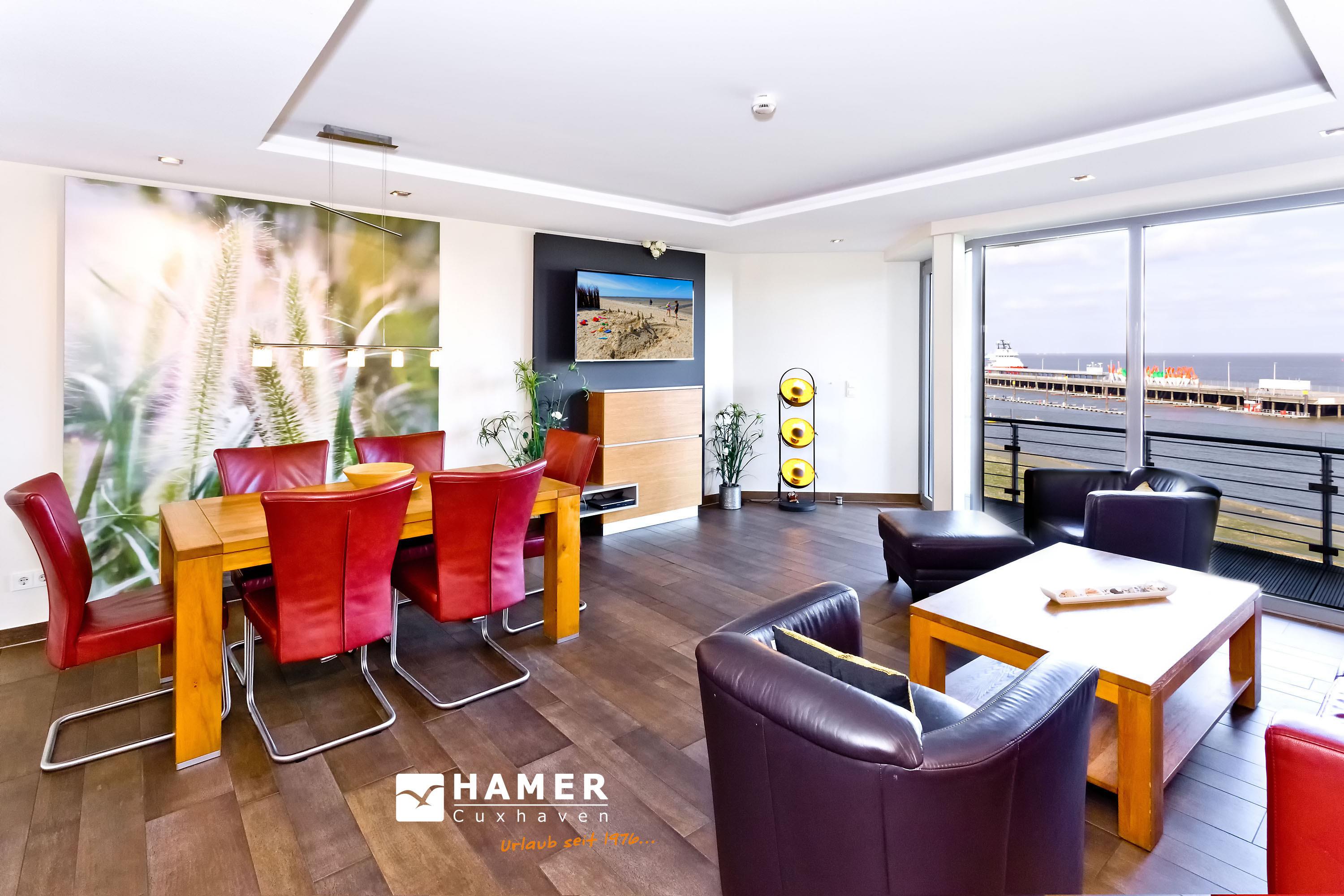 Sehr geschmackvolle, tolle Wohnung in der 3.Etage über 102m². Hier haben Sie den Traumseeblick auf die vorbeiziehenden Schiffe. 1 Schlafzimmer mit Doppelbett TV, 1 Schlafzimmer mit Einzelbetten, beide Schlafzimmer mit Rollladen, Du/Wc, Bad//Wc, großes Wohnzimmer TV/DVD, offene u. vollständige Miele-Küche, 1 Balkon (nord) mit Blick auf die Elbe, 1 Balkon (süd) mit Blick auf den Hafen, alle Räume sind hochwertig gefliest. Zur Wohnung gehört je ein reservierter Stellplatz in der Tiefgarage und auf dem Außengelände. Nichtraucher, keine Haustiere.
