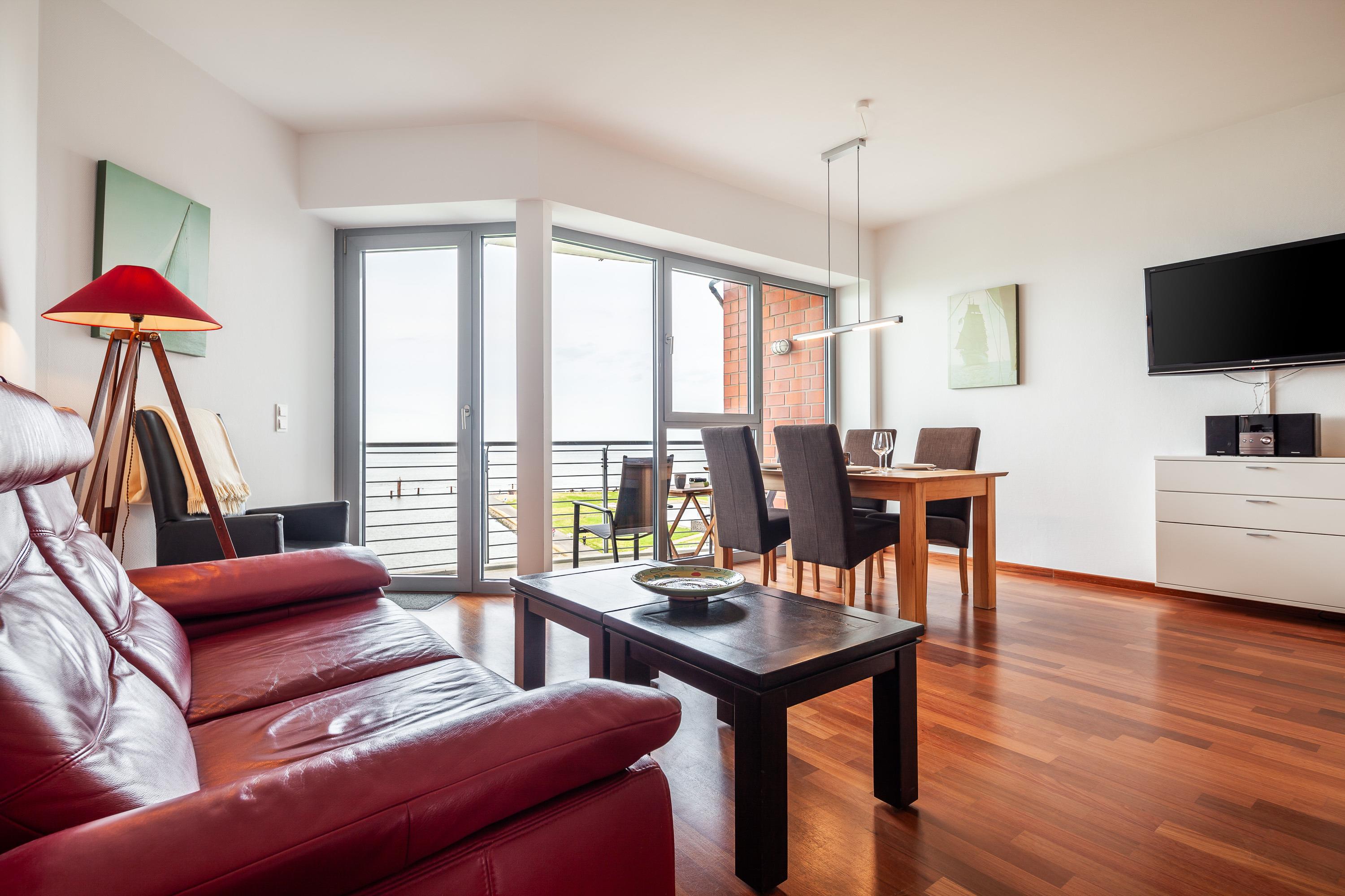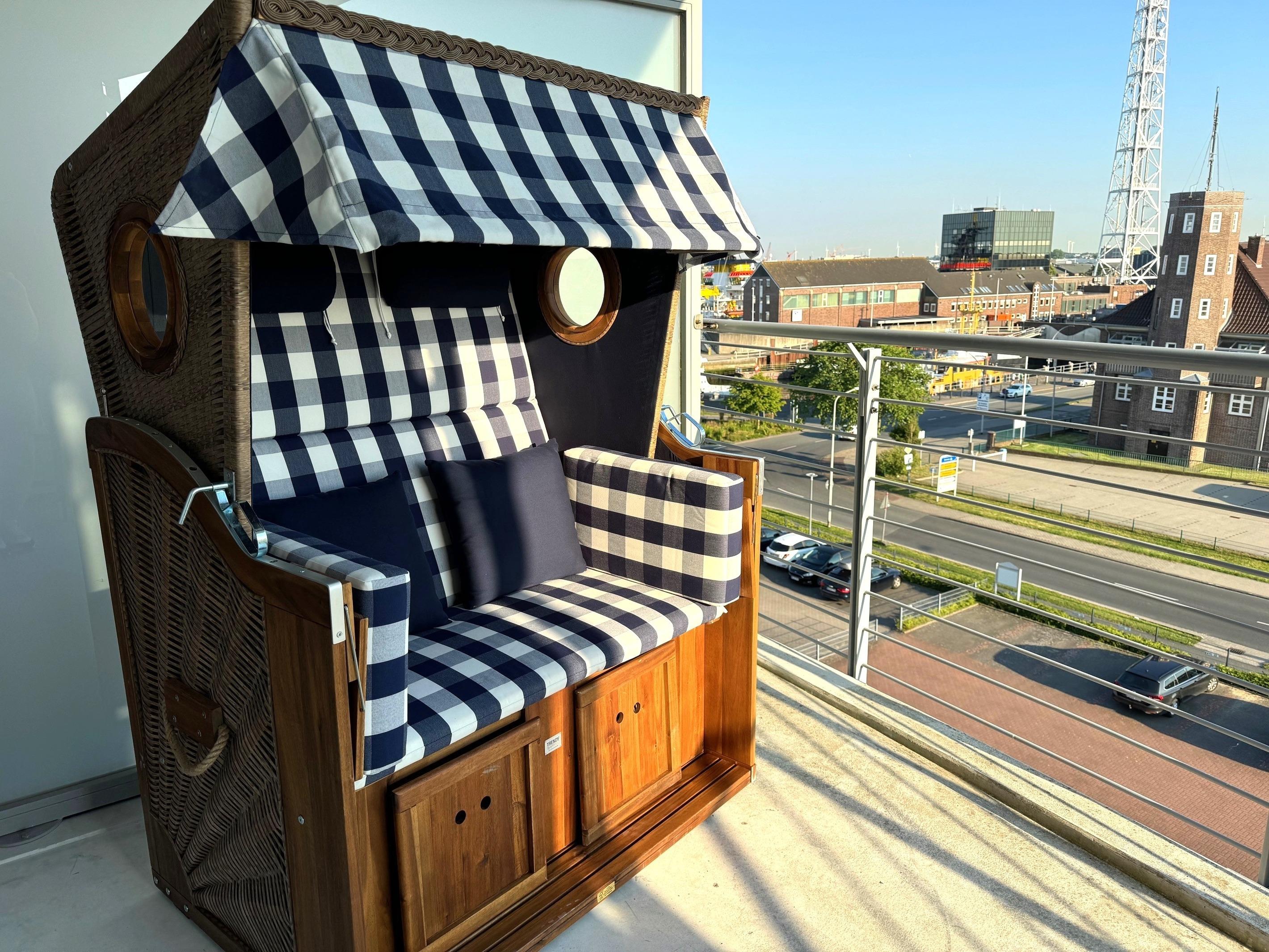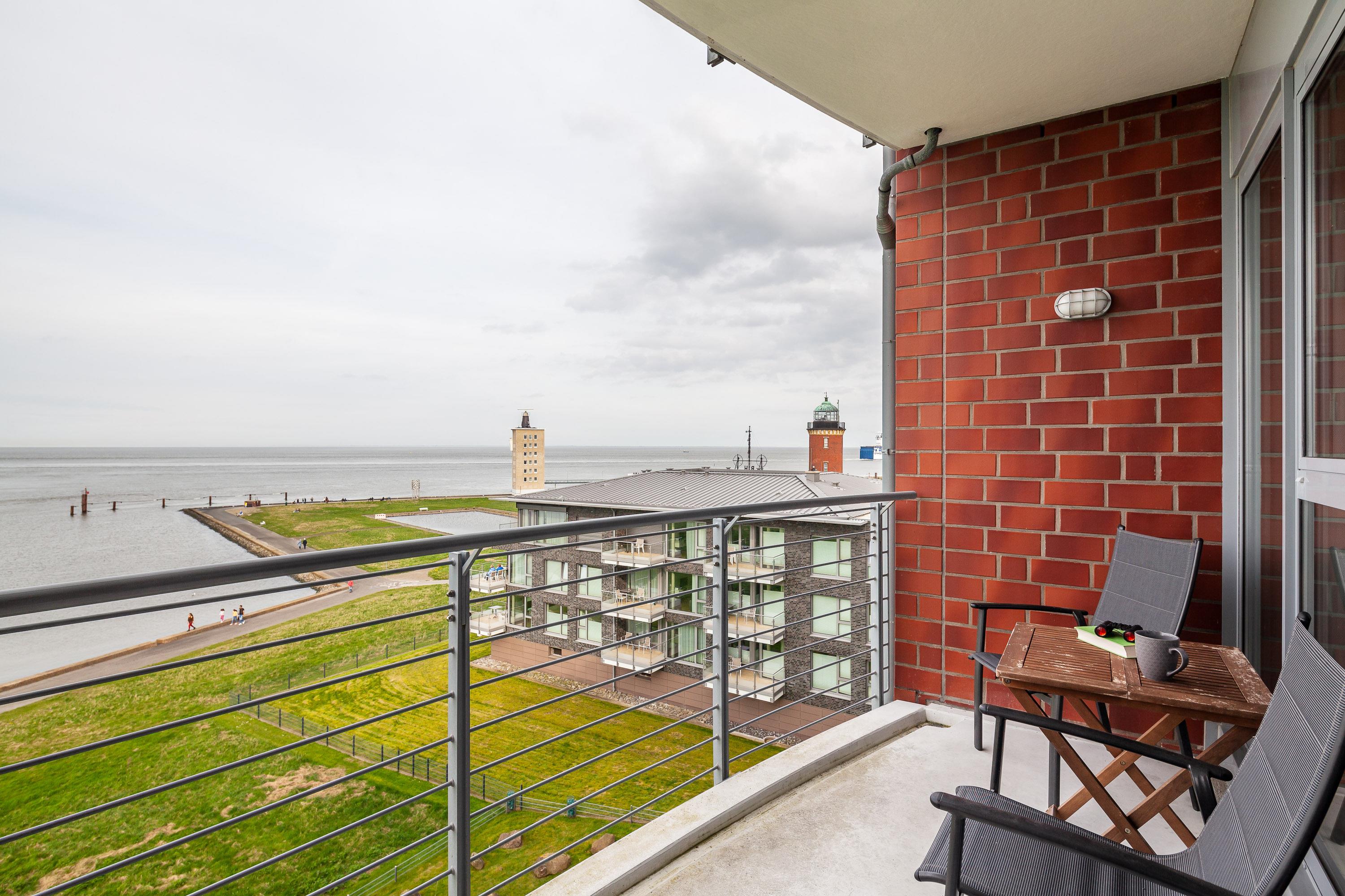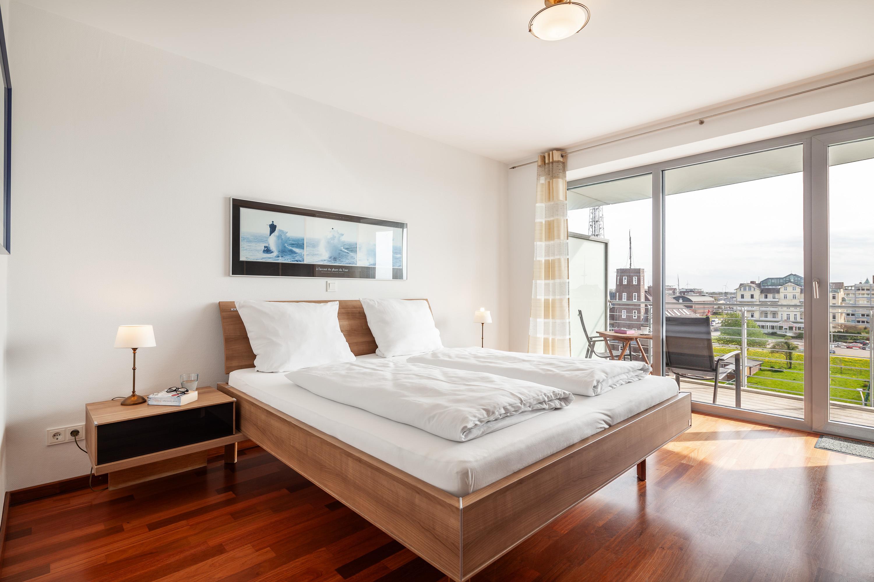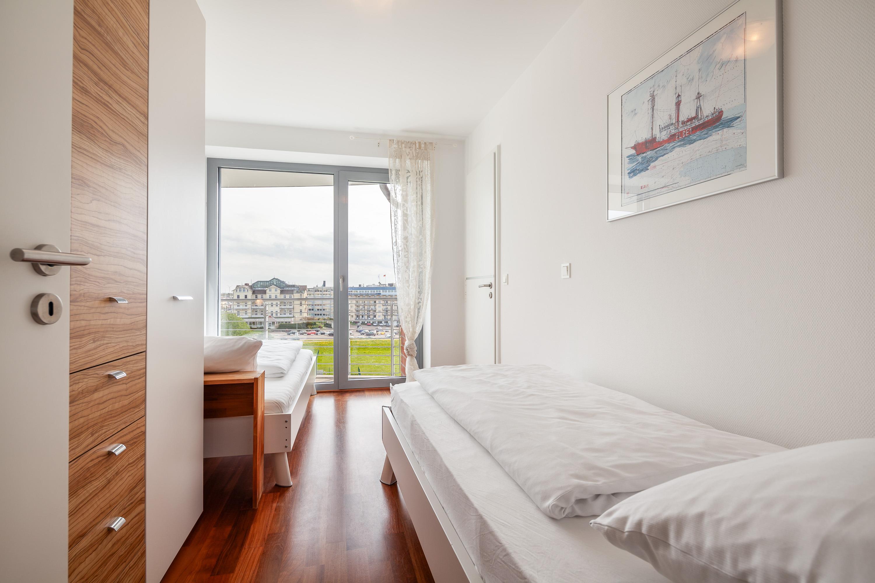 Sehr geschmackvolle 3-Raum-Wohnung in der 4. Etage mit dem atemberaubenden Blick auf die Elbmündung. Großes Wohnzimmer mit offener, voll ausgestatteter Küche, Esstisch, Balkon zur Seeseite, 1 Schlafzimmer mit Doppelbett, 1 Schlafzimmer mit zwei Einzelbetten, beide Schlafzimmer haben Zugang zum sonnigen Südbalkon mit Strandkorb. 1 Bad/Du/Wc, 1 Du/Wc, reservierter Pkw-Stellplatz auf dem Außengelände, Nichtraucher, keine Haustiere.