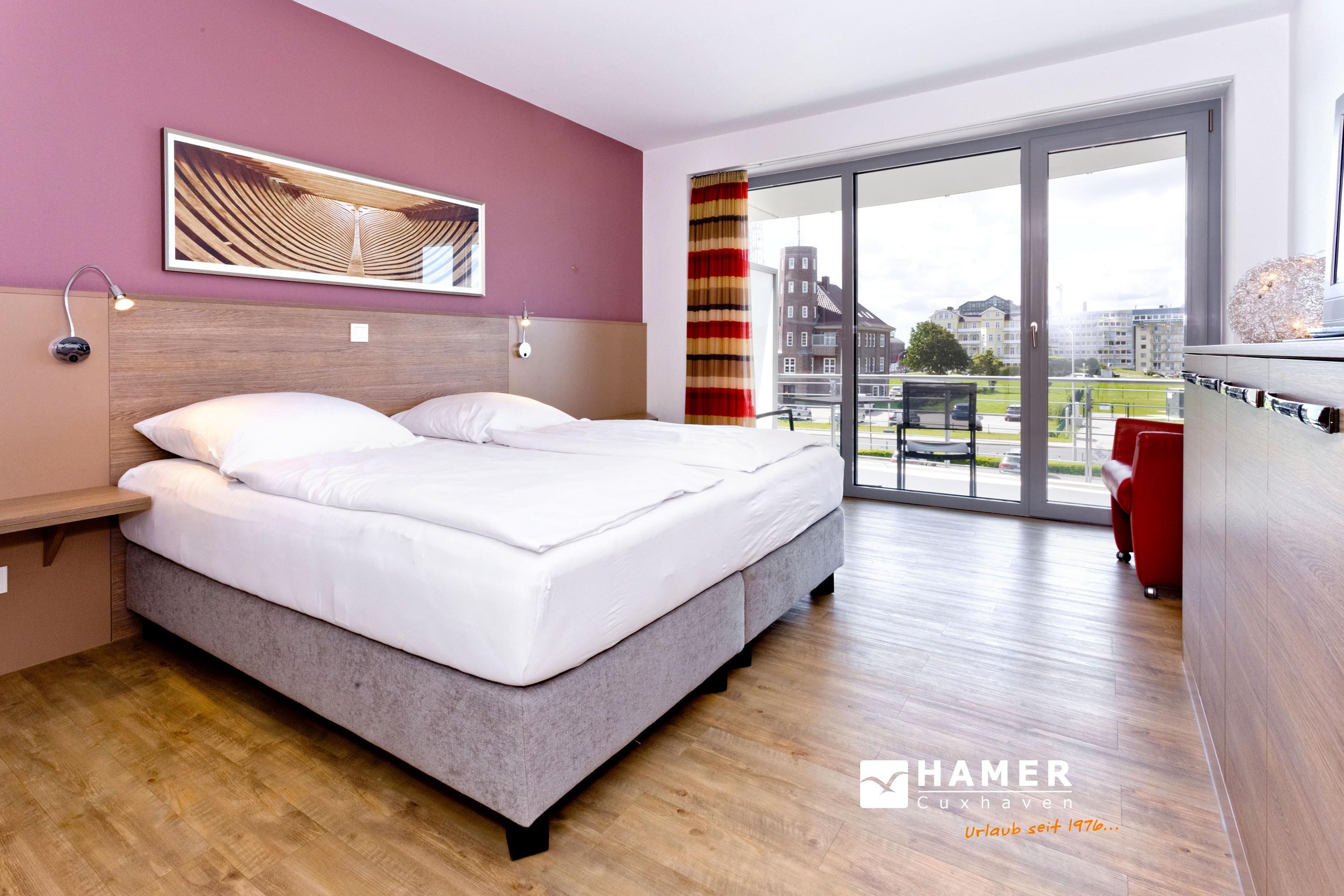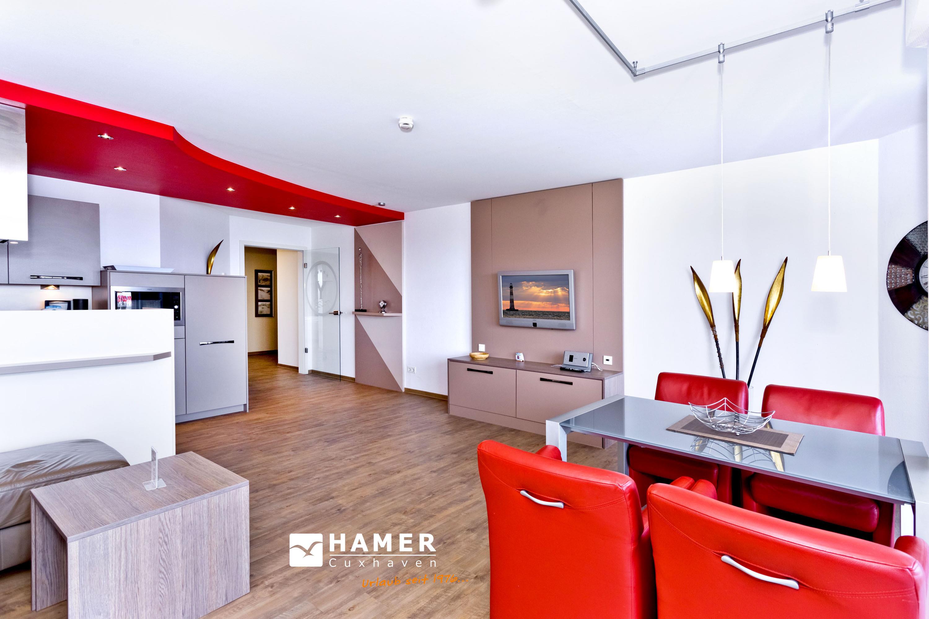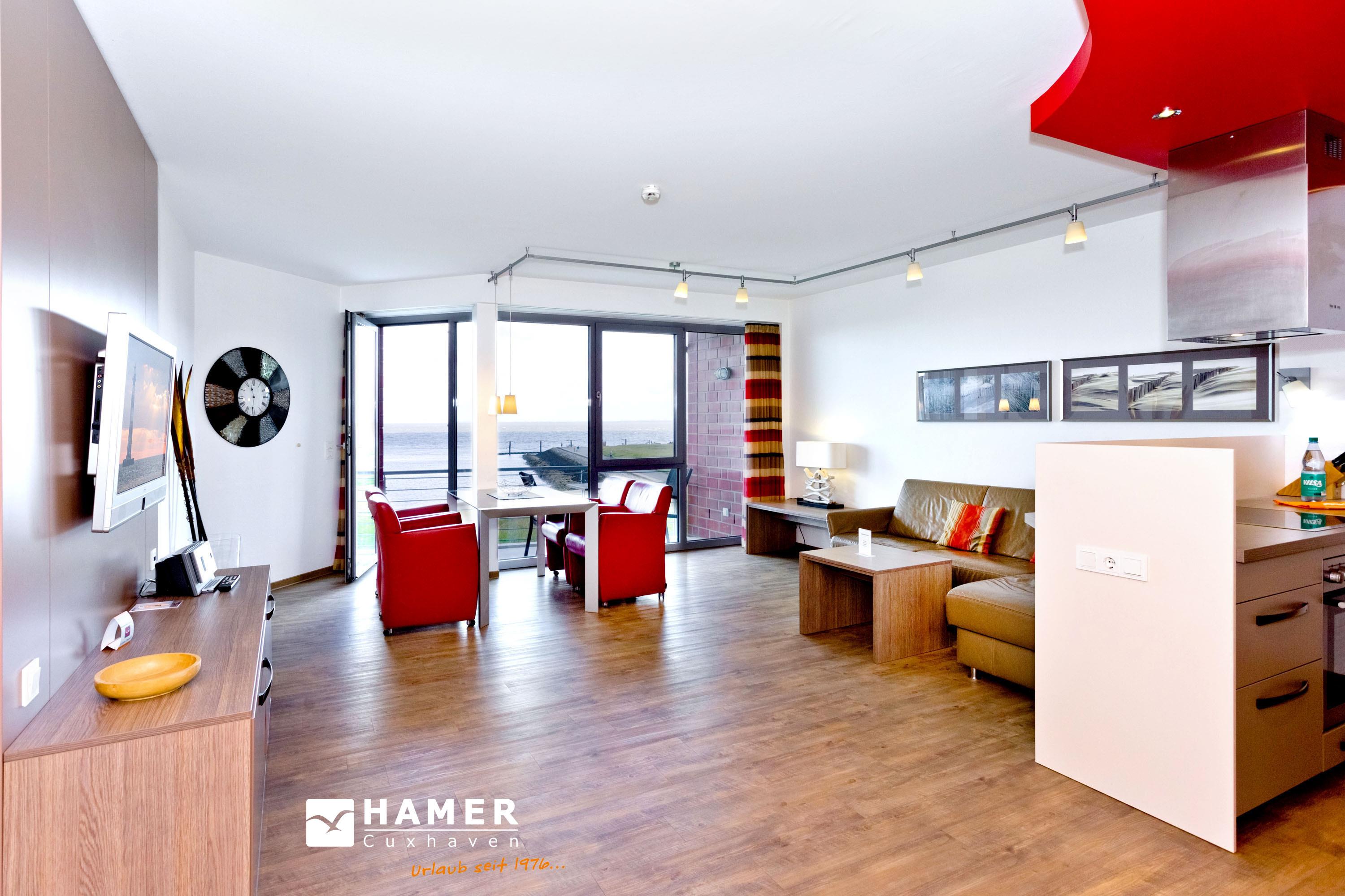 Sehr geschmackvolle Wohnung in der 1.Etage auf 102 m² mit voller Traumseesicht auf den Weltschifffahrtsweg und die Hafenanlagen. 1 Schlafzimmer mit Doppelbett (Boxspringbett) und TV, 1 Schlafzimmer mit 2 Einzelbetten, beide Schlafzimmer mit Rollläden, 1 Du/Wc und 1 Gäste-Wc, Föhn, großes Wohnzimmer mit komplett ausgestatteter Küchenzeile, TV, CD, 2 große Balkone (nord+süd). Zur Wohnung gehört ein reservierter Pkw-Stellplatz am Haus. Keine Haustiere. Nichtraucher. Fahrräder können auch bequem und sicher im ebenerdigen Fahrradraum des Nachbargebäudes abgestellt werden (separater Schlüssel).