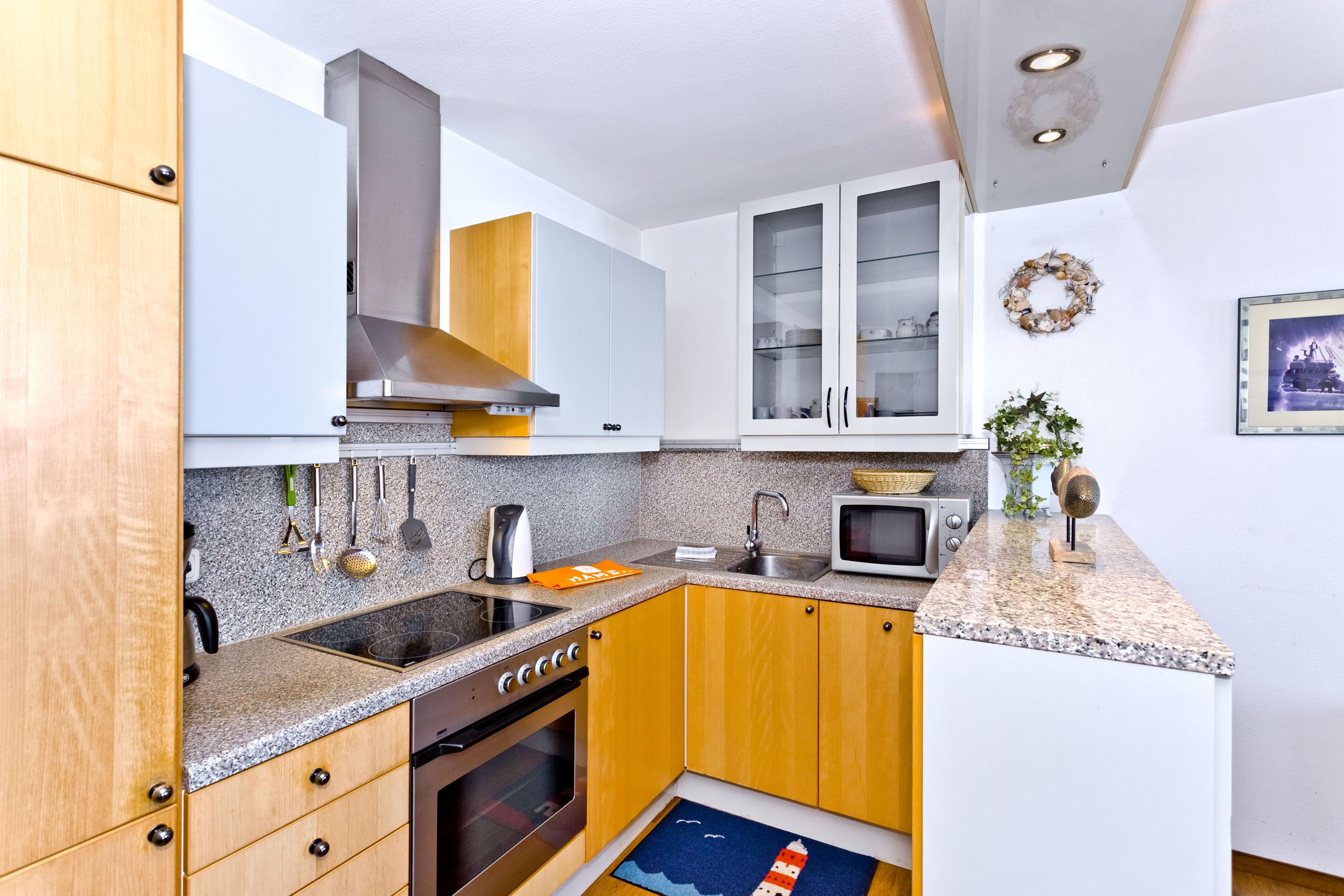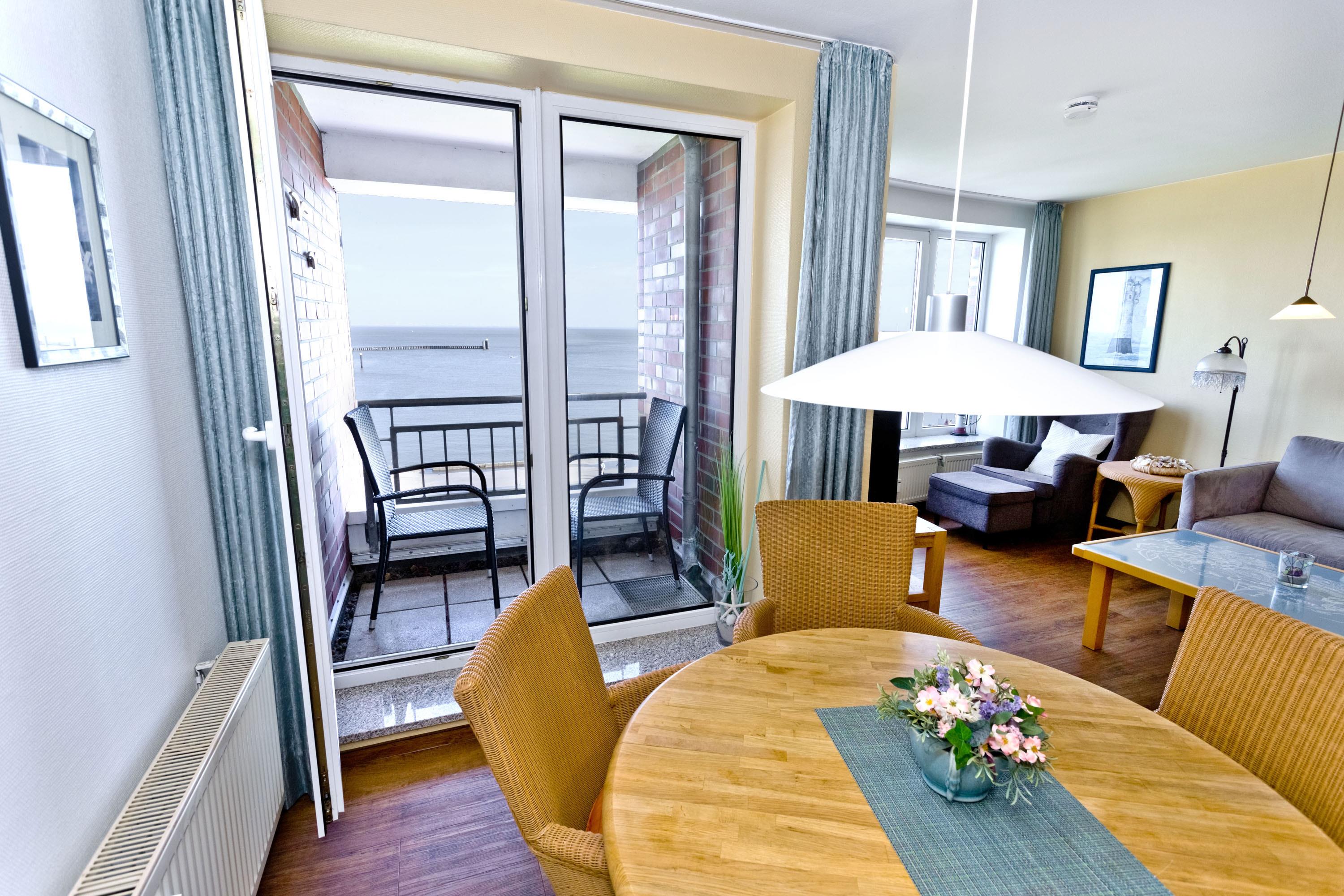 Schöne 2-Raum-Ferienwohnung für 2 Personen über ca. 50m² mit Sicht auf die Elbmündung. 3.Etage mit Aufzug, Schlafzimmer mit Doppelbett (2x75x190) und Rollladen, komplette Küchenzeile (Geschirrspüler, Mikrowelle etc.) Wohnzimmer mit Sofa, Kabel-TV, kostenfreies W-LAN, Esstisch, kleiner Balkon zur Seeseite (nord), nummerierter Pkw-Stellplatz #36 am Haus.