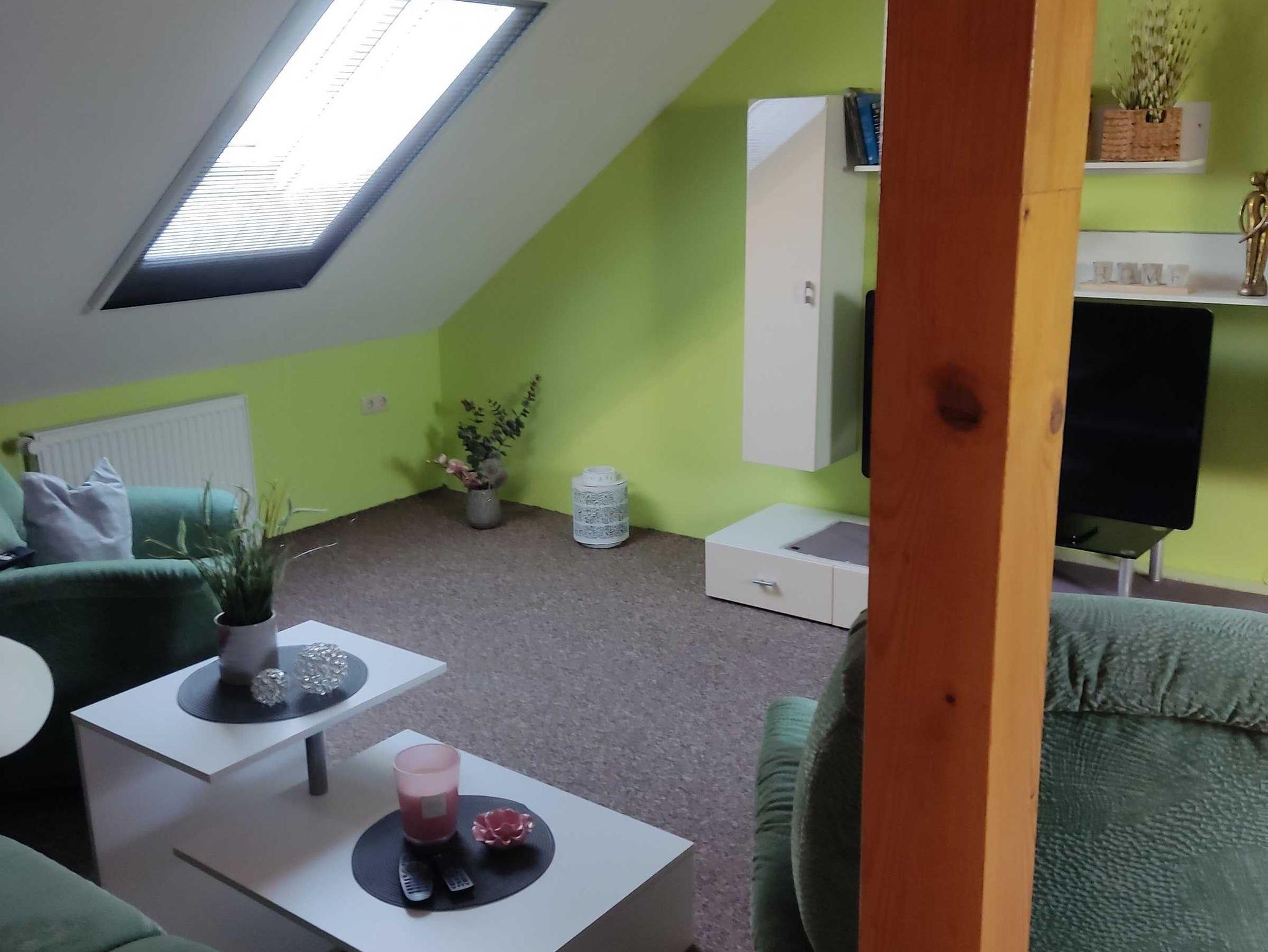 Unsere Dachgeschoss Ferienwohnung mit seinen 80 m² verfügt über einen Wohnraum mit Sitzecke, einen Flachbild TV, einem Esstisch sowie zwei Relaxsesseln.