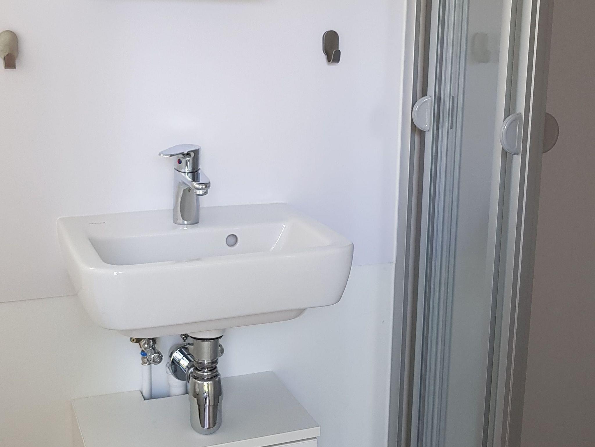 Im Badezimmer finden Sie eine Duschkabine sowie ein Waschbecken und WC.