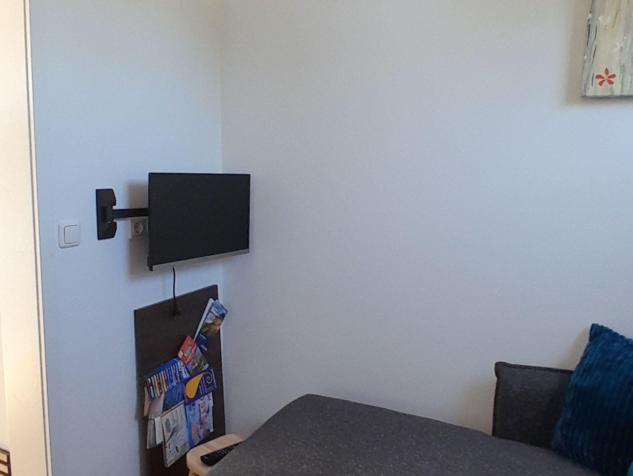Ein Wohnzimmer mit ausziehbarer Schlafcouch, welche Platz für gemütliche Abende bietet. Lesen, träumen, spielen. Der Fernseher wird mit Internet TV betrieben, WLAN ist im Tiny ebenfalls verfügbar.