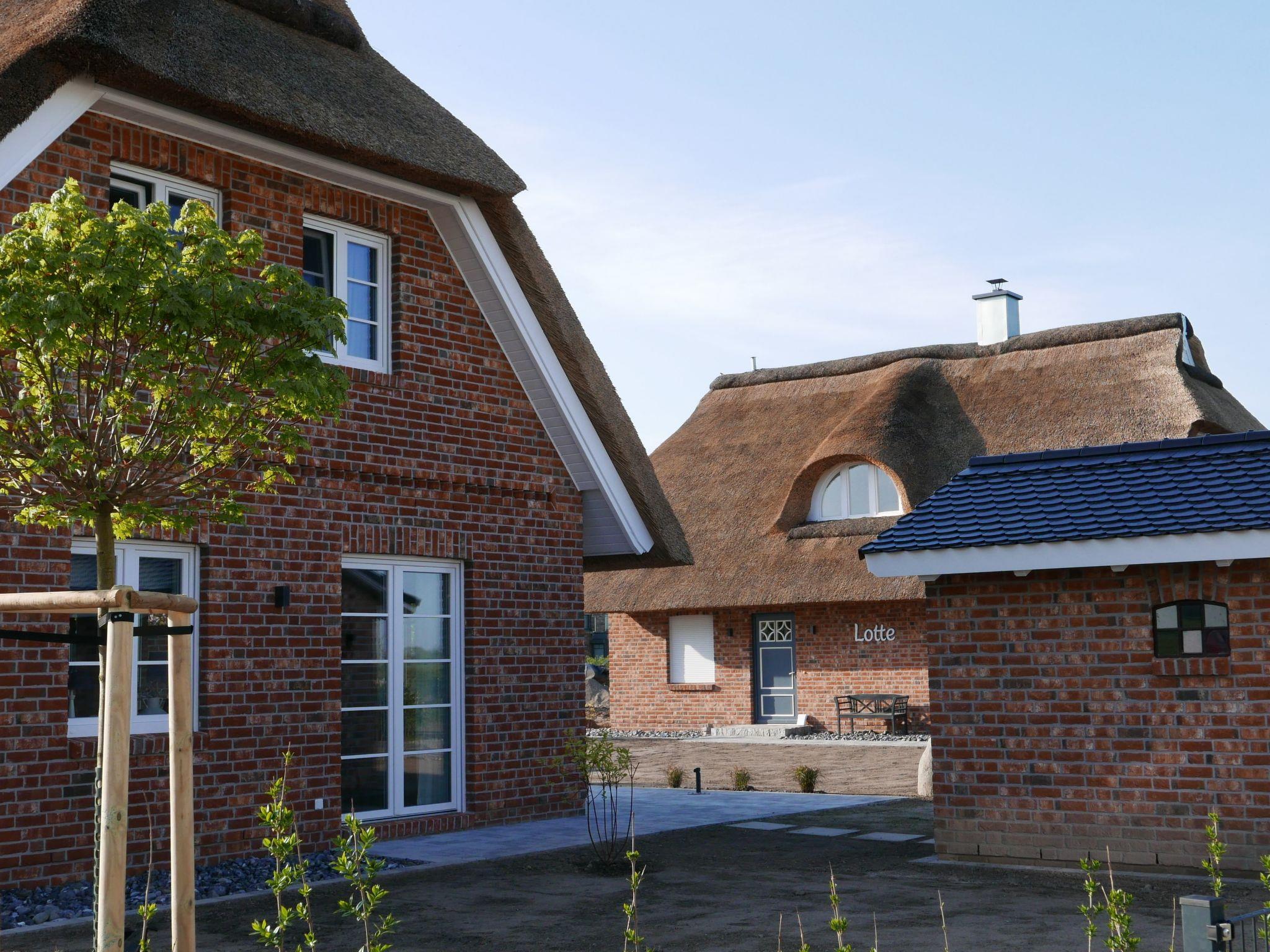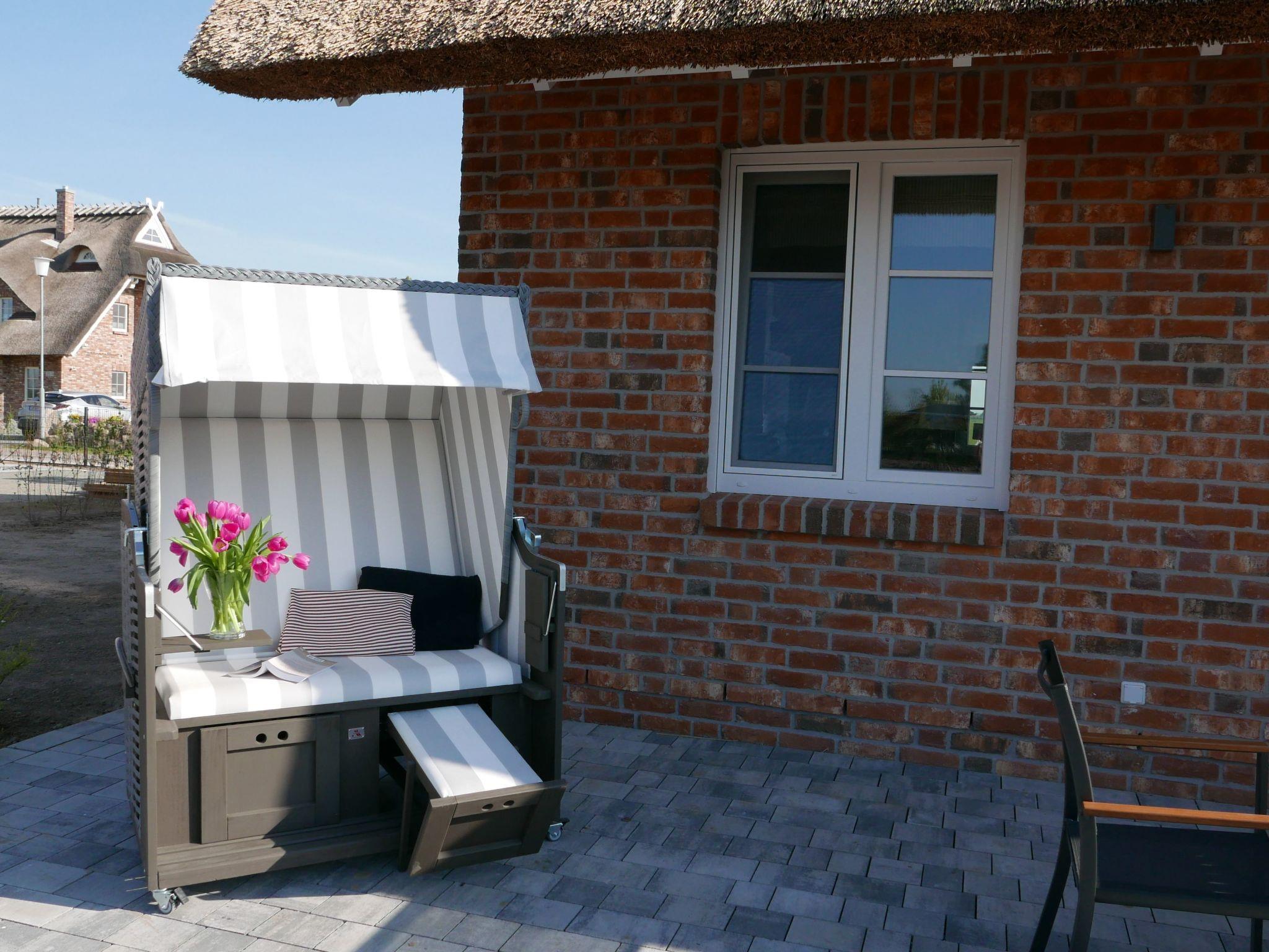 The outdoor area of the thatched house promises relaxation and shared moments. Enjoy sunny hours on the terrace, equipped with a garden table, chairs, lounger, two parasols and a beach chair. A gas barbecue is available for culinary evenings and there is a lockable garden shed in the 1000 m² garden. A small playground for the children and parking facilities for two cars including an electric charging station round off the offer.