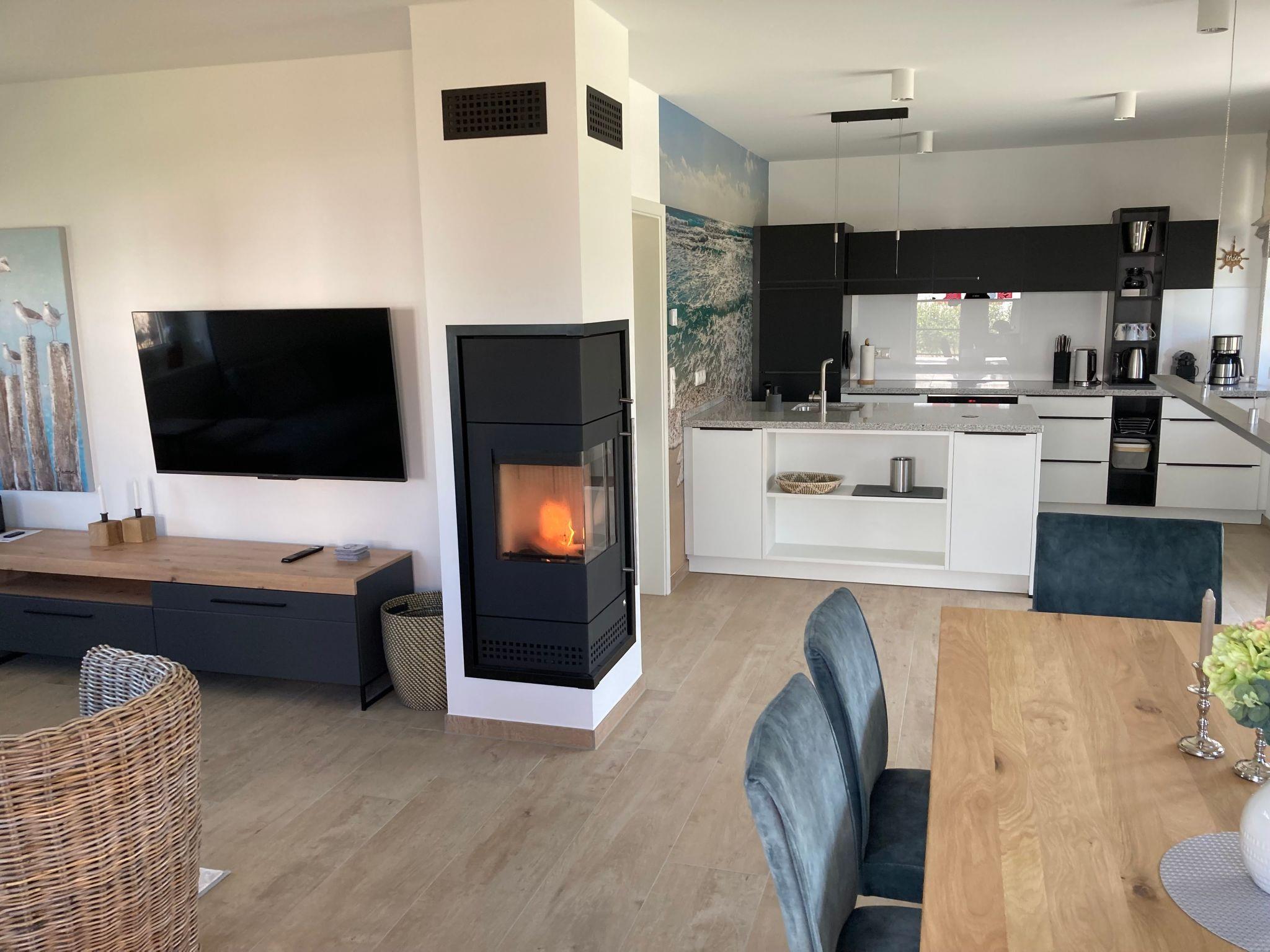 Inside the thatched house, a comfortable ambience awaits you on two fully heated floors with a total living space of approx. 125 m². Underfloor heating ensures cosy warmth throughout. The high-quality furnishings include a fully equipped kitchen with cooking island, a spacious living and dining area with wood-burning stove and modern electronics. For pure relaxation, there is a sauna area as well as a bathroom with shower on the ground floor and an additional bathroom on the upper floor. Three cosy bedrooms with double beds guarantee a restful night's sleep. The house is ideally equipped for families with children, including a stair gate, safety gate, two highchairs, a TrippTrap and a travel cot.