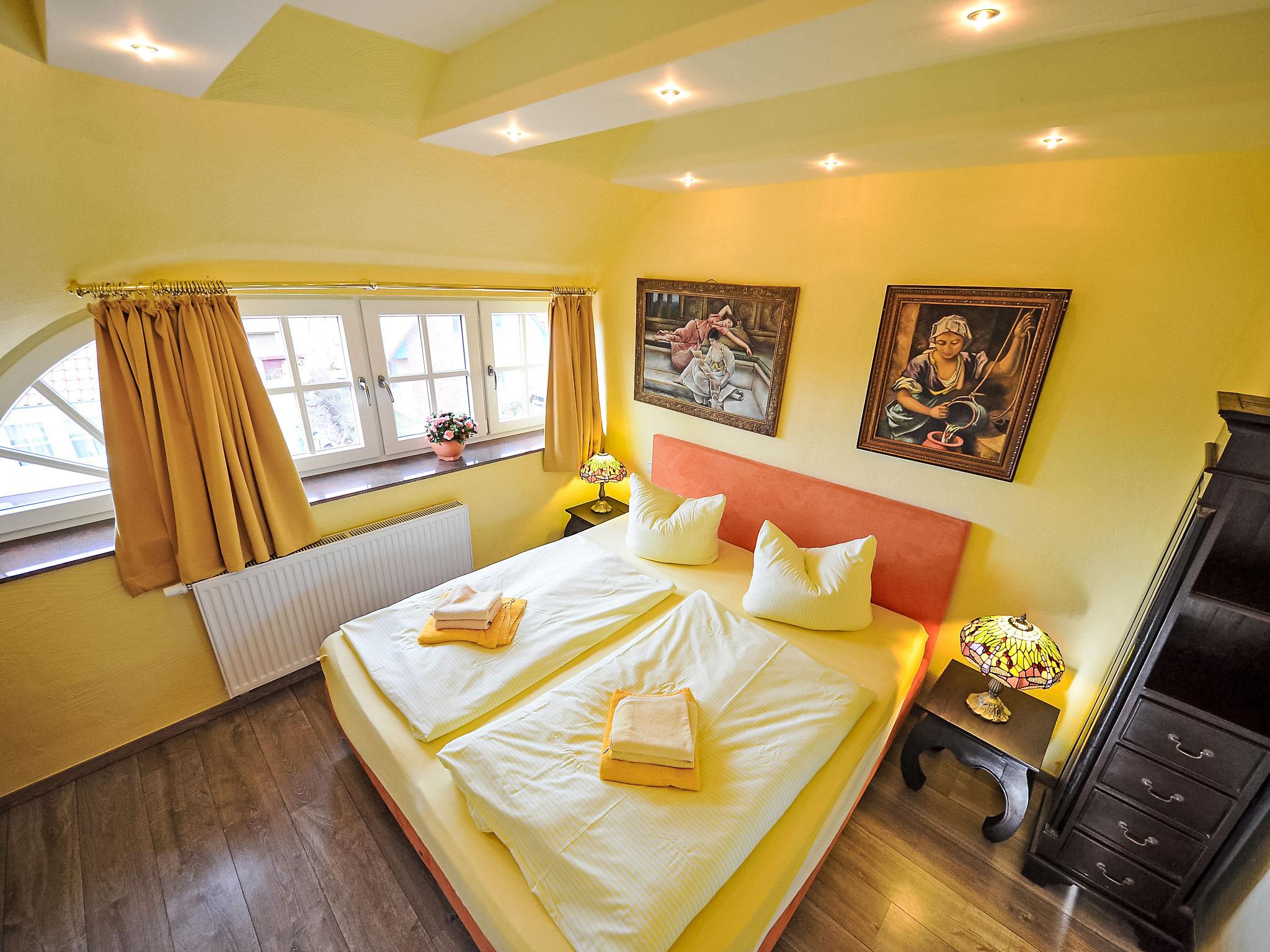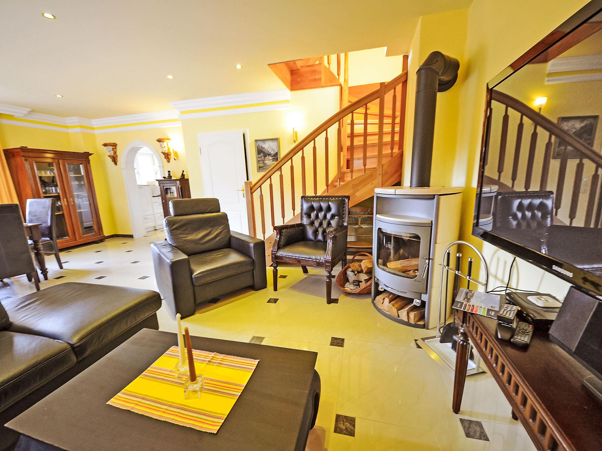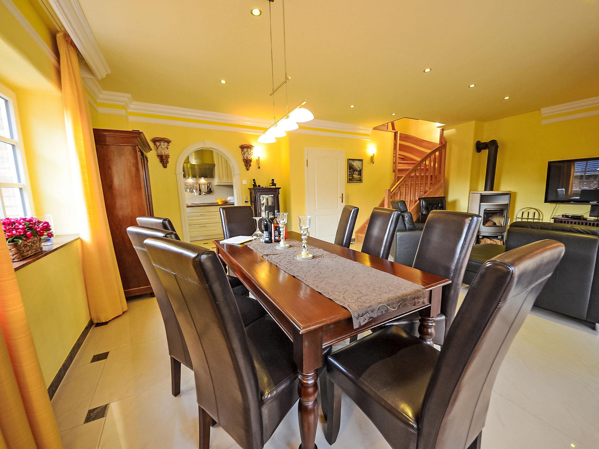 "Bel Air", 5-room semi-detached house 140 m2 on 3 levels, on the ground floor. Comfortable and tasteful furnishings: living/dining room with Scandinavian wood stove and satellite TV (flat screen), video and hi-fi system. Exit to the garden, to the terrace. Open kitchen (oven, dishwasher, 4 ceramic glass hob hotplates, microwave, electric coffee machine). Shower/WC. Floor heating. Upper floor: 2 double bedrooms. 1 double bedroom with bath/bidet/WC and satellite TV. Shower/bidet/WC. Top floor: 1 double bedroom with sloping ceilings with shower/WC. Terrace partly roofed. Terrace furniture, barbecue. Facilities: washing machine, dryer, sauna, children's high chair, logs (free). Internet (WiFi, free). Parking (2 cars) at the house. Please note: non-smoking house. Maximum 1 pet/ dog allowed. Smoke alarm, fire extinguisher. Some rooms on the first floor offer views of the coast and the yacht harbour. On request and after pre-order a third parking space can be provided for EUR 4.00 / day.