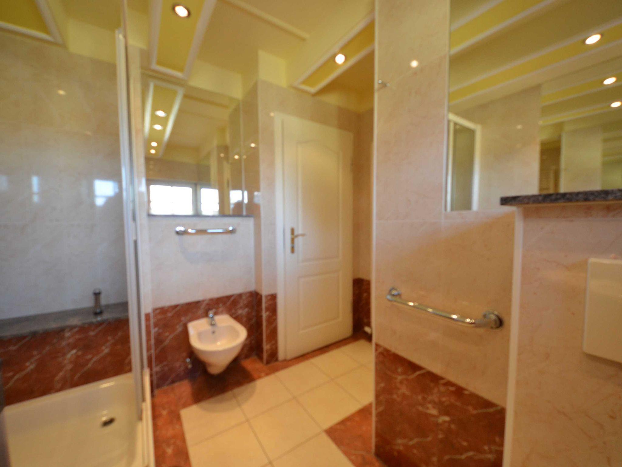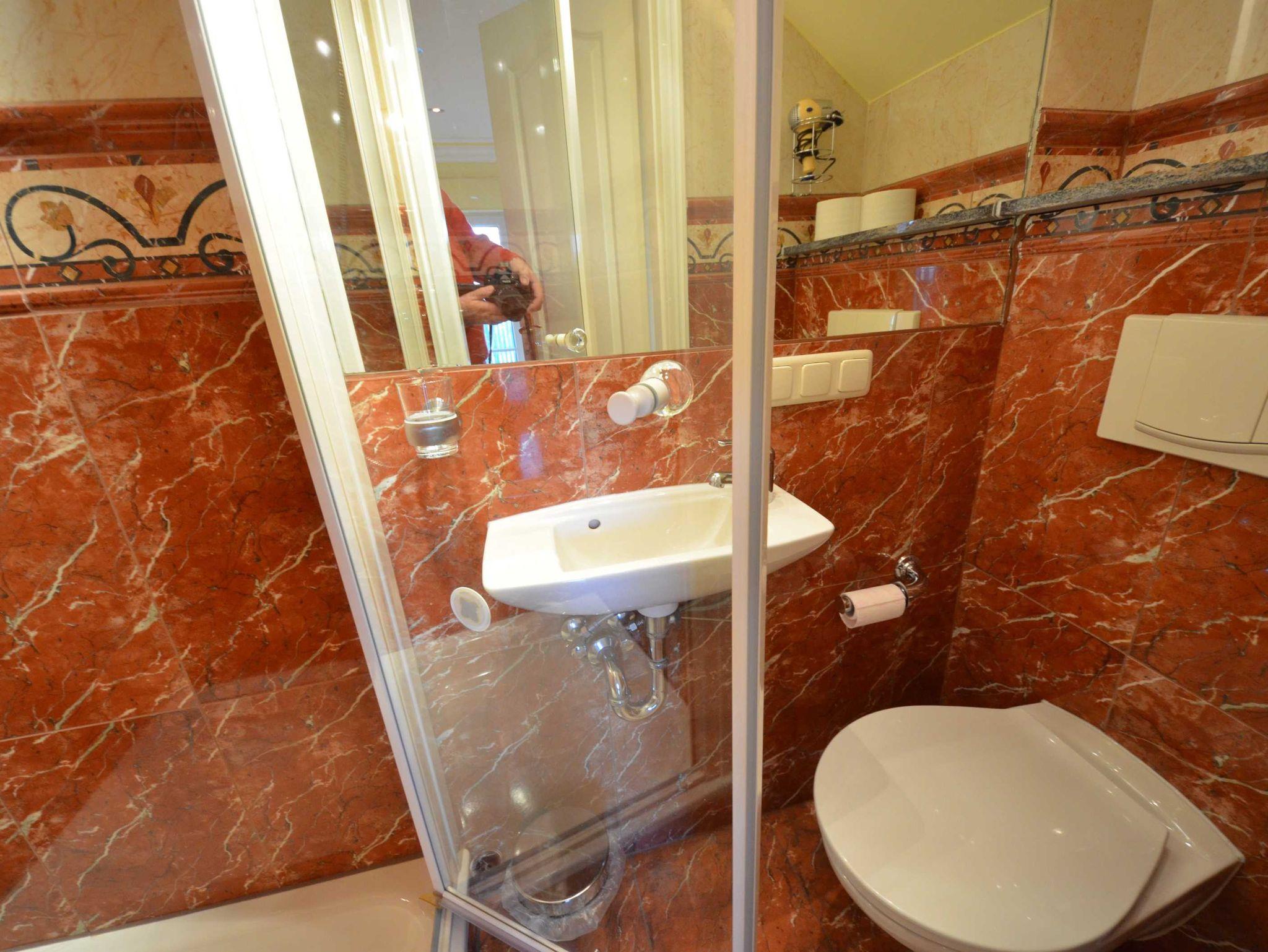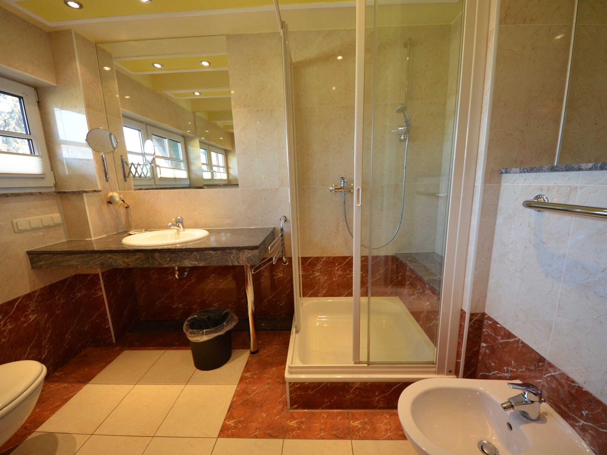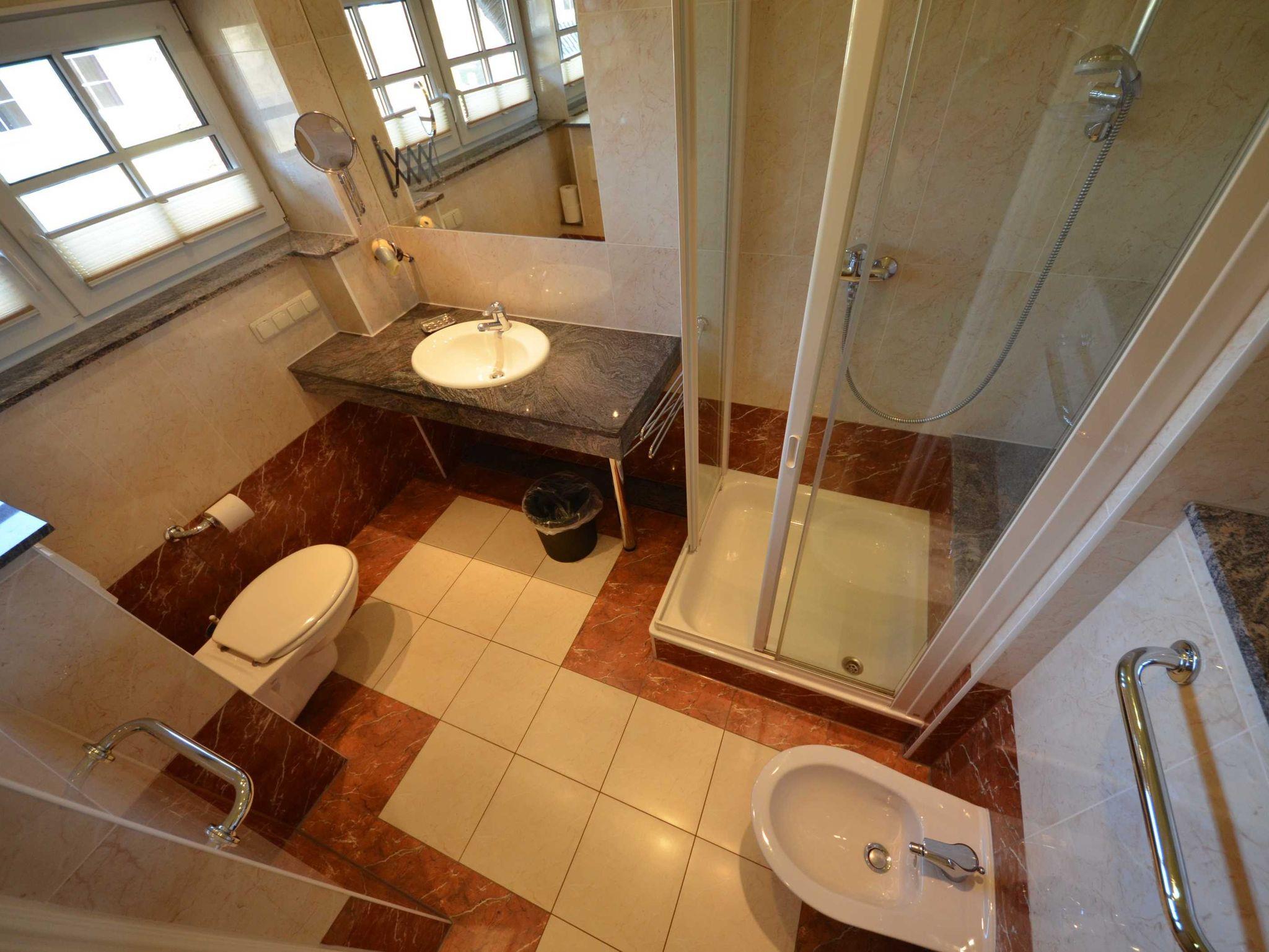 Badezimmer mit Fußbodenheizung, Natursteinverkleidung, große Spiegel, schöne Sanitärausstattung,beheizbarer Handtuchhalter,Bidet, Fön, Schminkspiegel, Glas-Dusche
