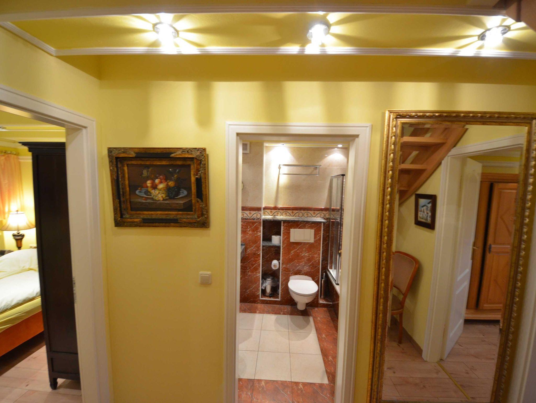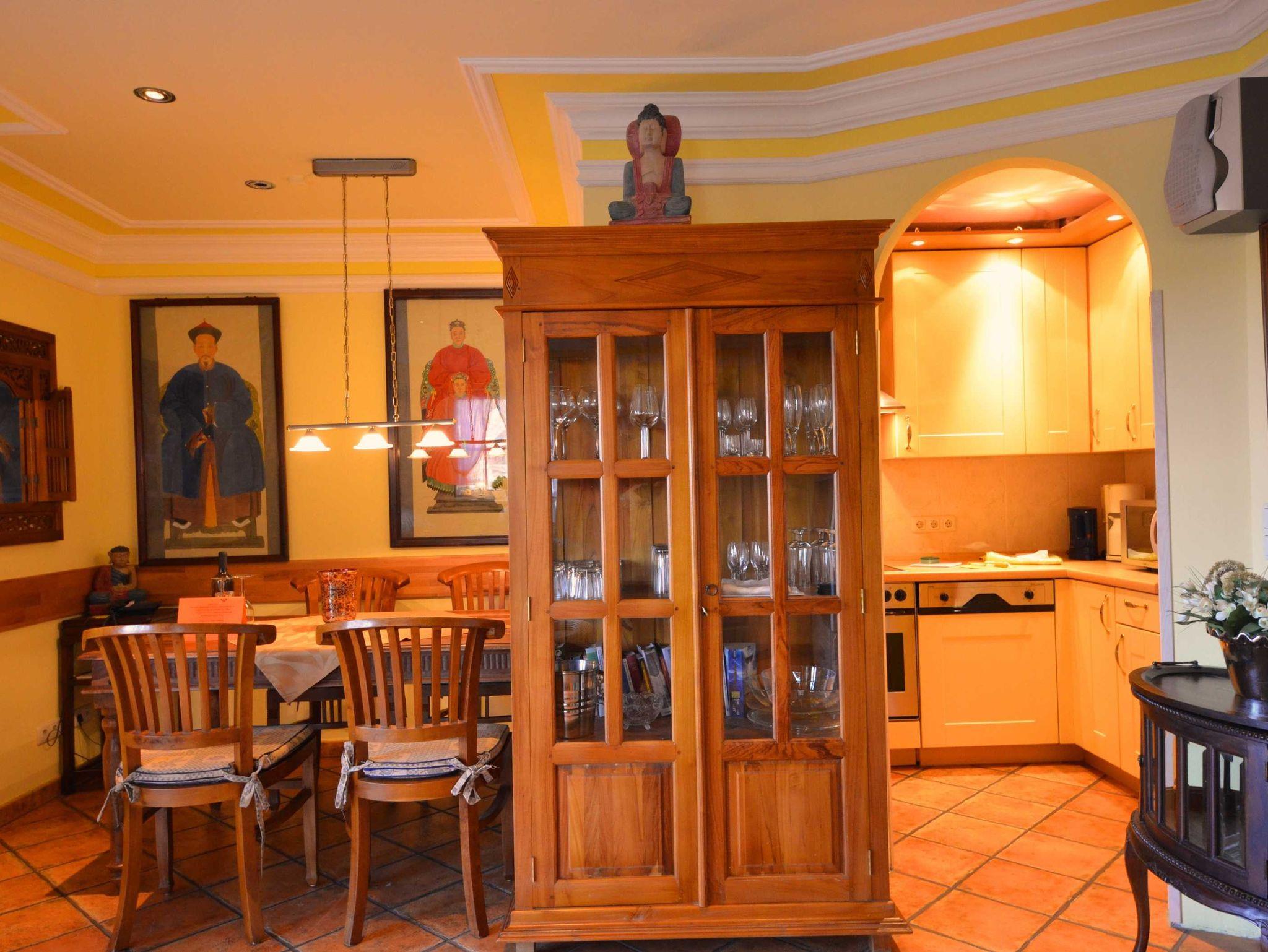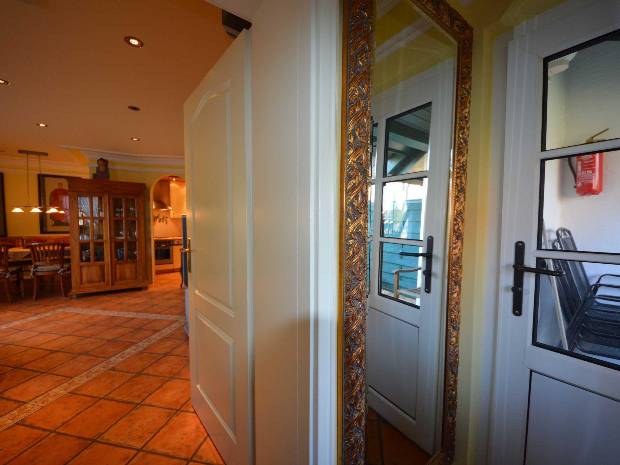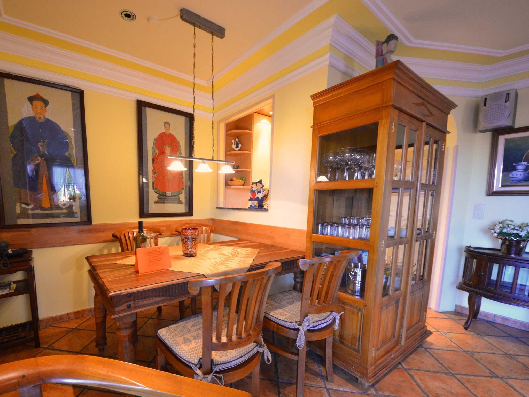 2 Bäder, Fußbodenheizung, schön eingerichtetes Wohn- Esszimmer, Couchgarnitur mit Leder bezogen, Opiumtisch, Speisetafel mit Stühlen, Geschirrschrank, Sat - TV, Telefon, Spiegel pp.
