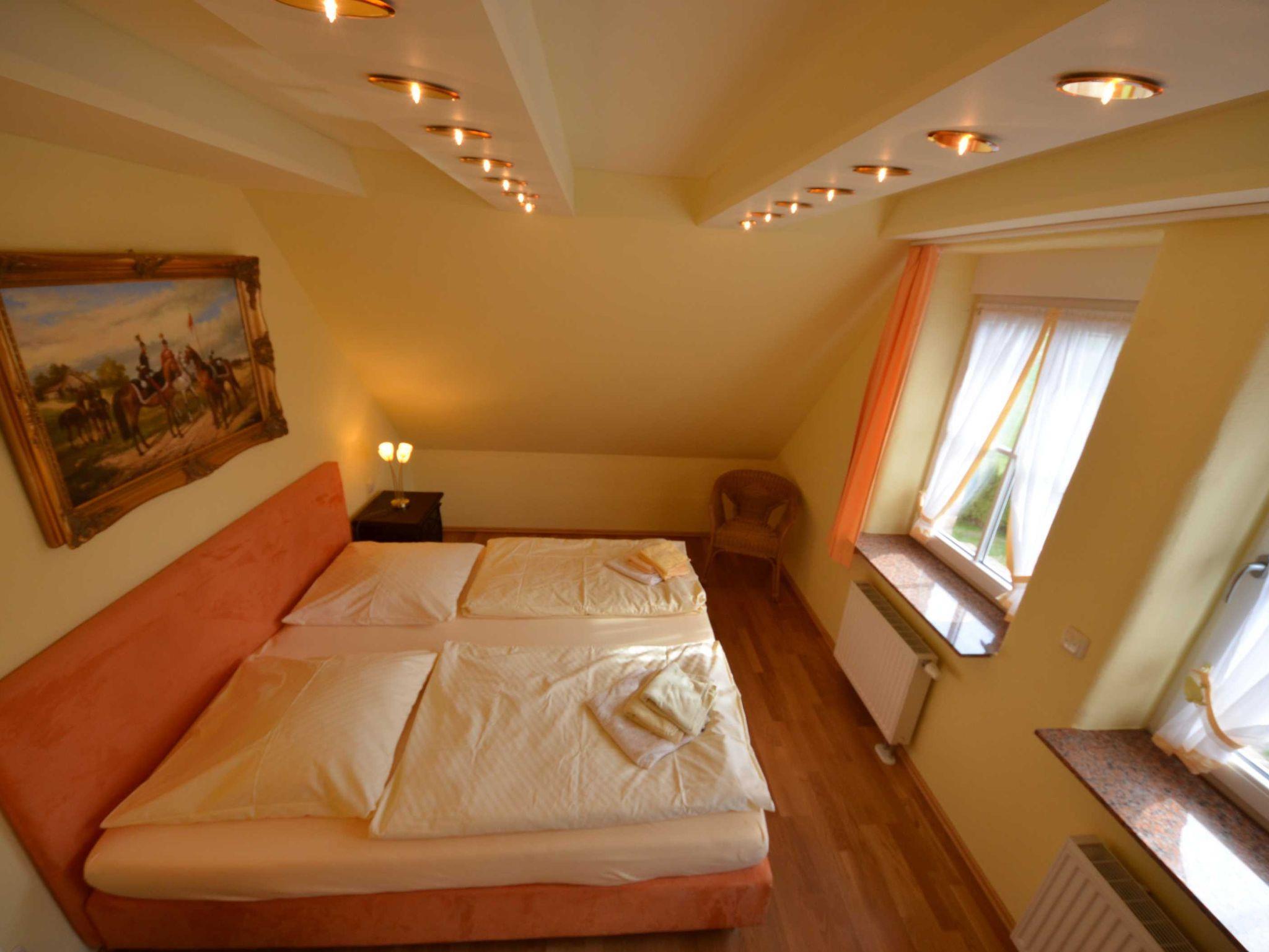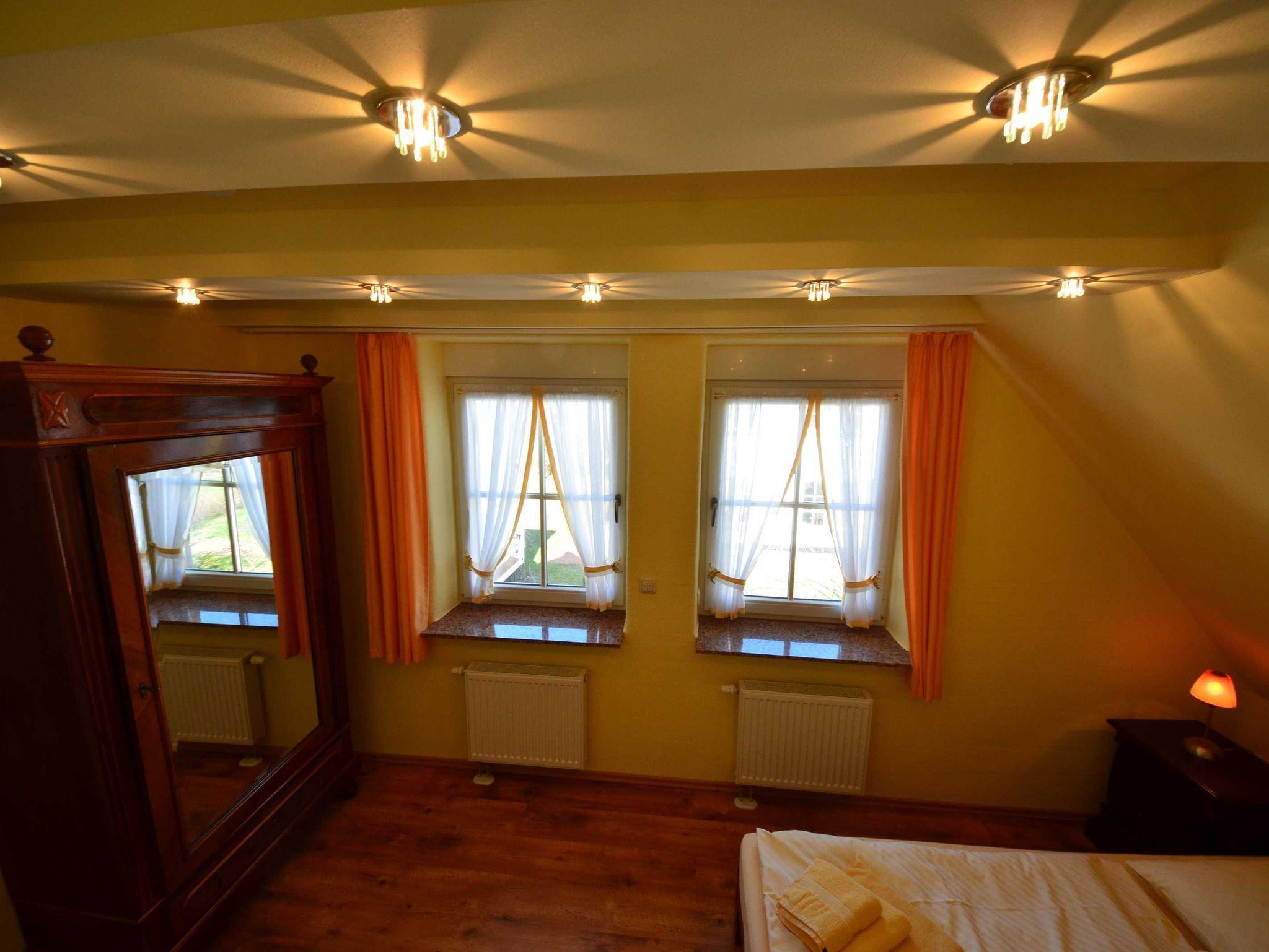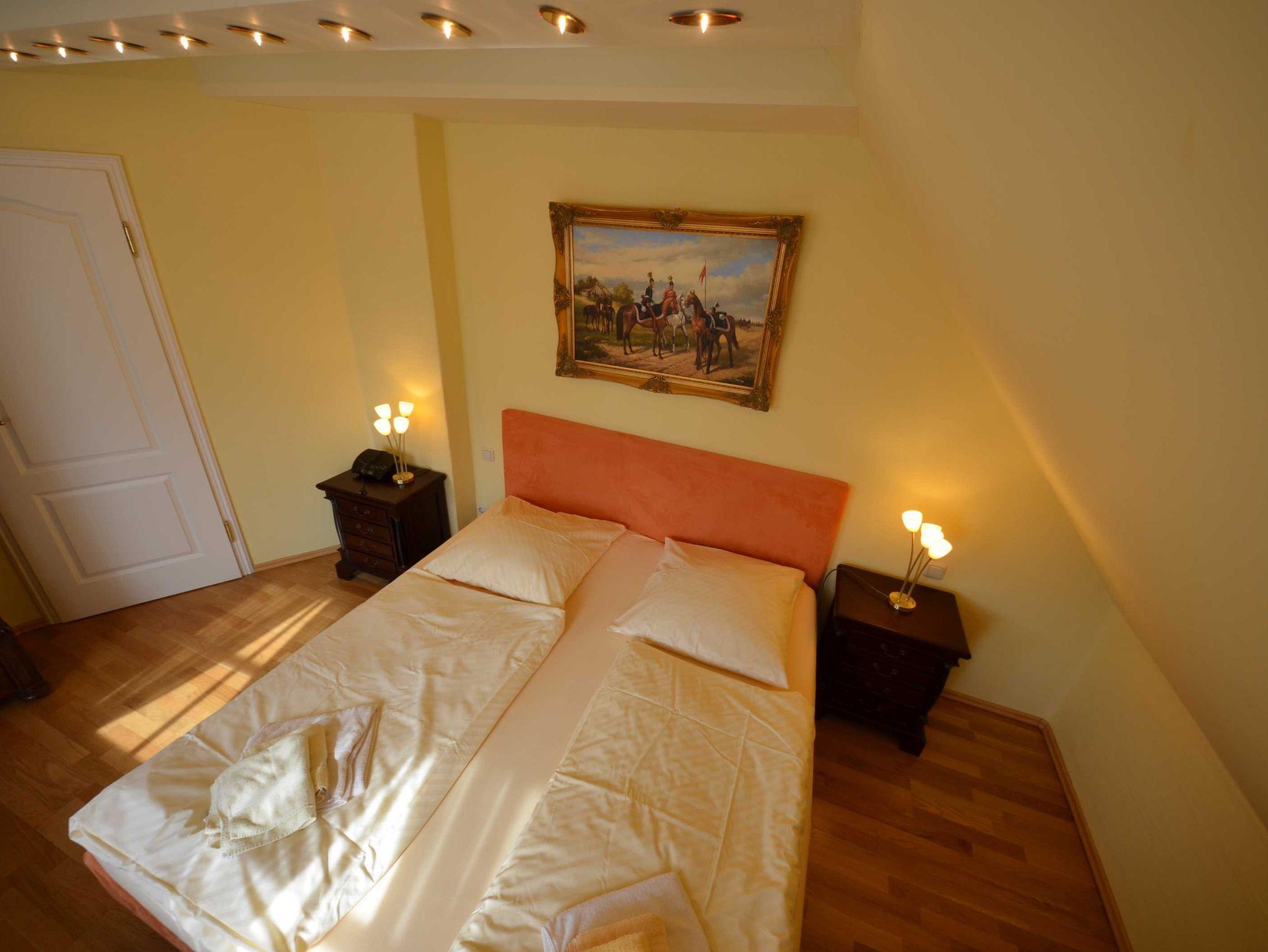 Ein Schlafzimmer mit 1,80 x 2,00 m Bett und zwei Schlafzimmer mit jeweils 1,60 x 2,00 m Bett, Radiowecker, Wände mit Bildern dekoriert, antiker Gründerzeit-Wäsche-/Kleiderschrank, elektrische Rolläden, Fenster mit Mückenschutz. Nach Voranmeldung: ein Babyreisebett (kostenlos) mit Bettwäsche.