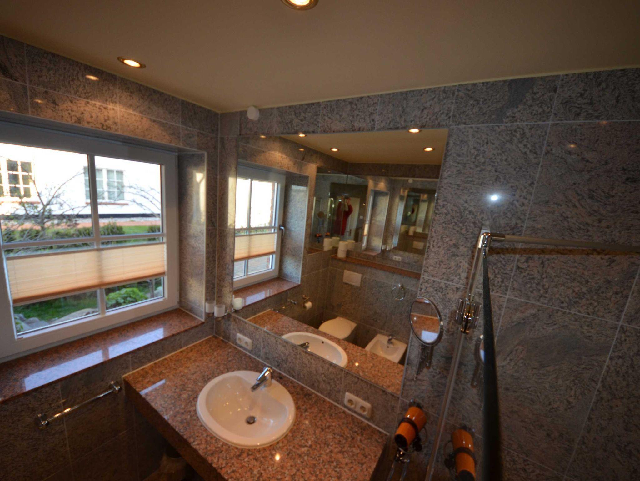 Ein Bad mit Badewanne (mit Glas-Duschabtrennung), Toilette und Bidet. Zweites Bad mit Duschbad, Granitverkleidung, Fußbodenheizung, Granit - Abdeckungen, große Spiegel, schöne Sanitärausstattung, Einbau-Waschbecken, beheizbarer Handtuchhalter, Fön, Schminkspiegel, dekorative Beleuchtung.