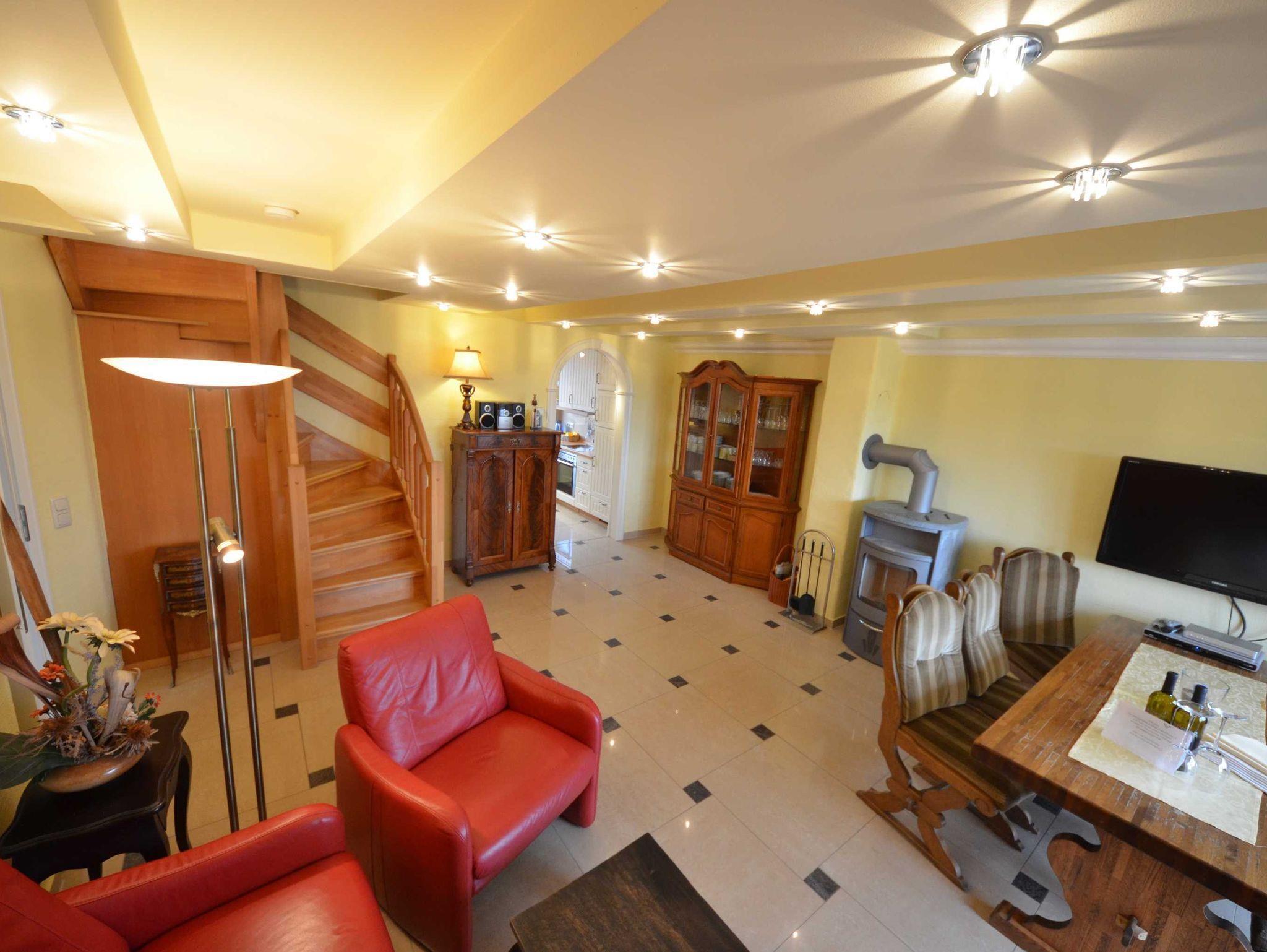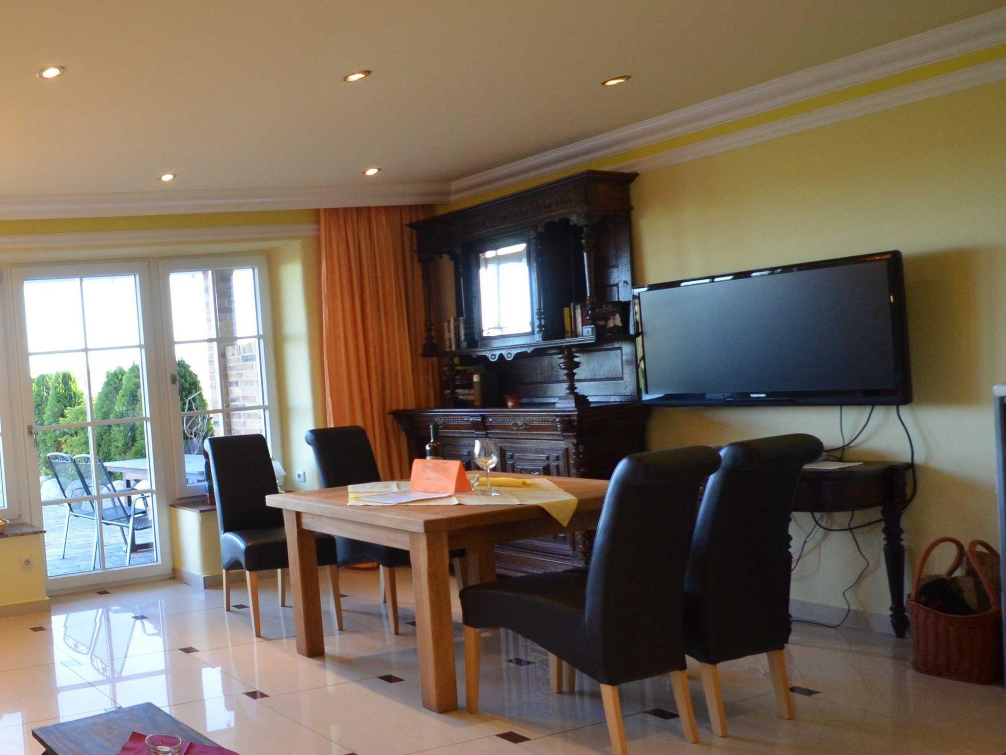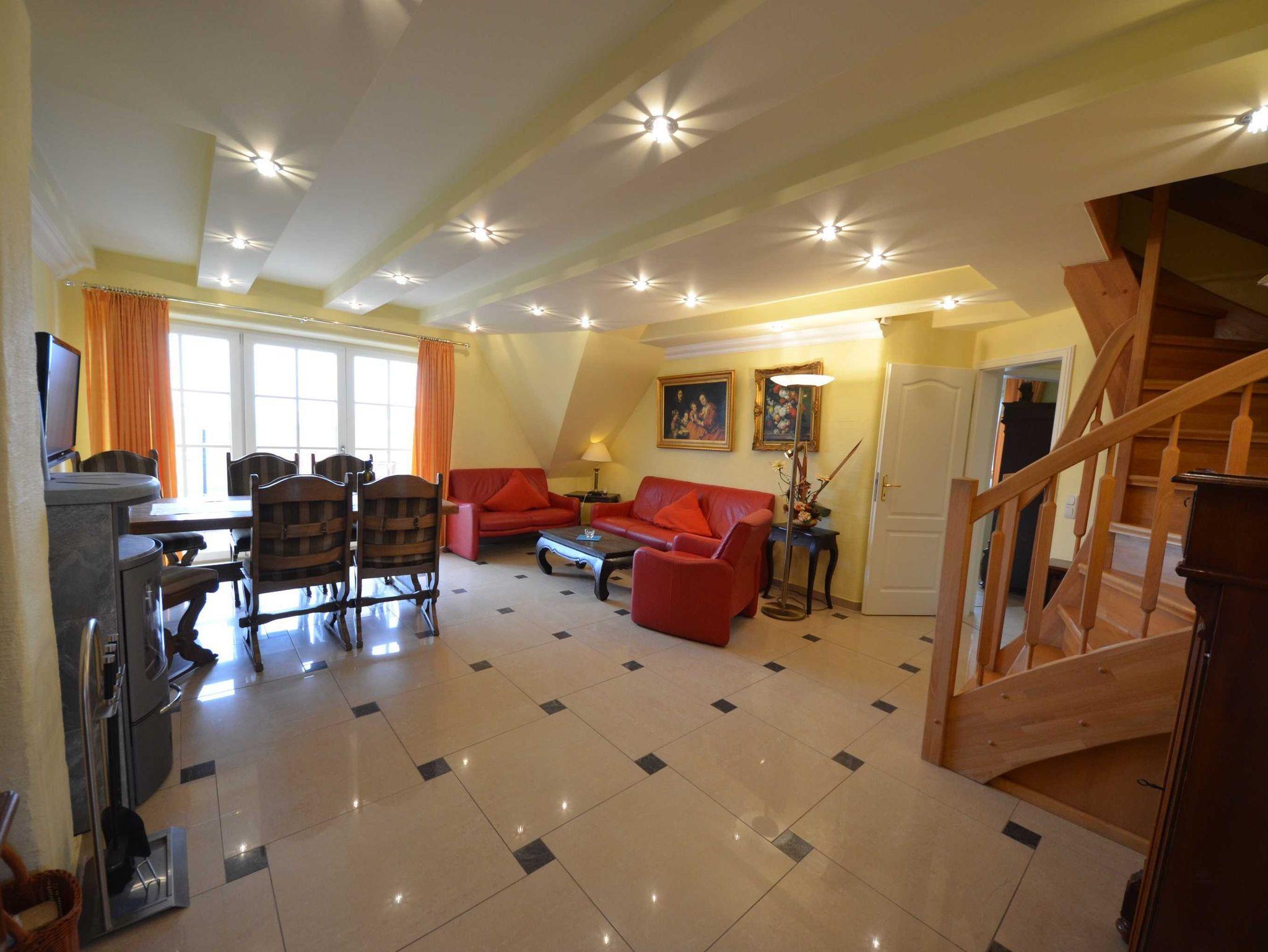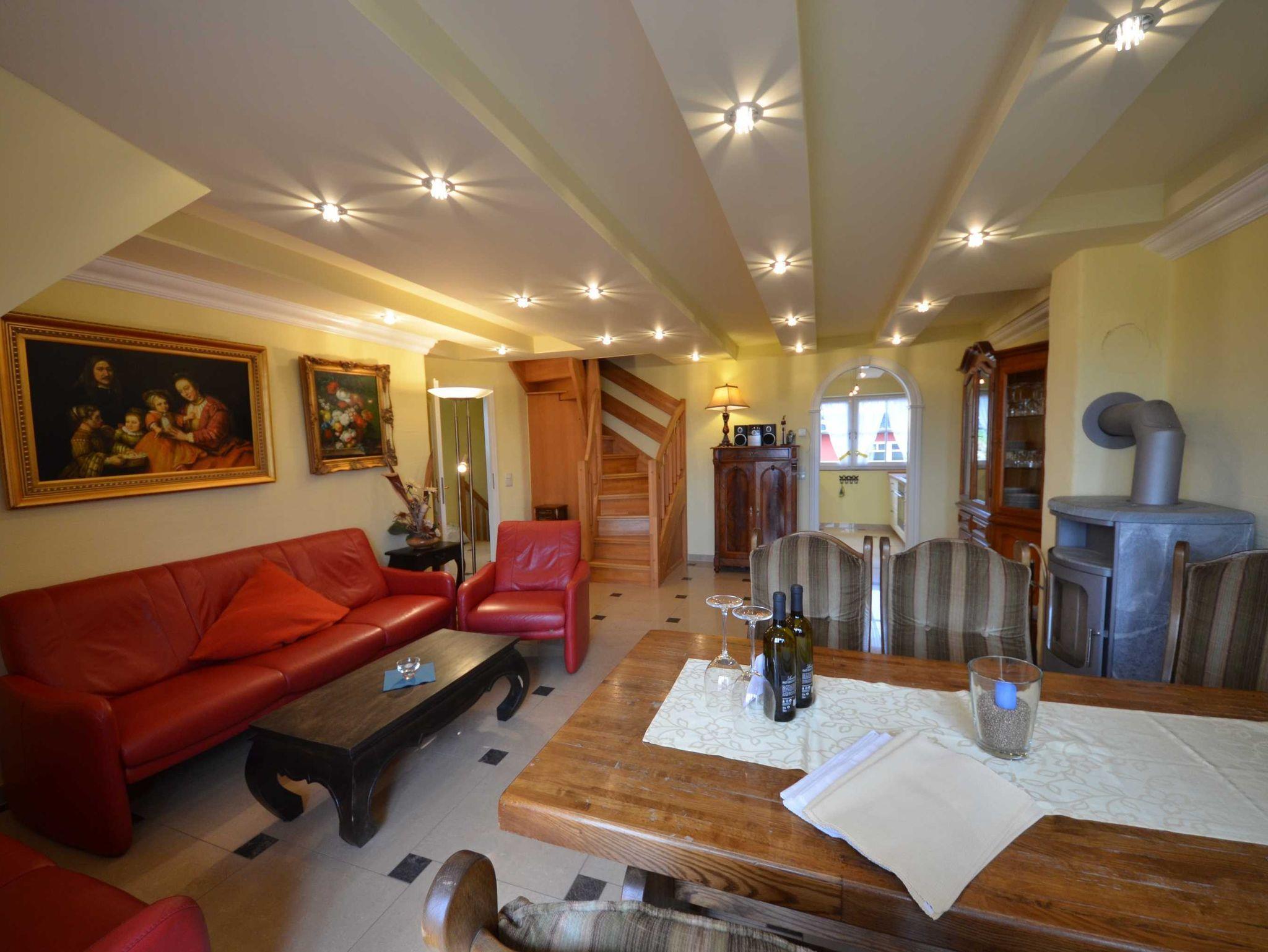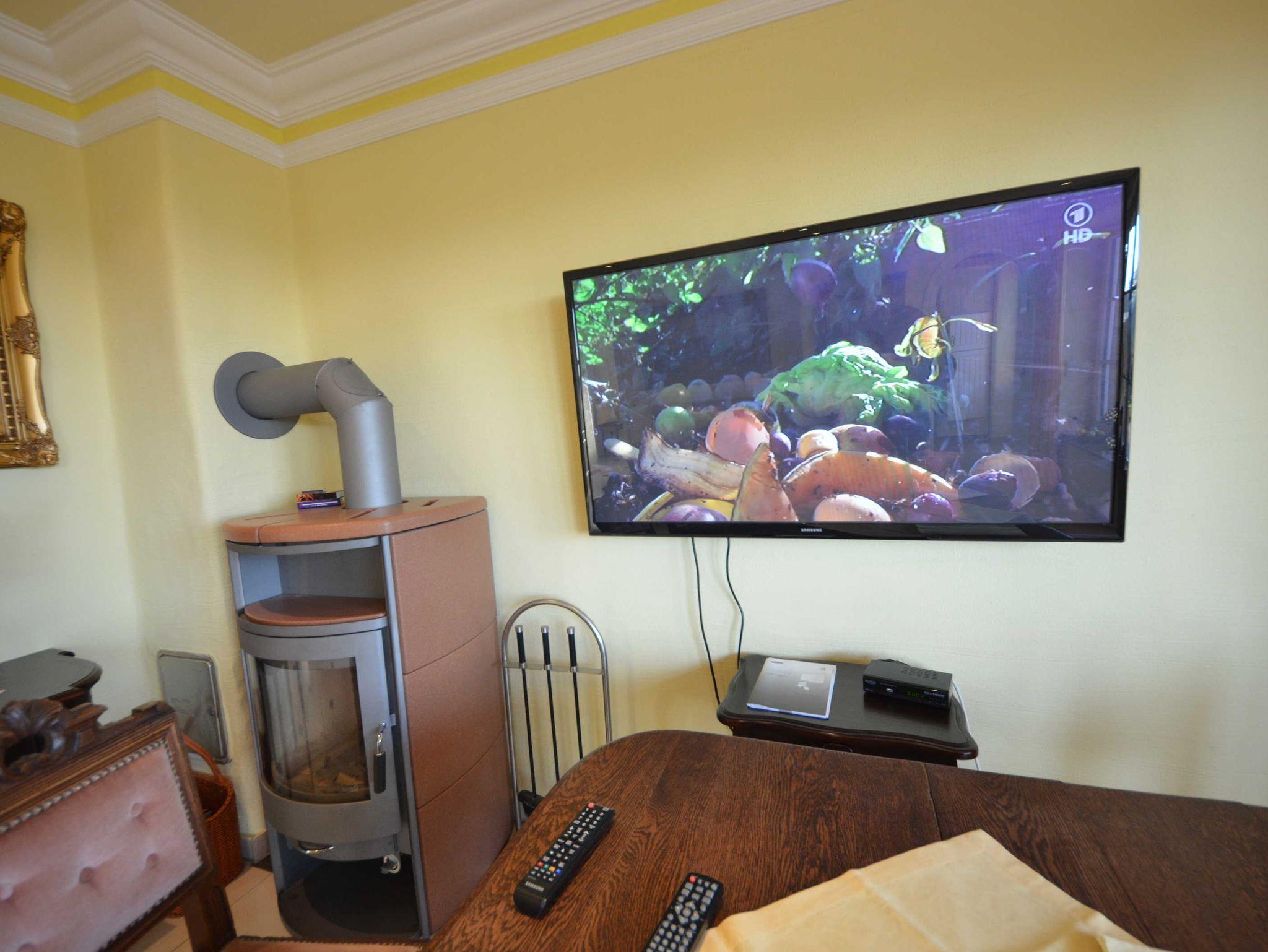 Hark-Kaminofen, antike Vitrinen, kleine Bücherauswahl, Plasma-TV mit 125 cm Großbild, Fußbodenheizung, DVD-Recorder, Stereoanlage, CD-Player, Kinderhochstuhl, Wände dekoriert mit Spiegeln und Gemälden, sehr ansprechende