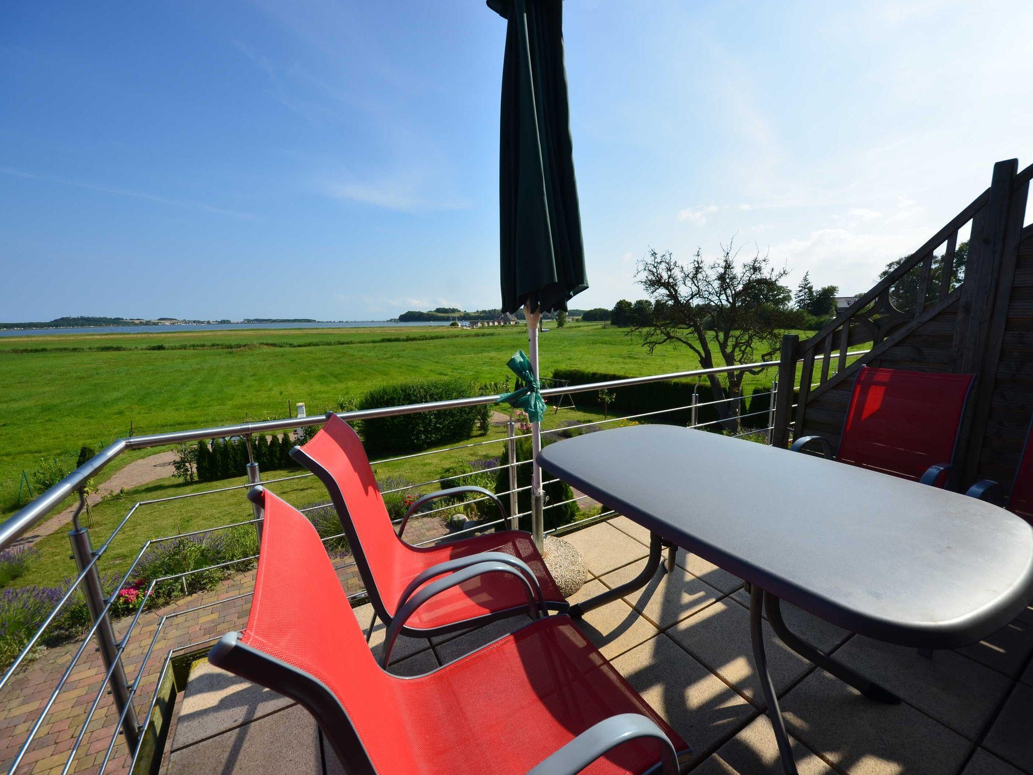 im EG jeweils eine große 80 m² Süd-Terrasse. Im OG schöner Balkon und Garten mit Obstbäumen zum Meer mit Gartenmöbel, Außengrill und Kinderschaukel. Der Garten kann von der Ferienwohnung im EG und OG genutzt werden.