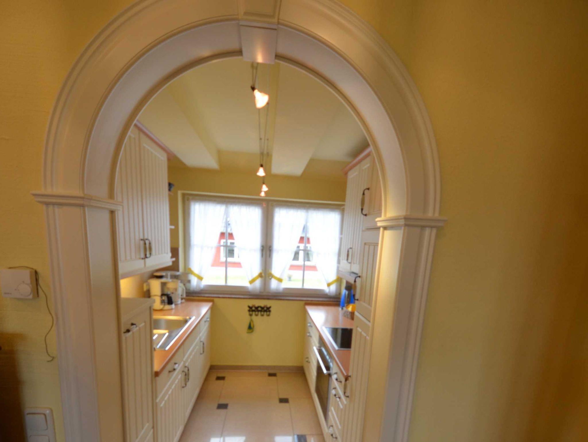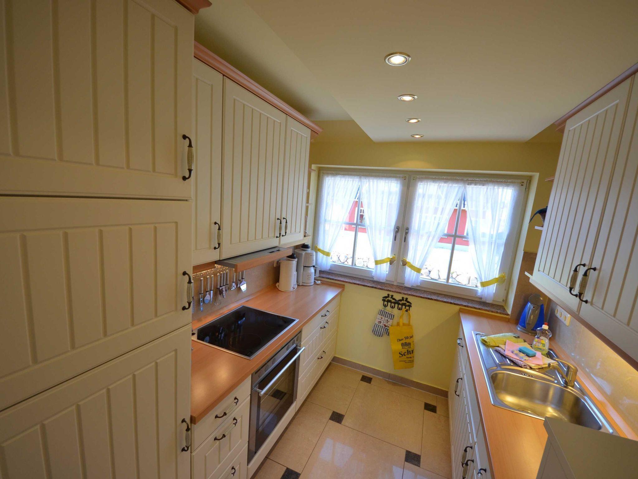 Sehr dekorative Landhaus-Einbauküche in vanillegelb, Geschirrspüler höher gelegt, Mikrowelle, Herd mit Cerankochfeld und Backofen, Flachschirm-Dunstabzugshaube, großer Kühlschrank mit 38 LGefrierteil, zwei Kaffeemaschinen, Wasserkocher, Eierkocher, Toaster, Waffeleisen, Mixer, ausreichend Edelstahltöpfe Schnellkochtopf, Gewürze, sehr schönes Geschirr, Auswahl an Gläsern.