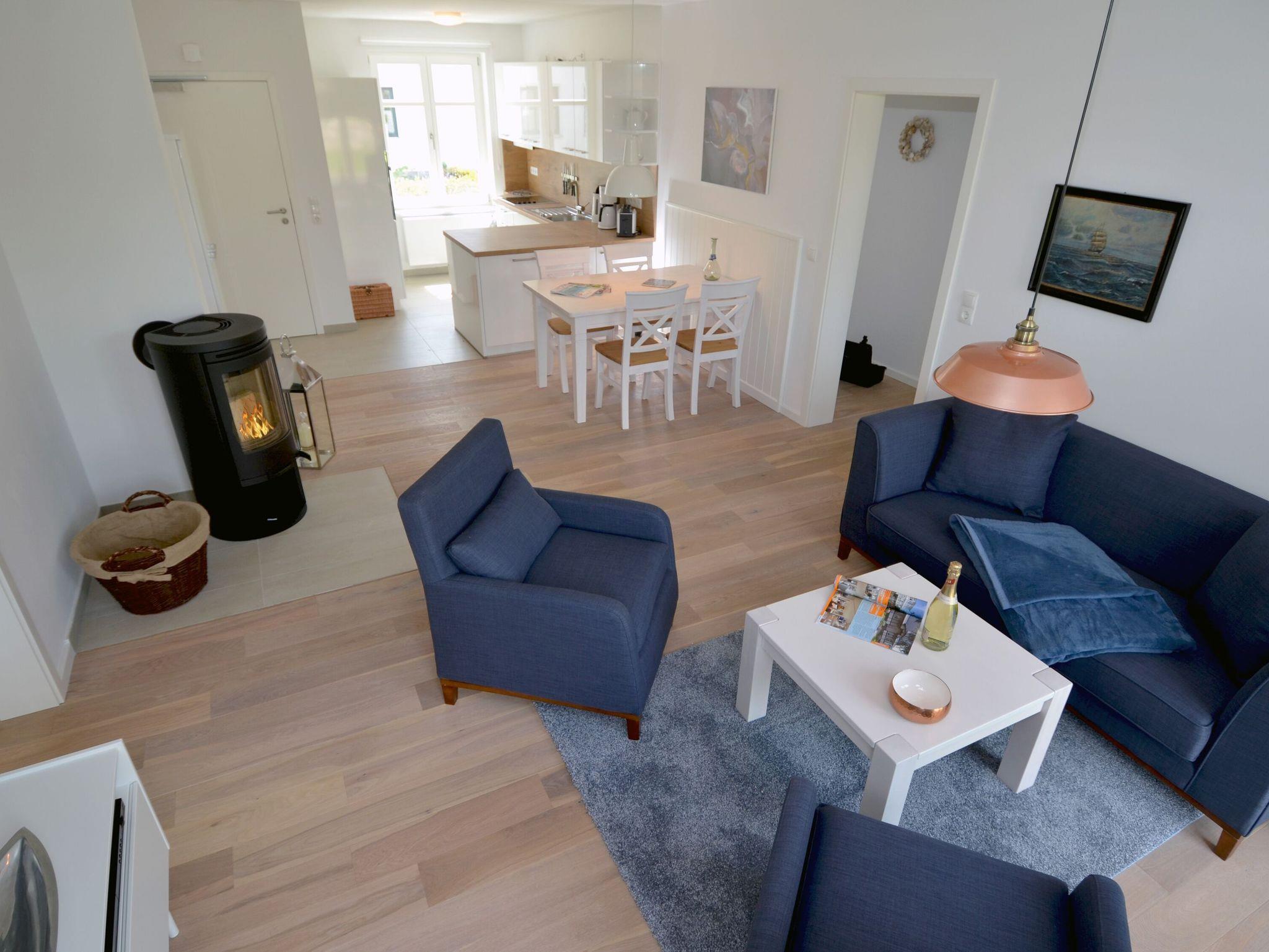 Eine bequeme Couchecke lädt zu gemütlichen Stunden vor dem Kaminofen ein. Zum technischen Equipment gehören u.a. ein QLED-Smart-TV mit riesigen 50 Zoll Bilddiagonale, ein DVD-Player sowie eine Musikanlage mit Radio/CD-Player/Bluetooth-Schnittstelle und USB-Anschluss. Superschnelles W-LAN (Glasfaser-Anschluss mit bis zu 250 Mbit/s) ist kostenfrei verfügbar.
