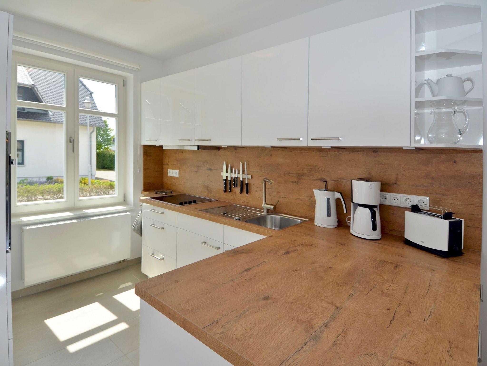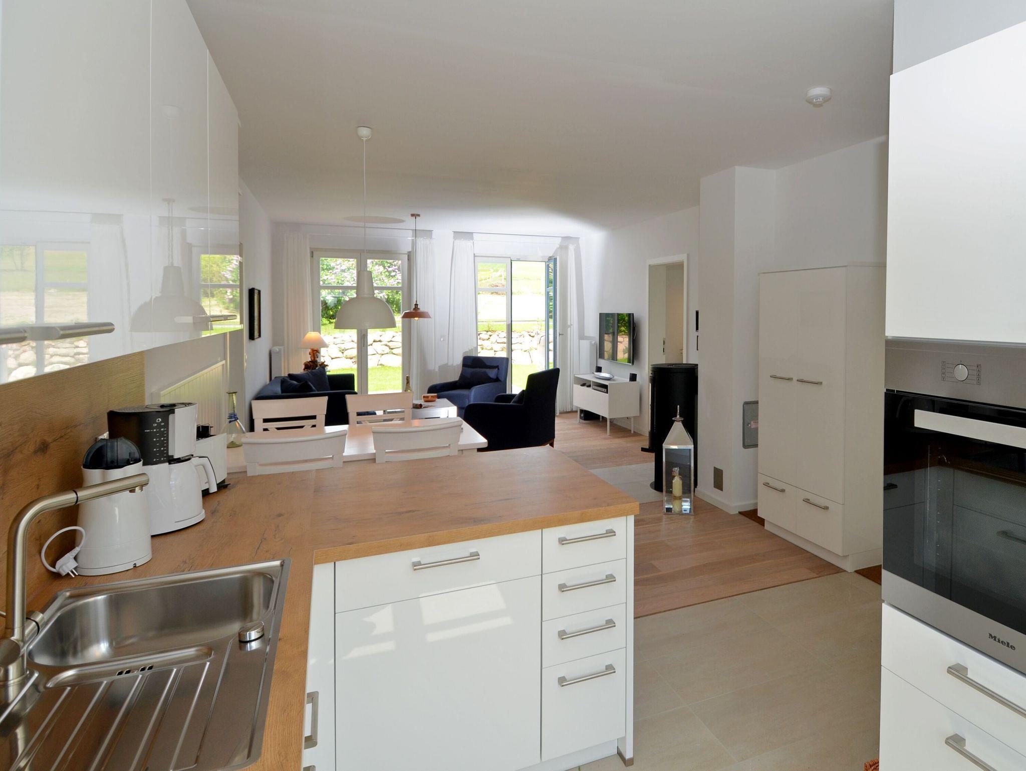 Die im skandinavischen Landhausstil gestaltete offene Küche mit Esstisch verfügt neben diversem Kleininventar über einen Miele-Backofen, ein 4-Zonen-Cerankochfeld, einen Geschirrspüler, eine Kühl?/Gefrierkombination, eine Waschmaschine, eine Mikrowelle, eine Kaffeemaschine, einen Toaster und einen Wasserkocher. Während Ihres Aufenthaltes stehen Ihnen darüber hinaus auch Bügelutensilien zur Verfügung.