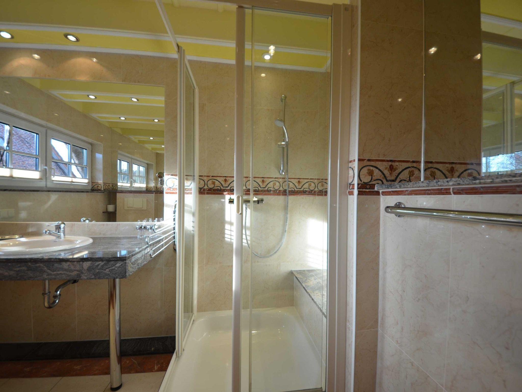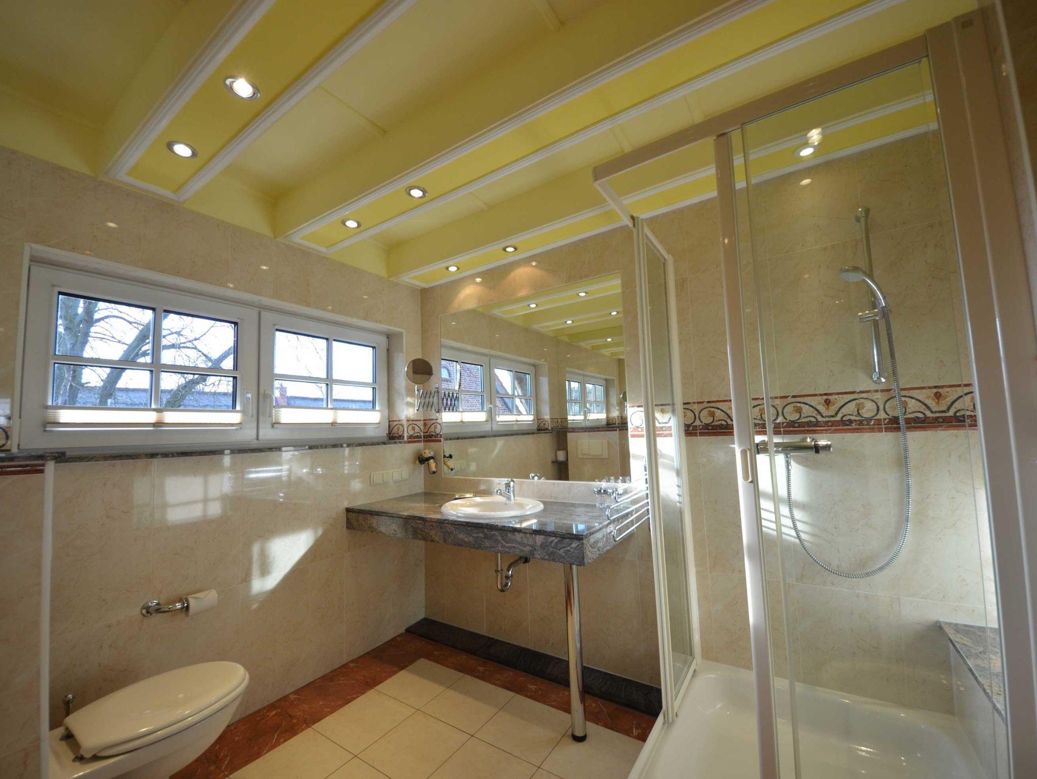 Fußbodenheizung, Naturstein - Abdeckungen, große Spiegel, schöne