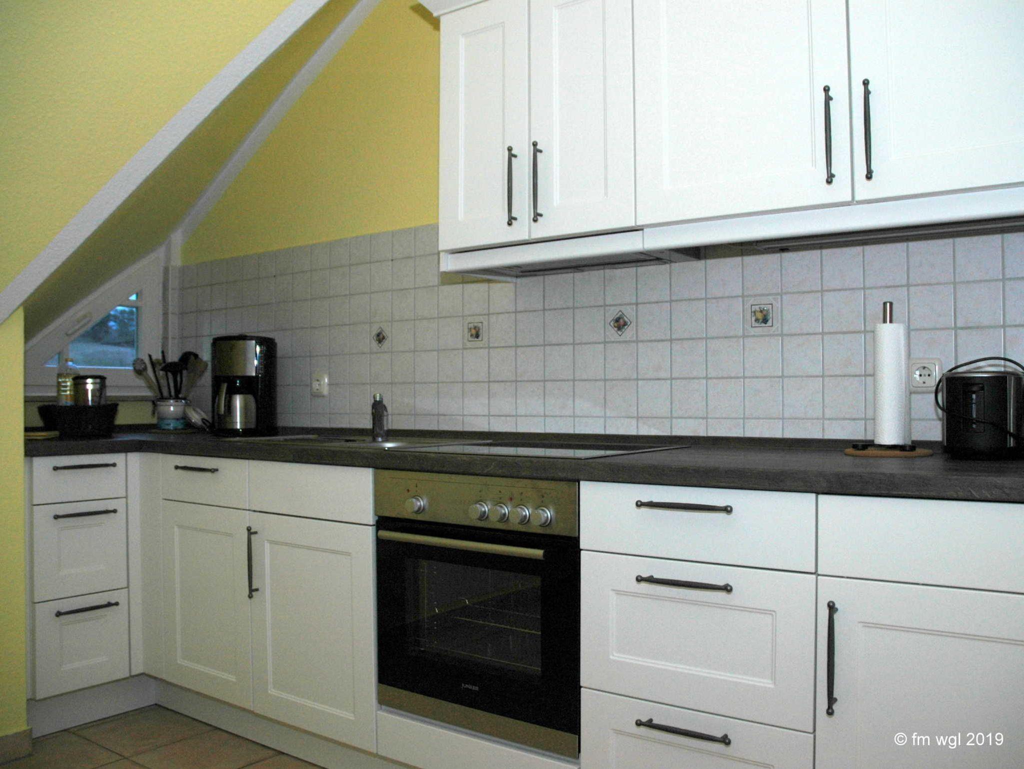 Die offene Küche mit Essbereich für bis zu 6 Personen ist komplett ausgestattet mit einem kleinen Geschirrspüler, Kühlschrank mit Gefrierfach, Backofen und Ceranfeld. Diverse Küchenutensilien sowie Wasserkocher, Toaster, Kaffeemaschine runden die Küchenausstattung ab.
