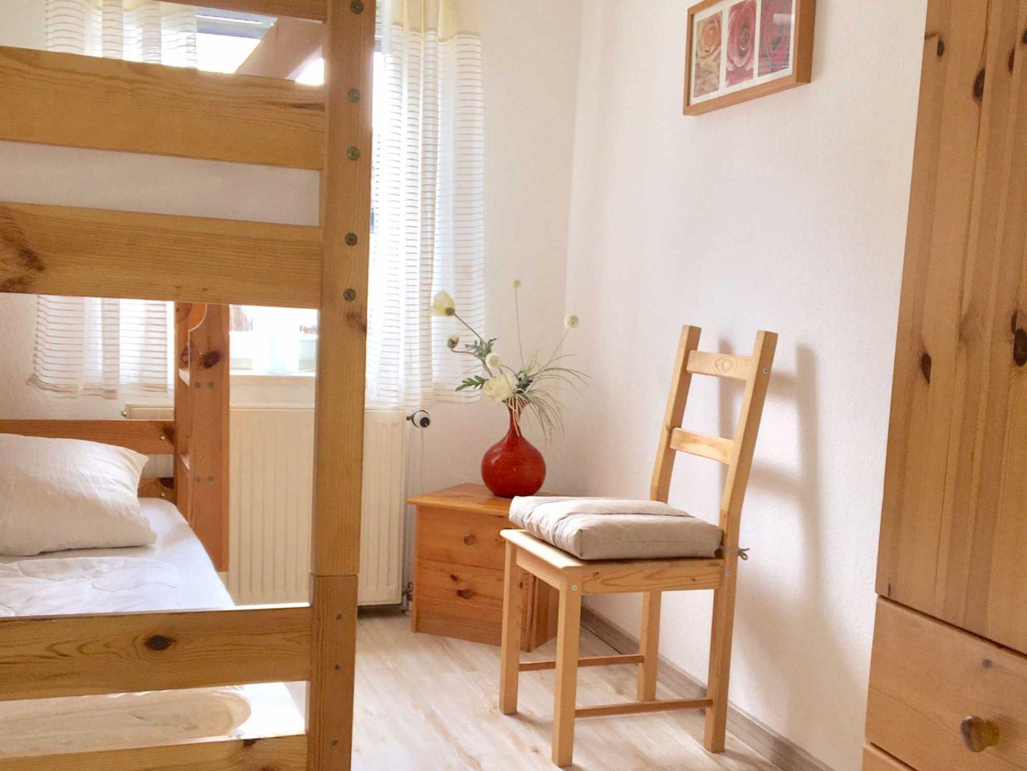 1 Schlafraum mit Etagen-Bett für 2 Personen, Kleiderschrank und Sitzgelegenheit.