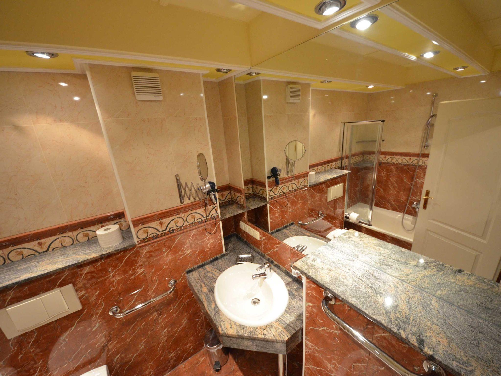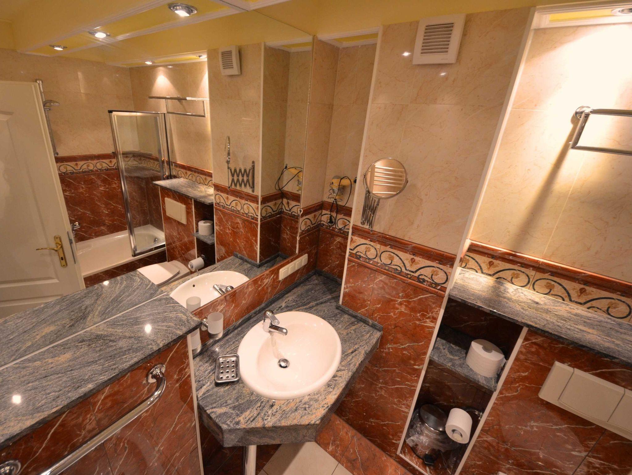 Bad mit Dusche aus Naturstein / Granit, große Spiegel, beheizbarer Handtuchhalter, Fön und Schminkspiegel