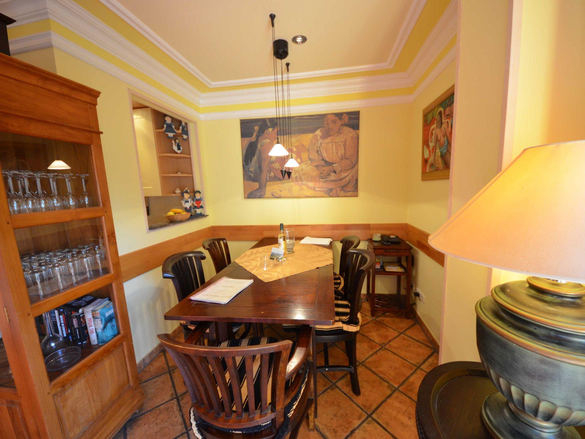 2 Bäder, Fußbodenheizung, schön eingerichtetes Wohn- Esszimmer, Couchgarnitur mit Leder bezogen, Opiumtisch, Speisetafel mit Stühlen, Geschirrschrank, Sat - TV, Telefon, Spiegel pp.