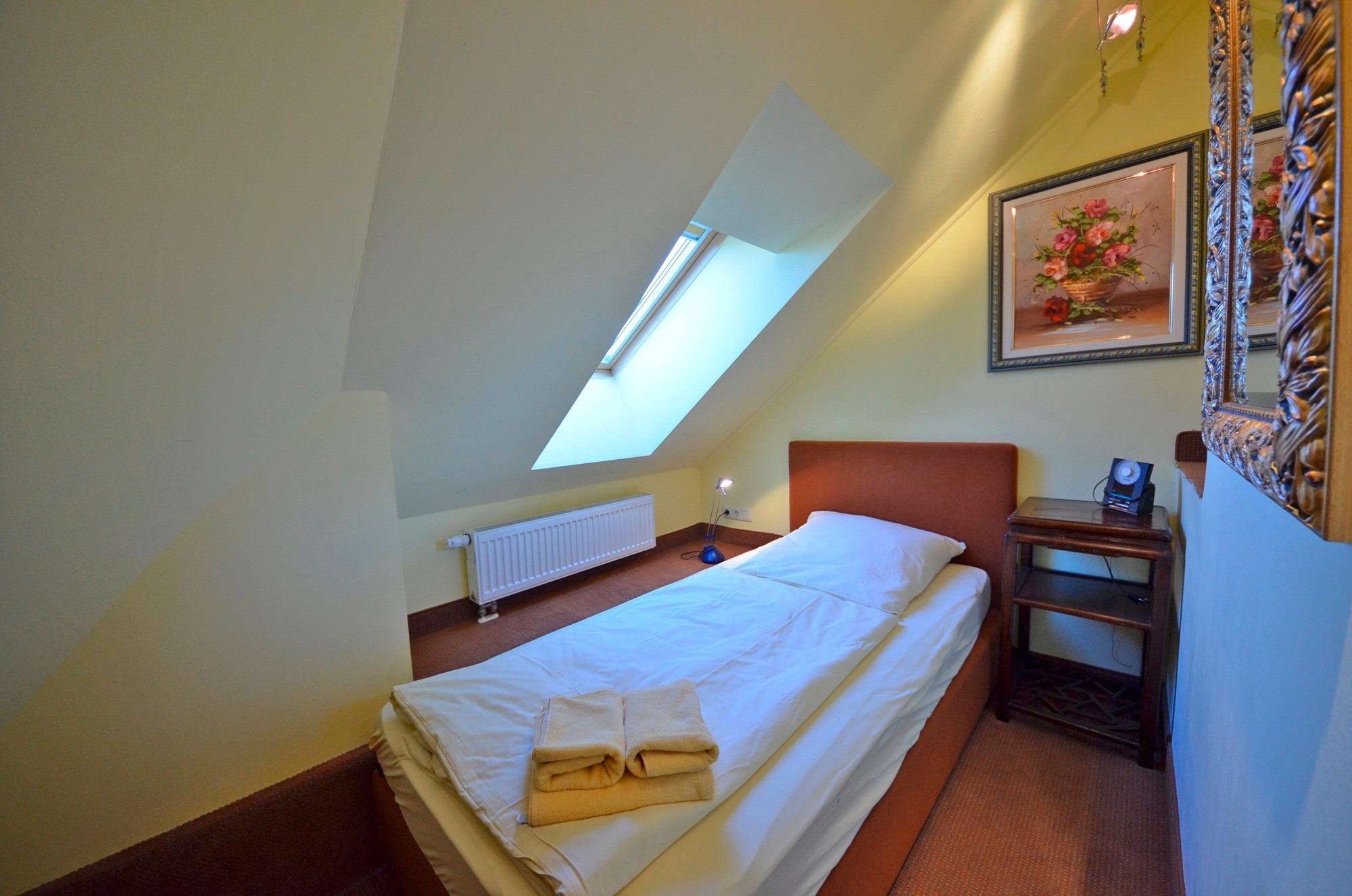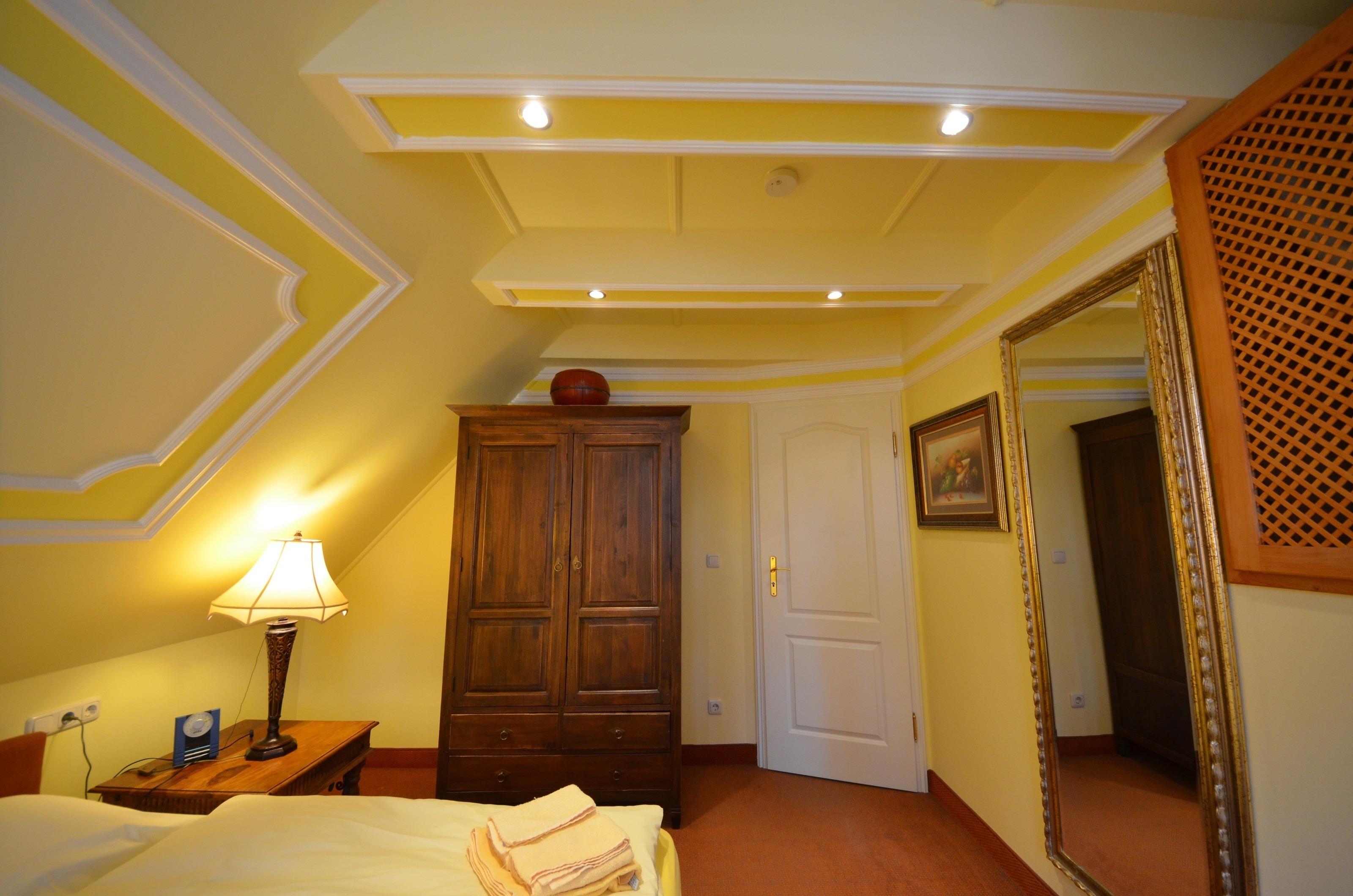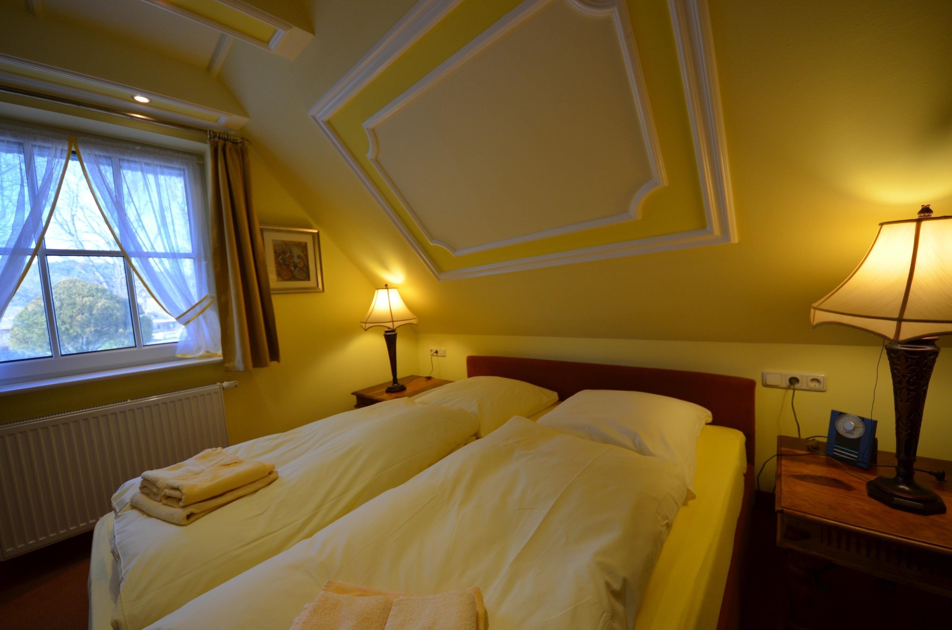 2 kleine, schräge aber gemütliche und helle Zimmer mit Einbauschränken, einmal mit Einzelbett 90 x 200 und einmal mit einem Doppelbett 160 x 200 cm. Bettwäsche aufgezogen.