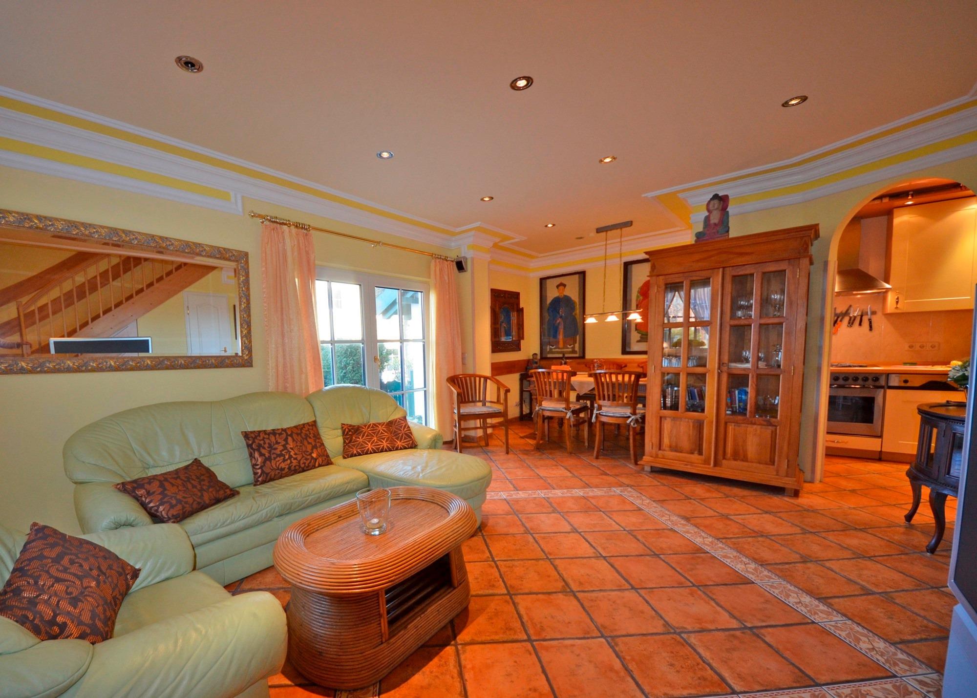 Eingangsflur mit Garderobe und Schuhschrank. Fußbodenheizung, großzügiges Wohn- Esszimmer, schöne Couchgarnitur mit Opiumtisch, Esstisch mit 5 Stühlen, Geschirrschrank, Satt - TV mit 82-106 cm Großbild mit ca.40 Programmen, Stereoanlage, CD - Player, Telefontisch mit Telefon und balinesischem Spiegel pp. Kinderhochstuhl, Wände dekoriert mit Bildern, Ausgang zur Terrasse