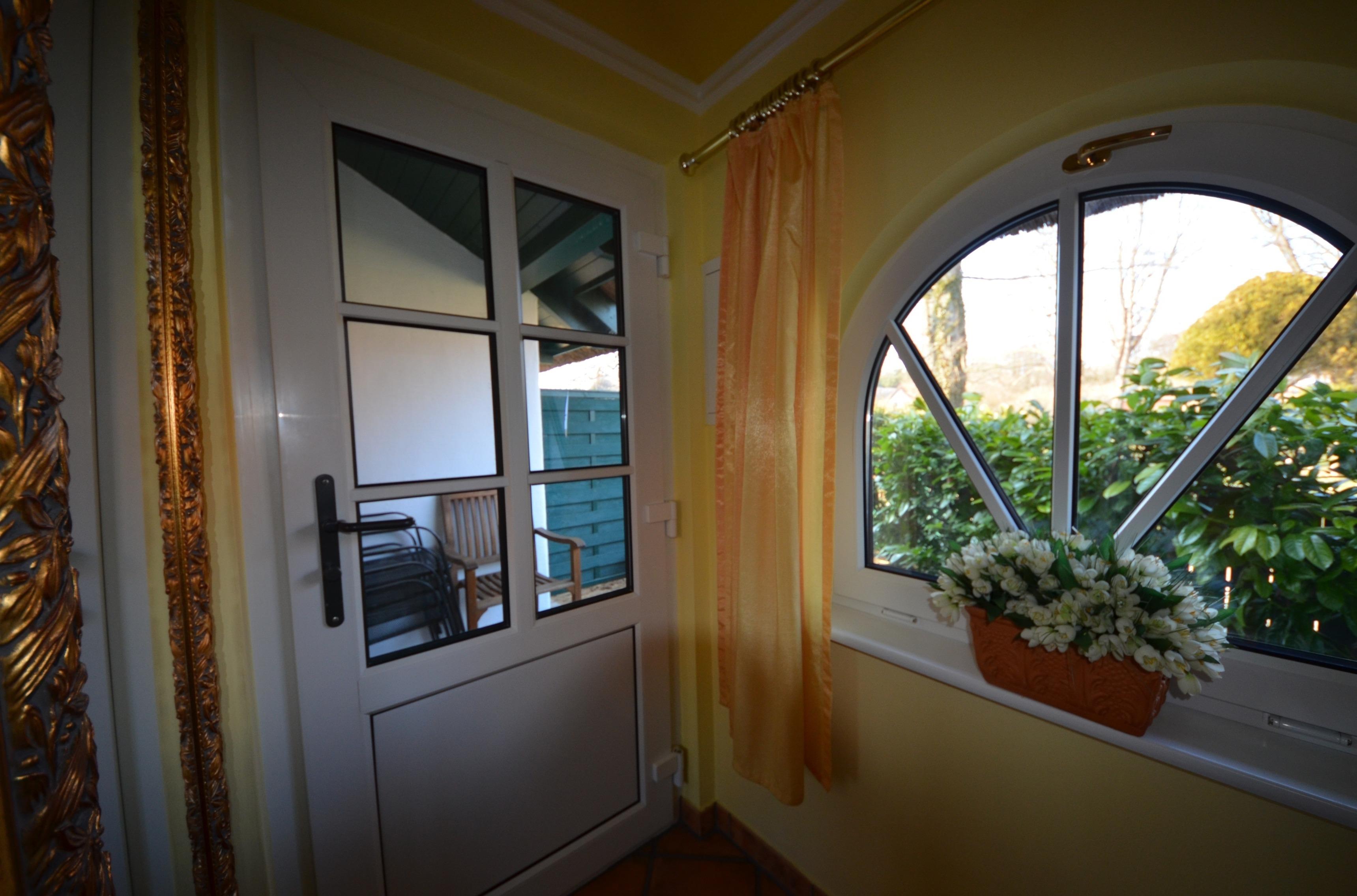 Wohnzimmer mit Eßbereich und Ausgang zur Terrasse und Garten. 1 kleines Duschbad, Abstellraum, Küche.
