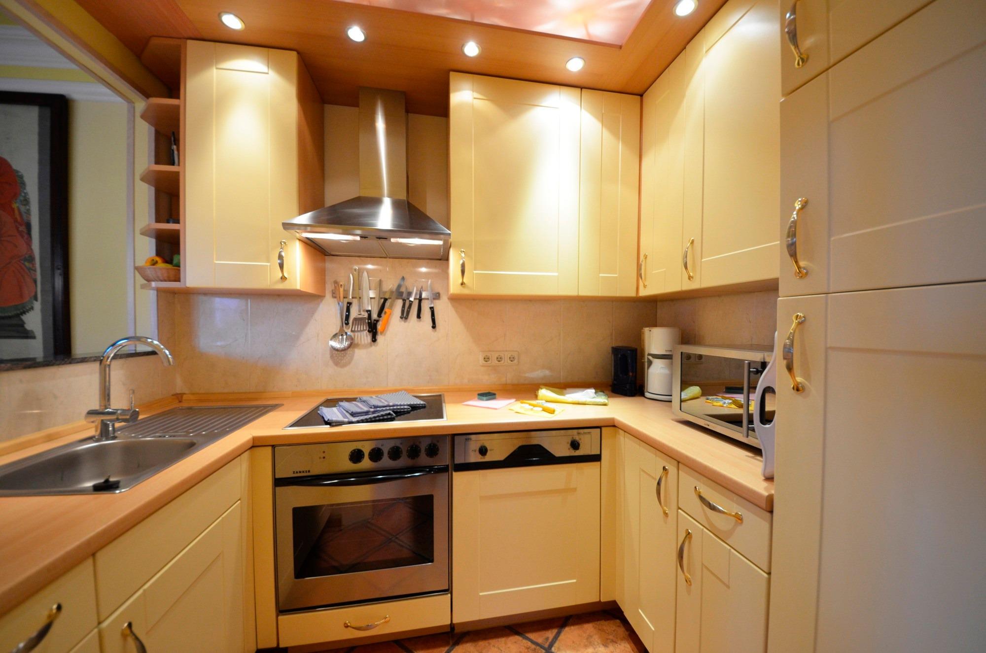Schöne vanillefarbene Landhaus-Einbauküche, Geschirrspüler, Mikrowelle, Herd mit Ceran - Kochfeld und Backofen, Turmhaube, Kühlschrank mit Gefrierfach, 2 Kaffeemaschinen, Wasserkocher, Eierkocher, Toaster, Waffeleisen, Mixer, Schnellkochtopf, geschmackvolles Geschirr. Teilweise Gewürze und Geschirrtücher.